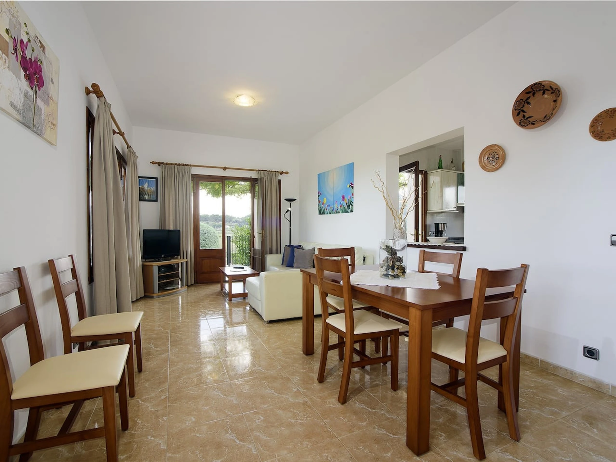 Bright living-dining room with satellite TV