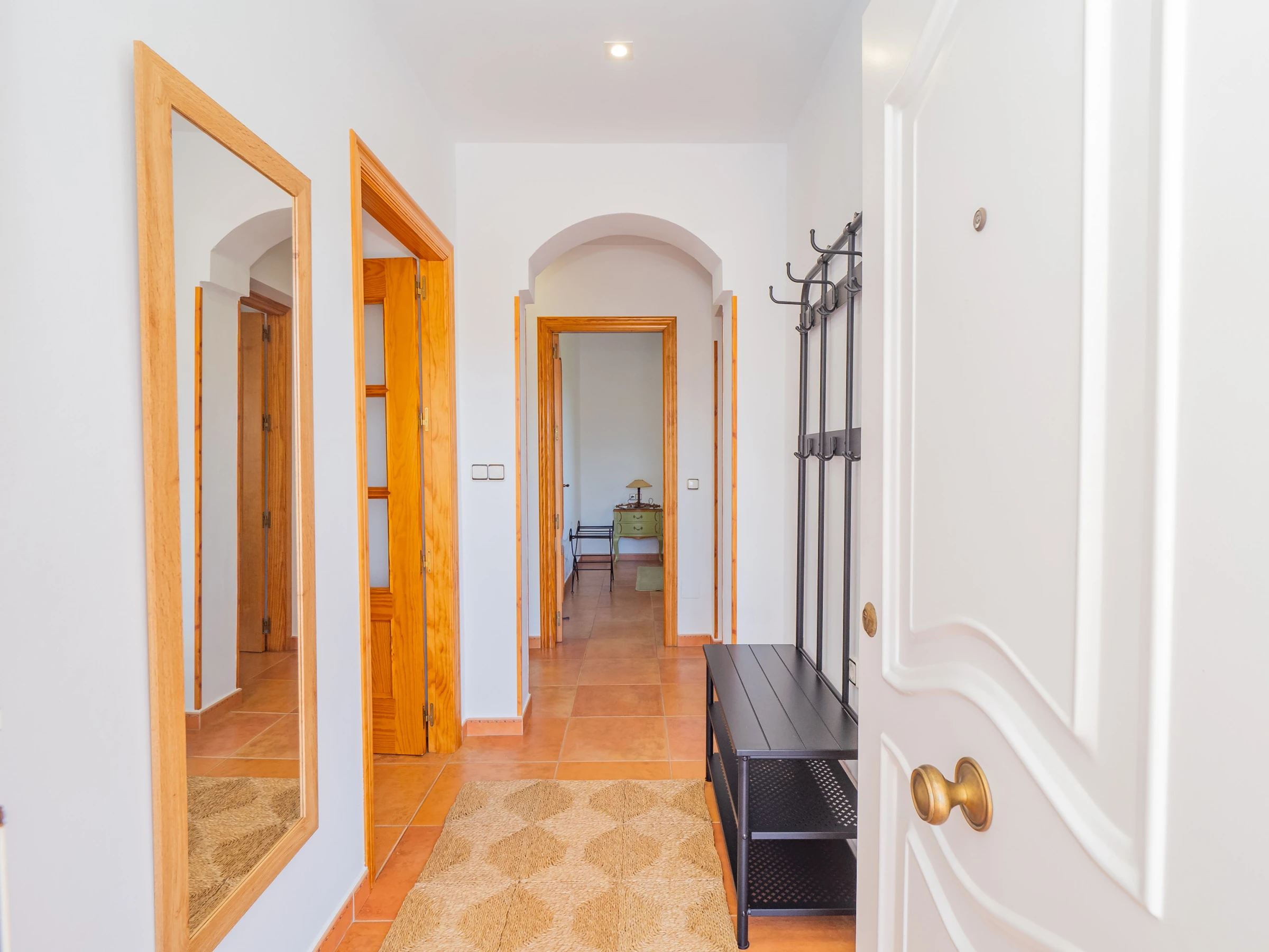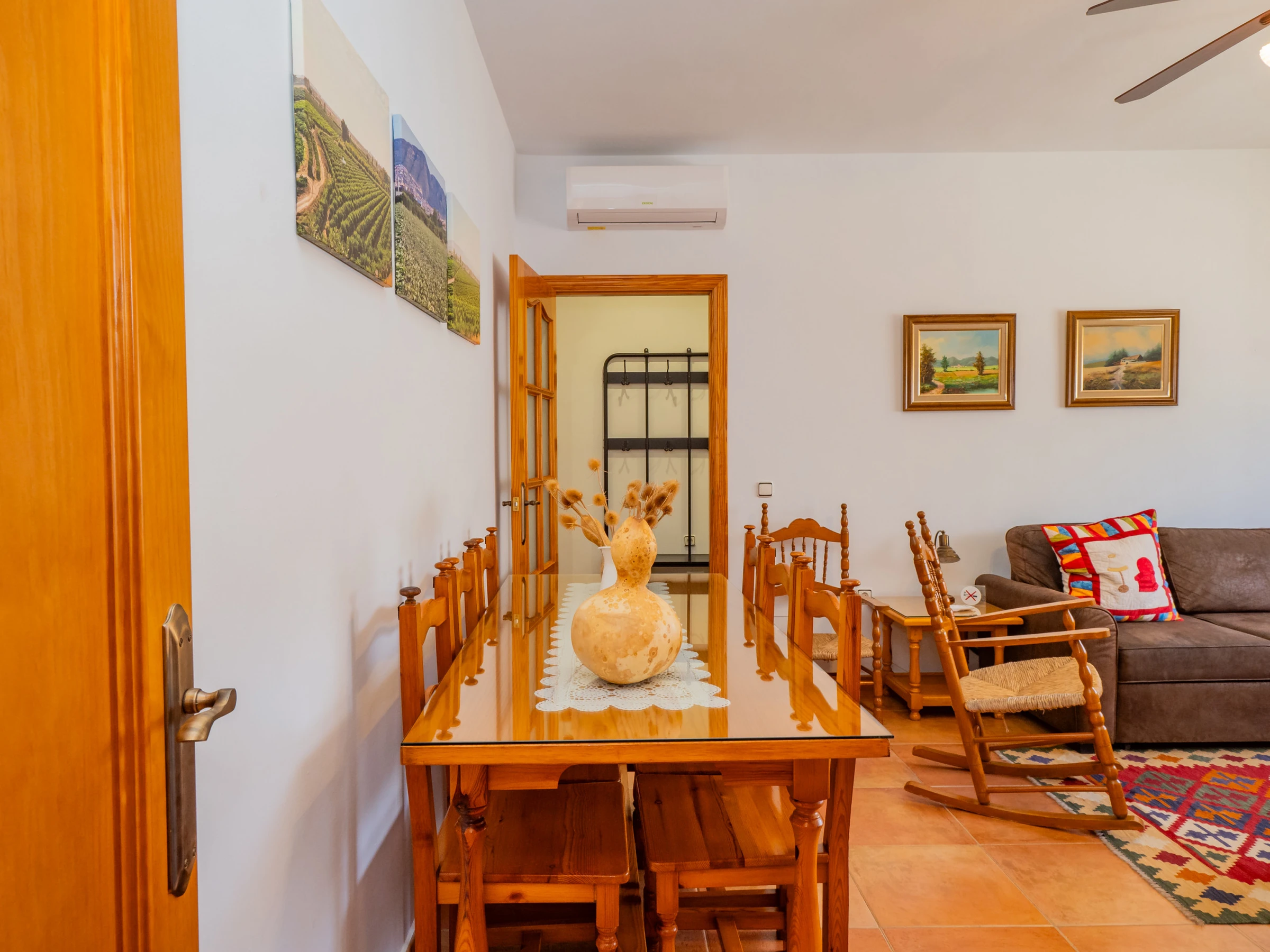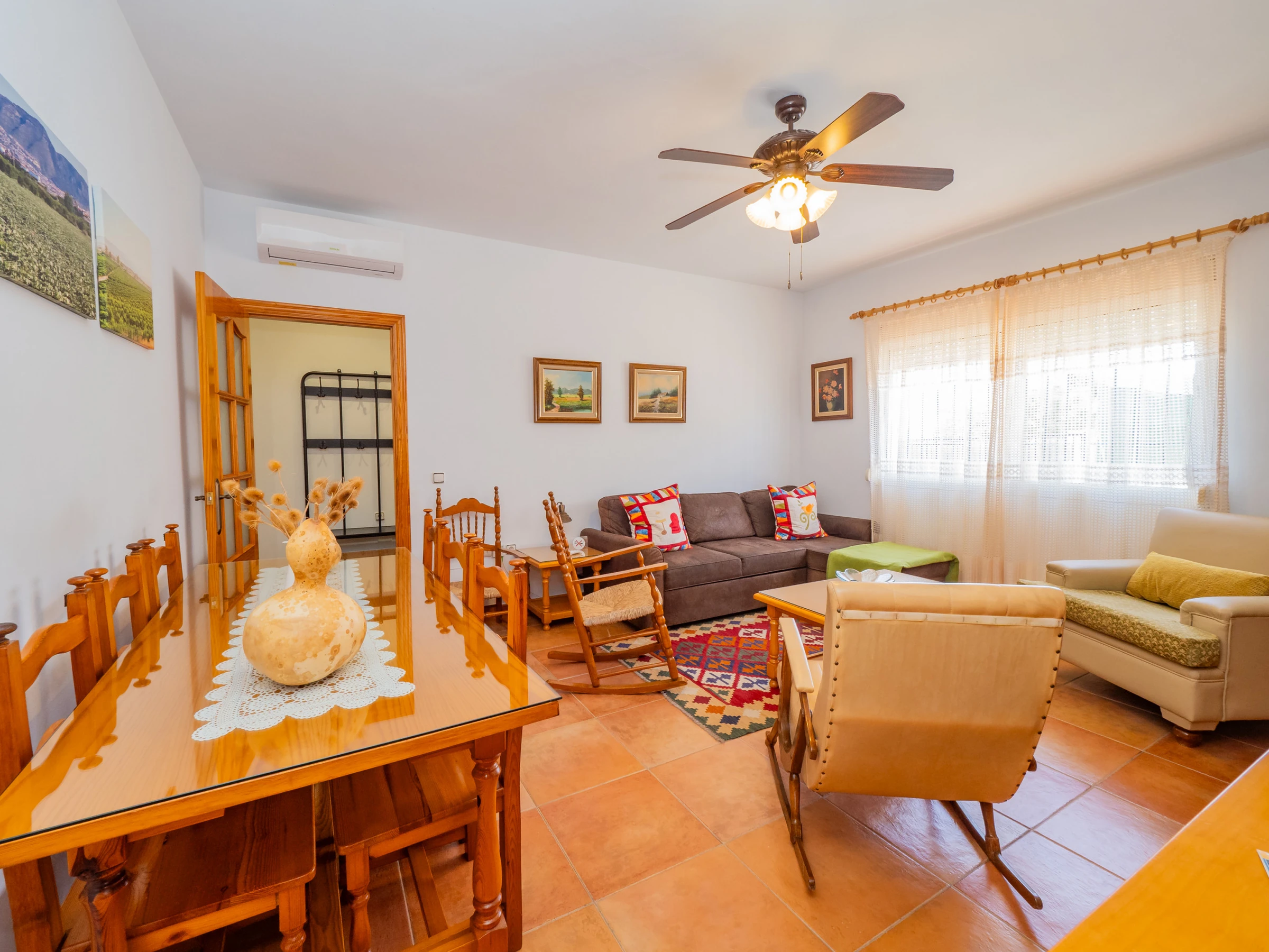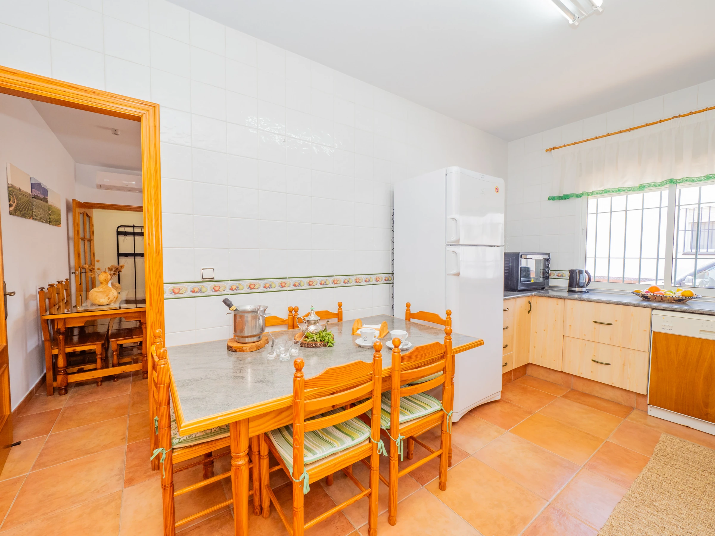 The house has a lovely terrace facing the main street, perfect for relaxing, working with a laptop or enjoying a call in a relaxed environment. Inside, a cosy living-dining room with sofa bed and television connects to a fully equipped independent kitchen: fridge, microwave, oven, dishwasher, coffee maker and more, so you can prepare your favourite dishes without complications.