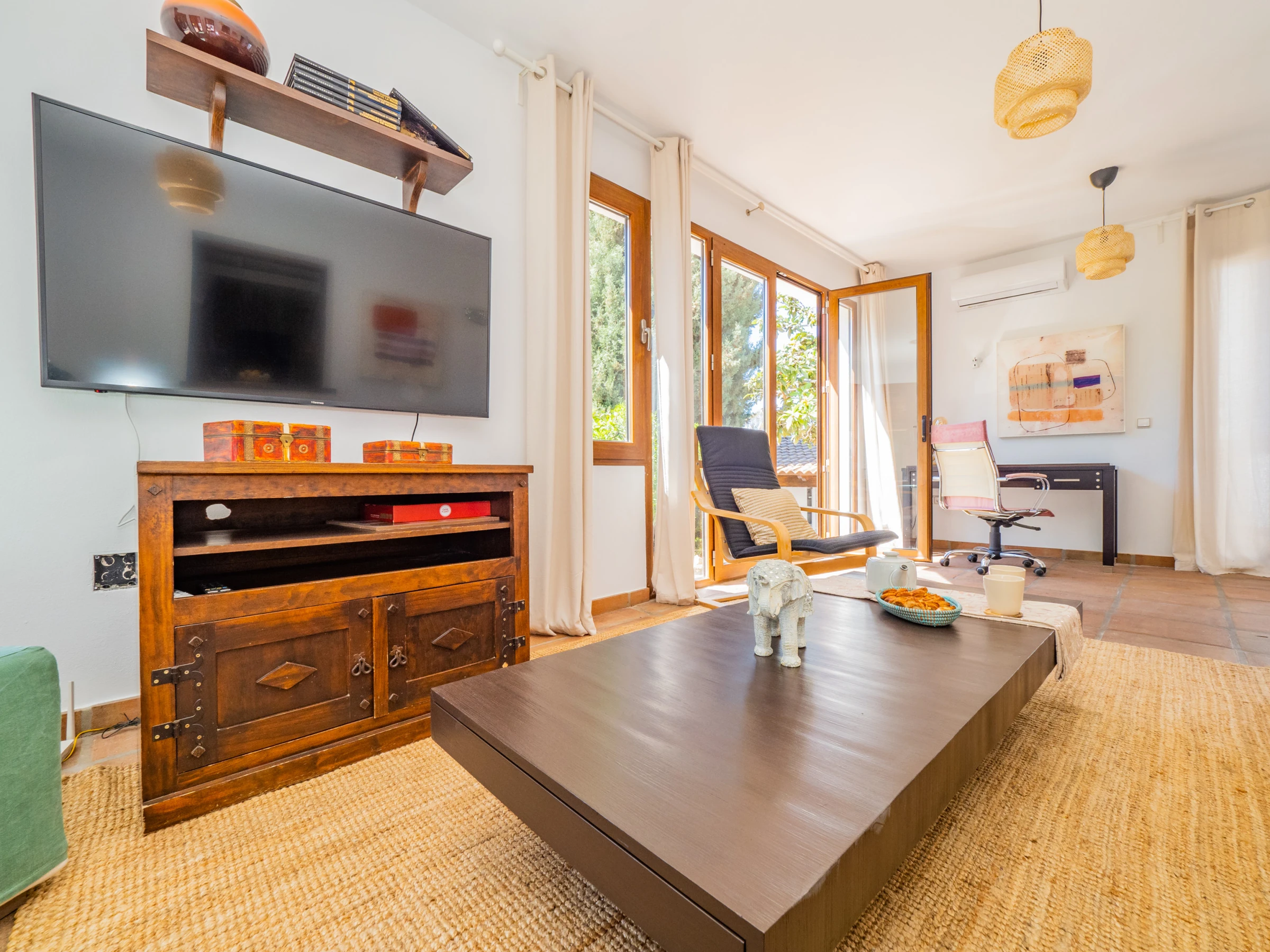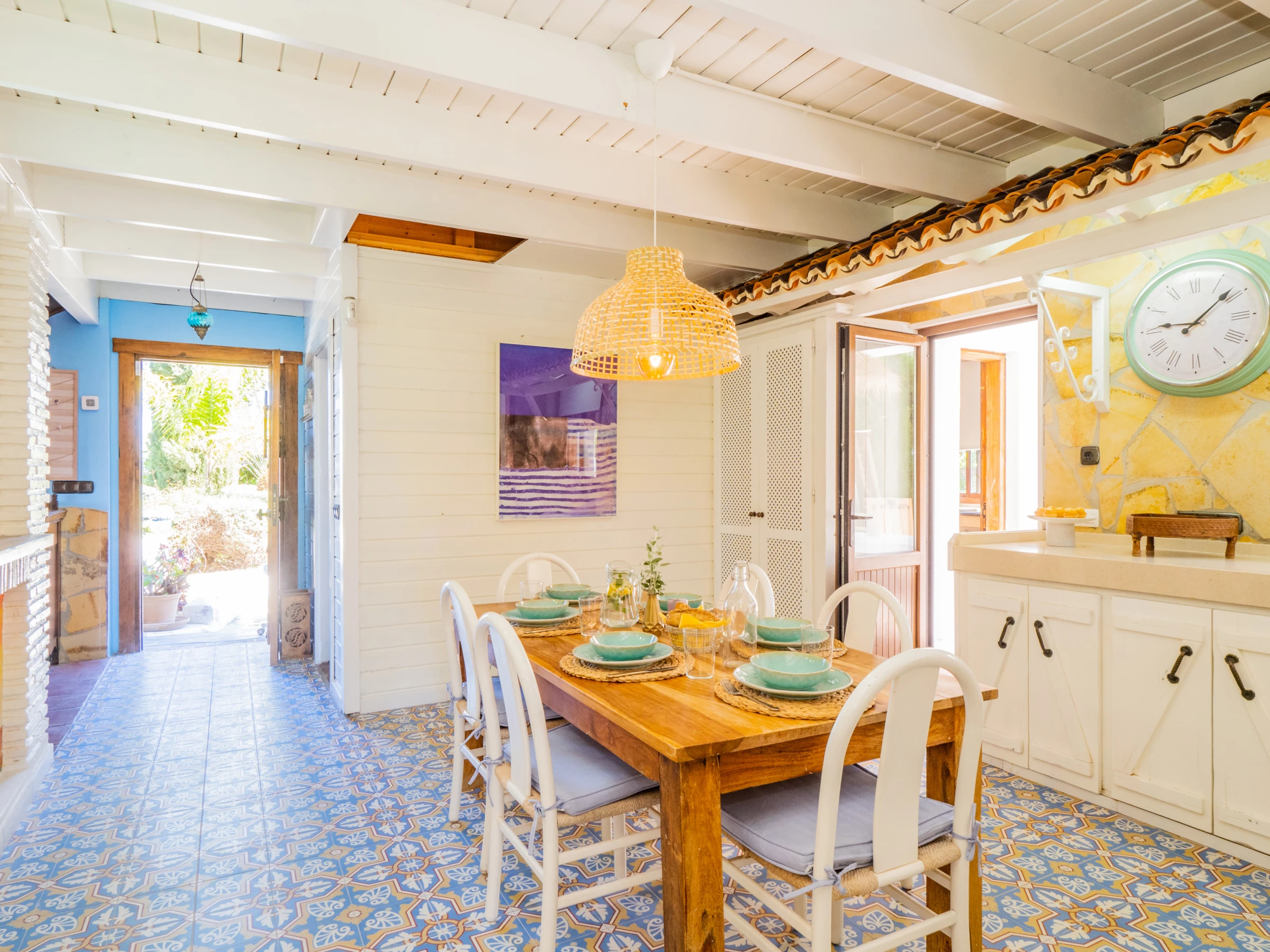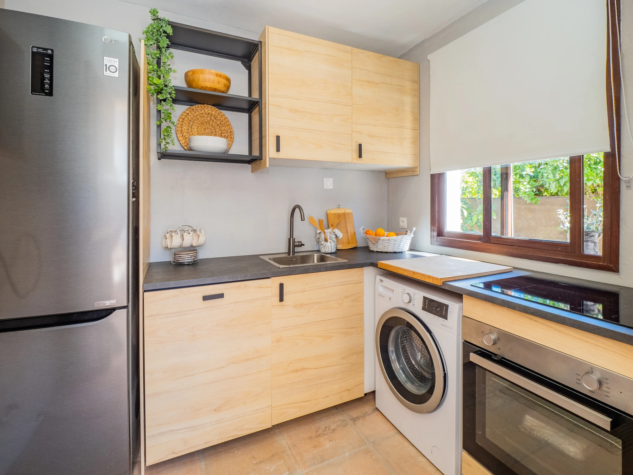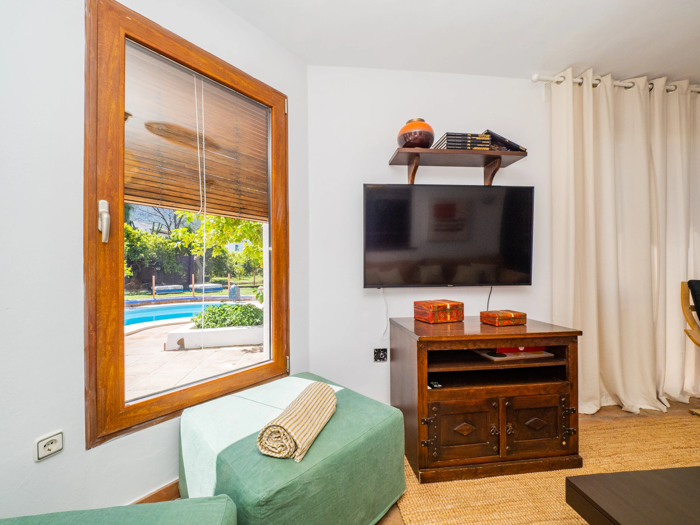Inside the house, the ground floor houses a spacious fully equipped kitchen-diner, which connects to the bright living room with Smart TV and views of the garden and swimming pool. This space also includes a teleworking area for those who need to maintain concentration during their stay. On this floor, there is a bedroom with a double bed, wardrobes, and access to a private terrace, as well as a bathroom with a shower tray.