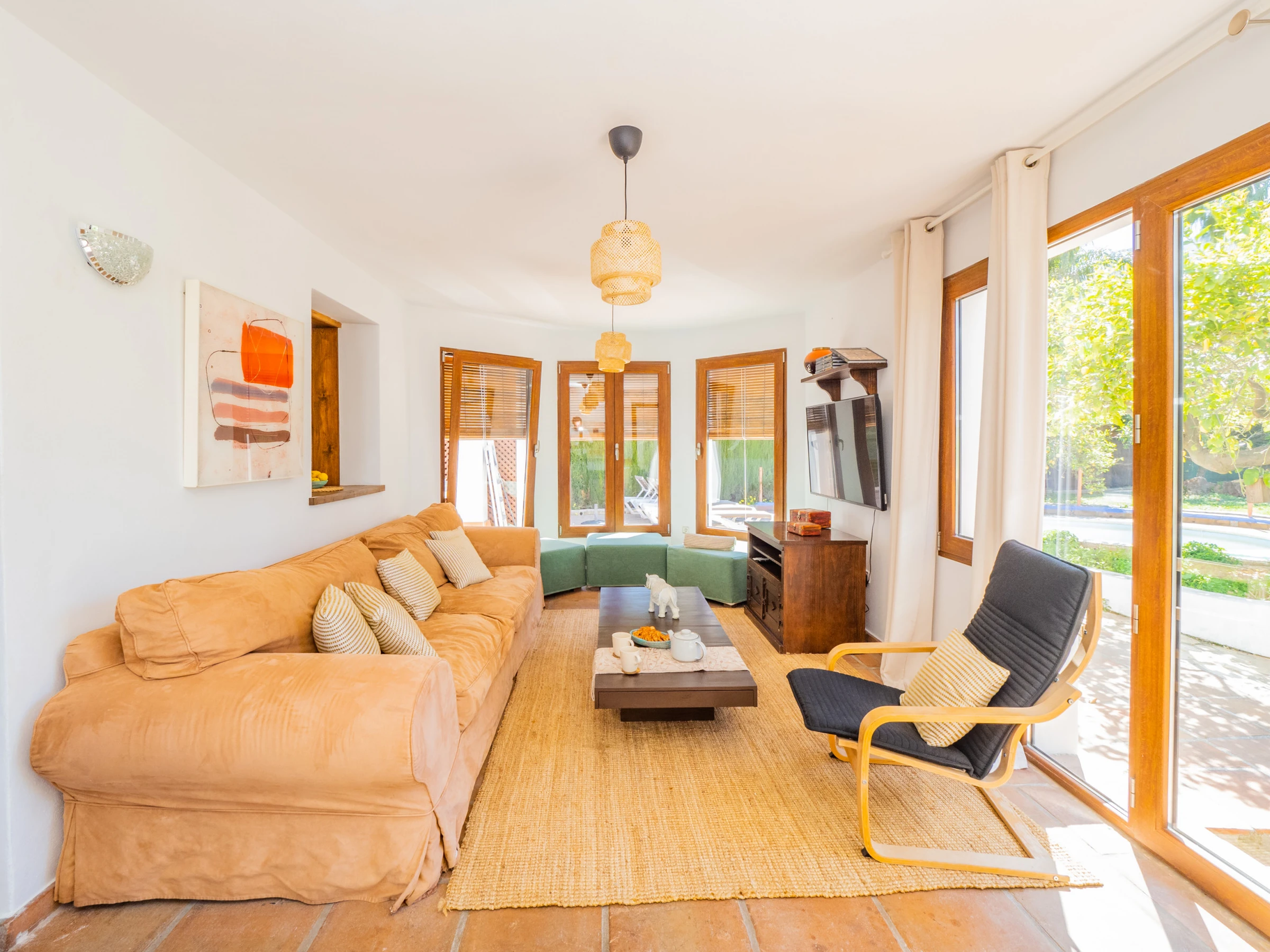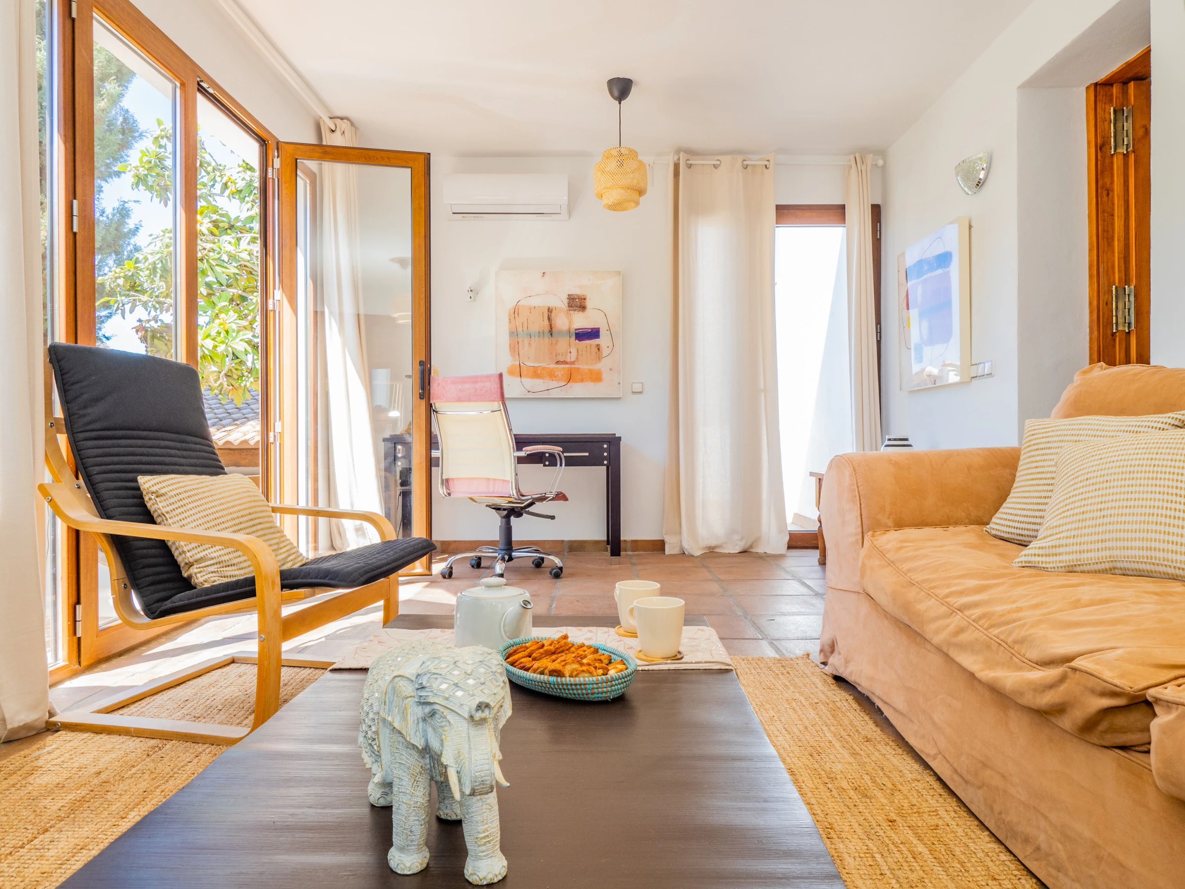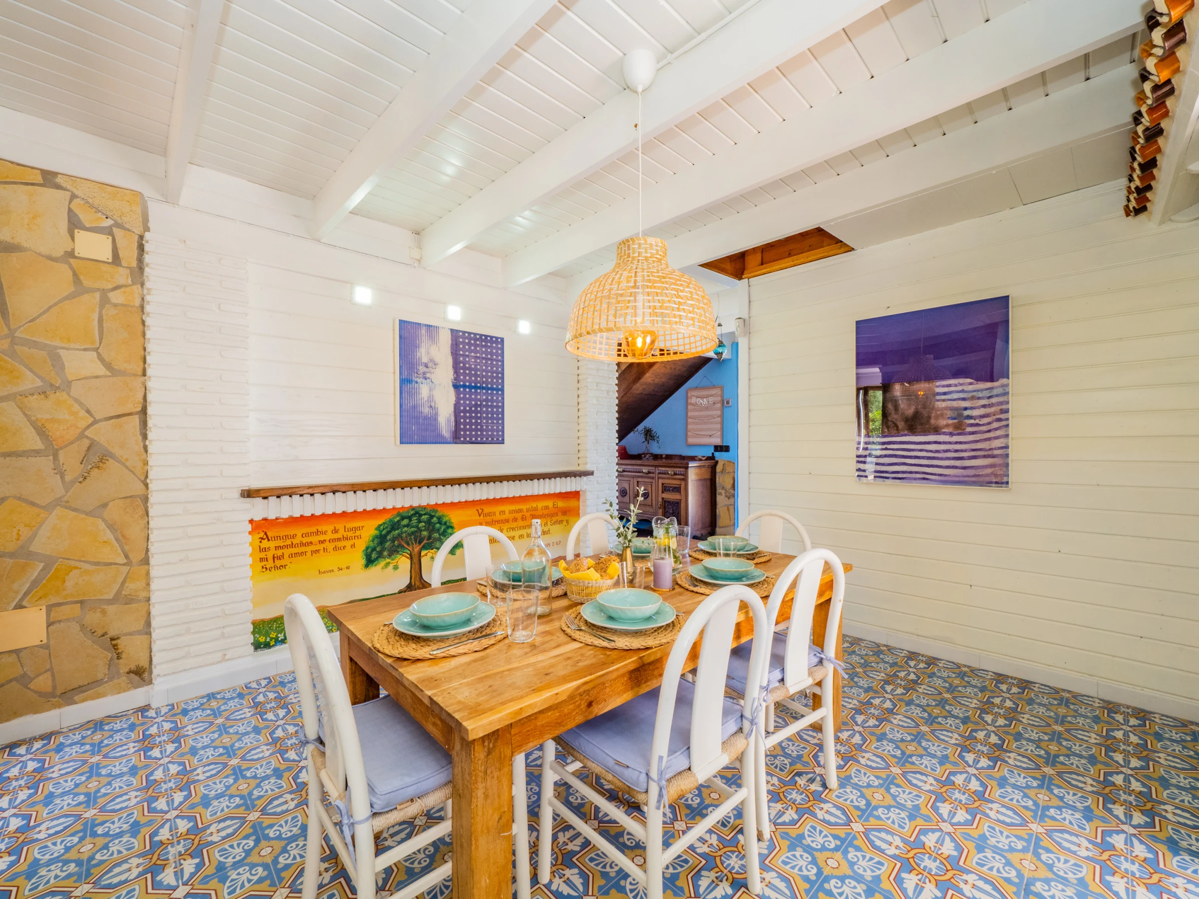 Inside the house, the ground floor houses a spacious fully equipped kitchen-diner, which connects to the bright living room with Smart TV and views of the garden and swimming pool. This space also includes a teleworking area for those who need to maintain concentration during their stay. On this floor, there is a bedroom with a double bed, wardrobes, and access to a private terrace, as well as a bathroom with a shower tray.