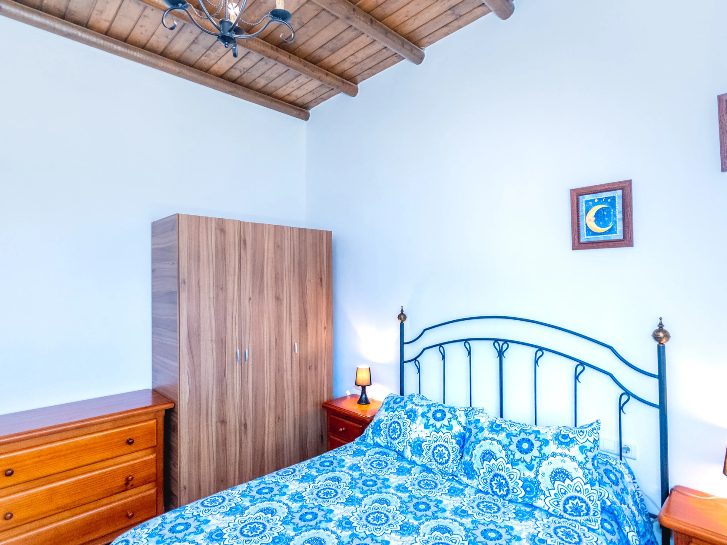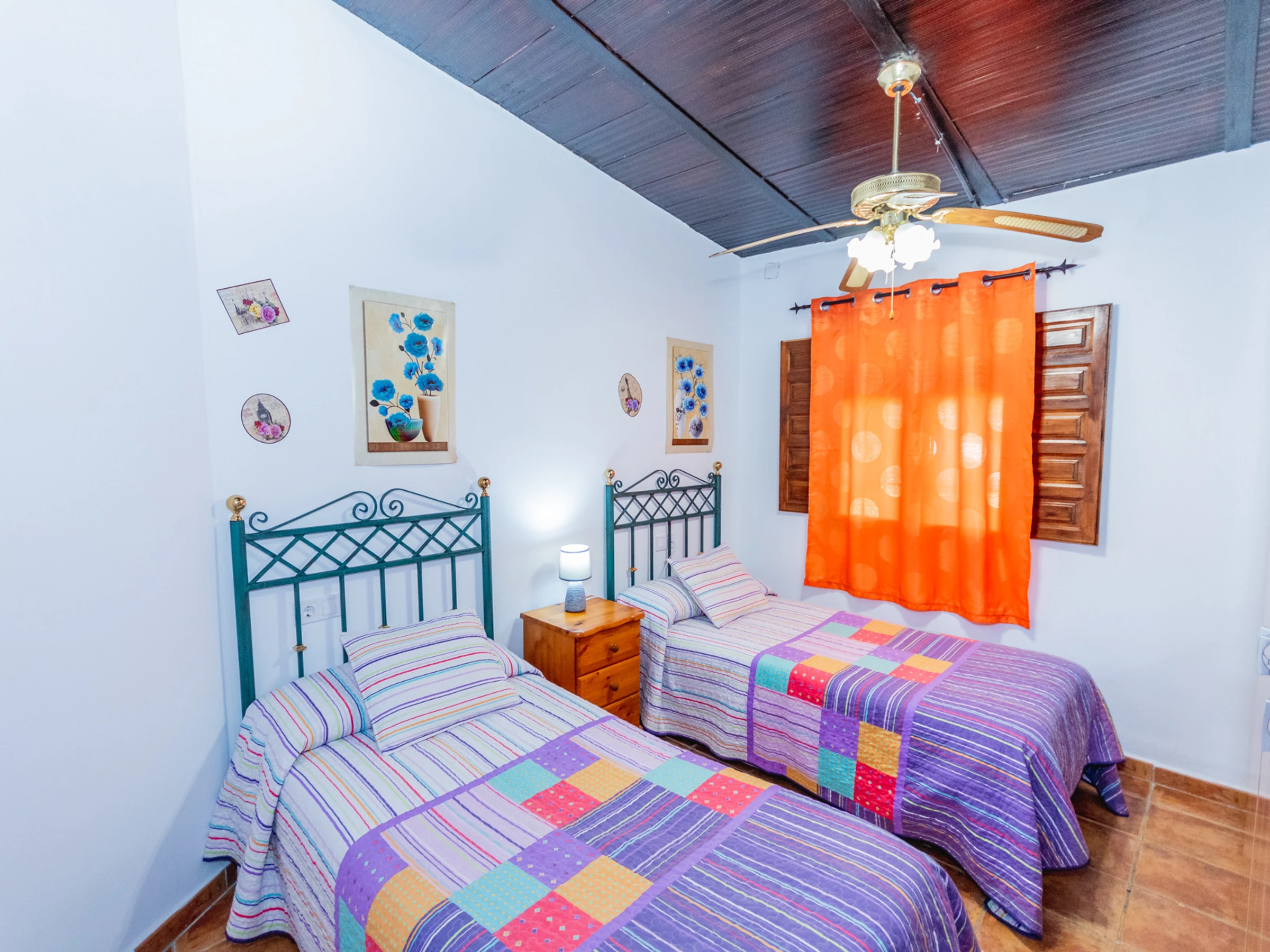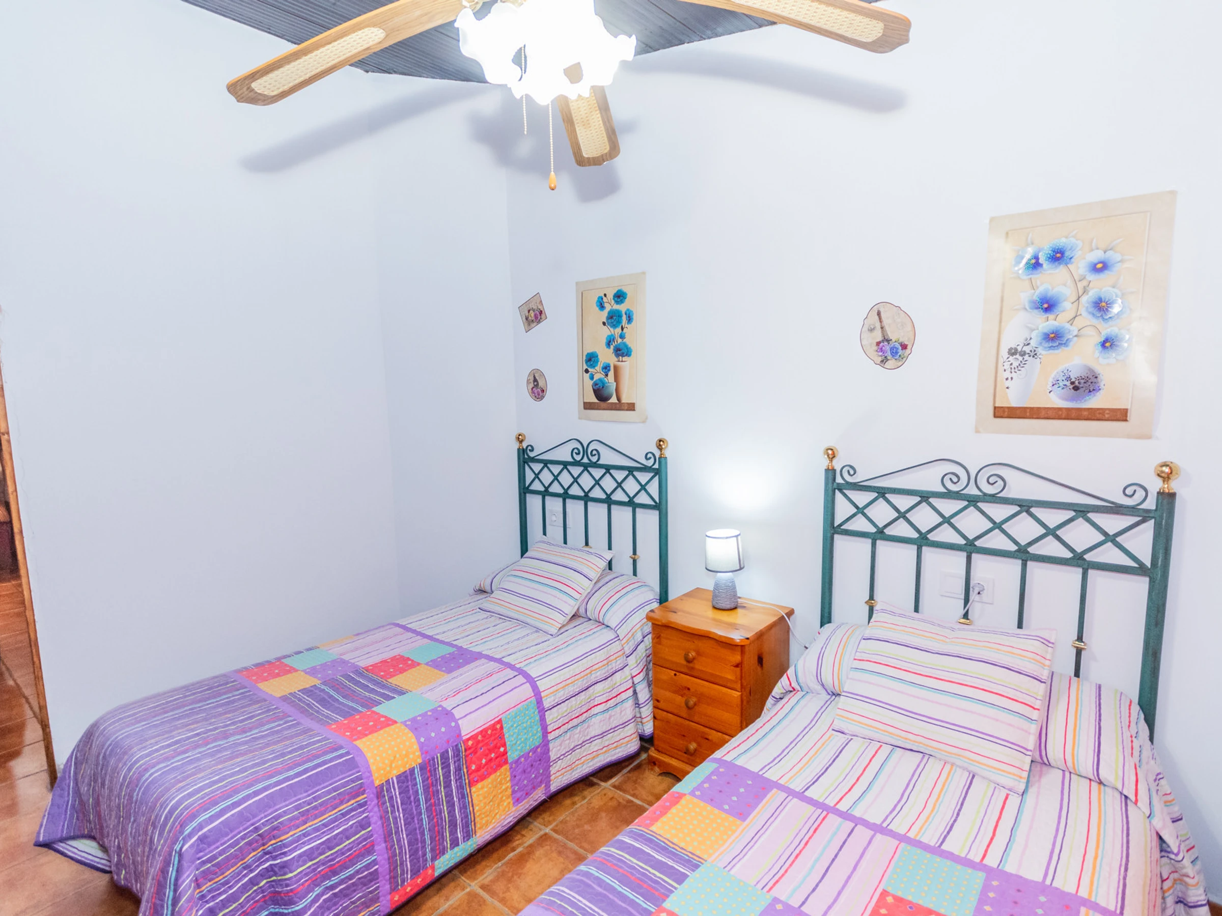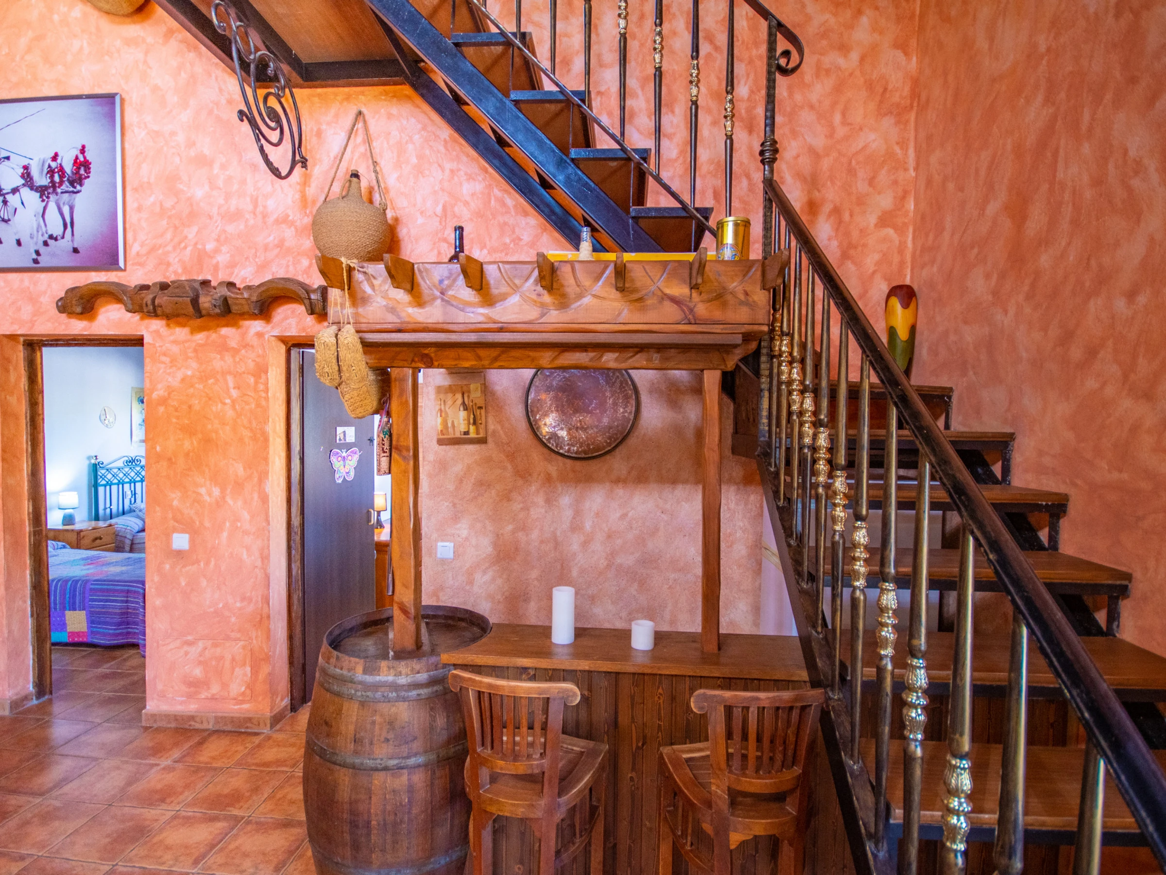 On this ground floor there are two rooms: one with a double bed and another with two single beds. The third room, bright and quiet, is located on the upper floor and has a double bed, accessible by a staircase located above the traditional living room bar 🛏️✨.