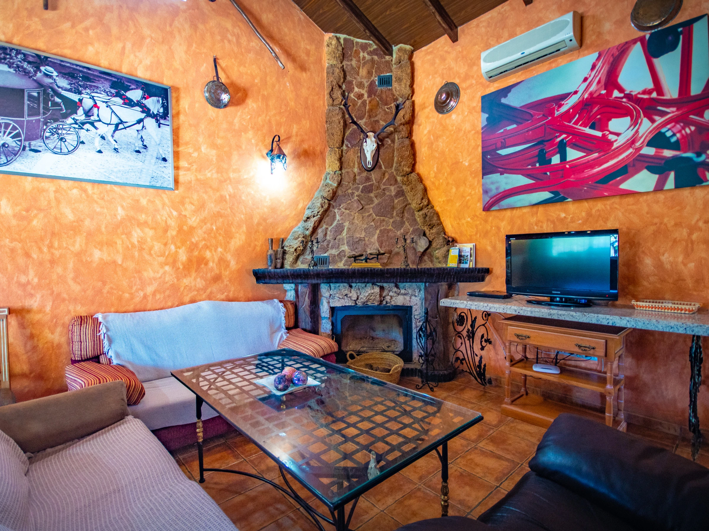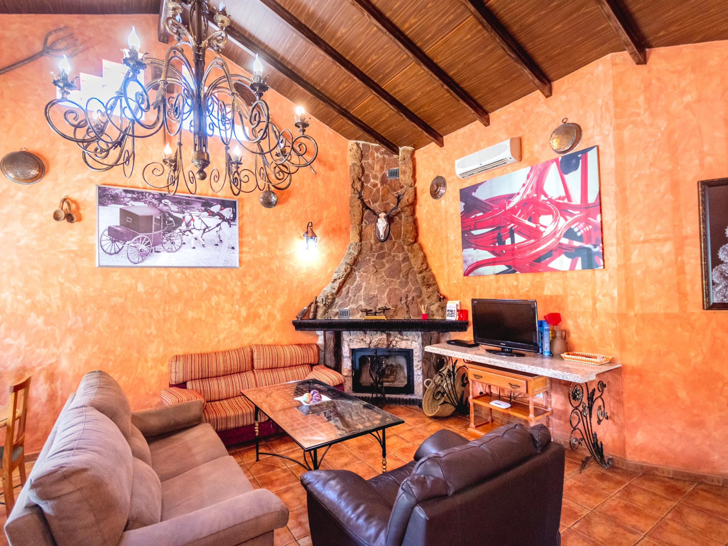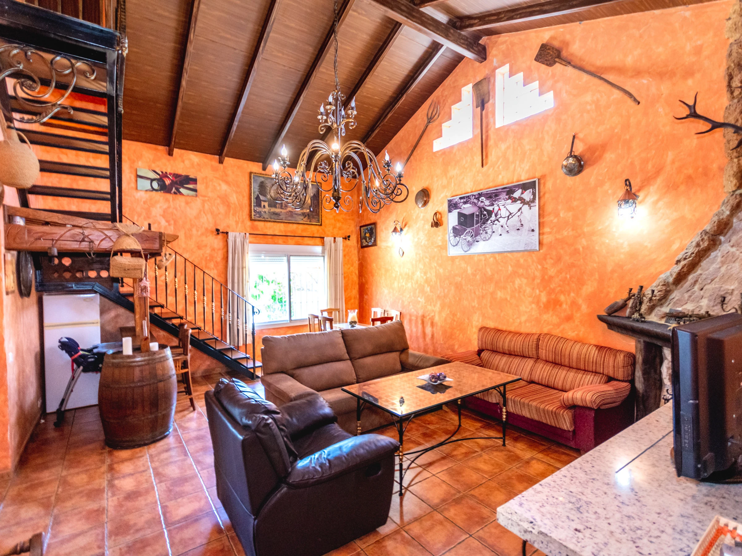 Access to the villa is made through the kitchen, equipped with all the necessary appliances and kitchenware to prepare any meal 🍳. The house is distributed over two floors: on the ground floor you will find the kitchen, a modern bathroom with a shower tray, and a spacious living-dining room with a fireplace, television and two comfortable sofas to relax. The decoration combines traditional Andalusian style with historical elements, creating a warm and welcoming atmosphere that invites you to spend unforgettable moments with family or friends 🔥🛋️.