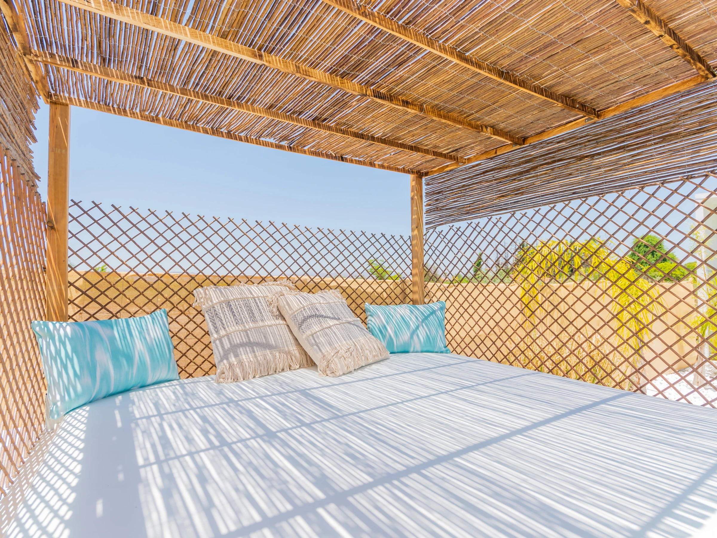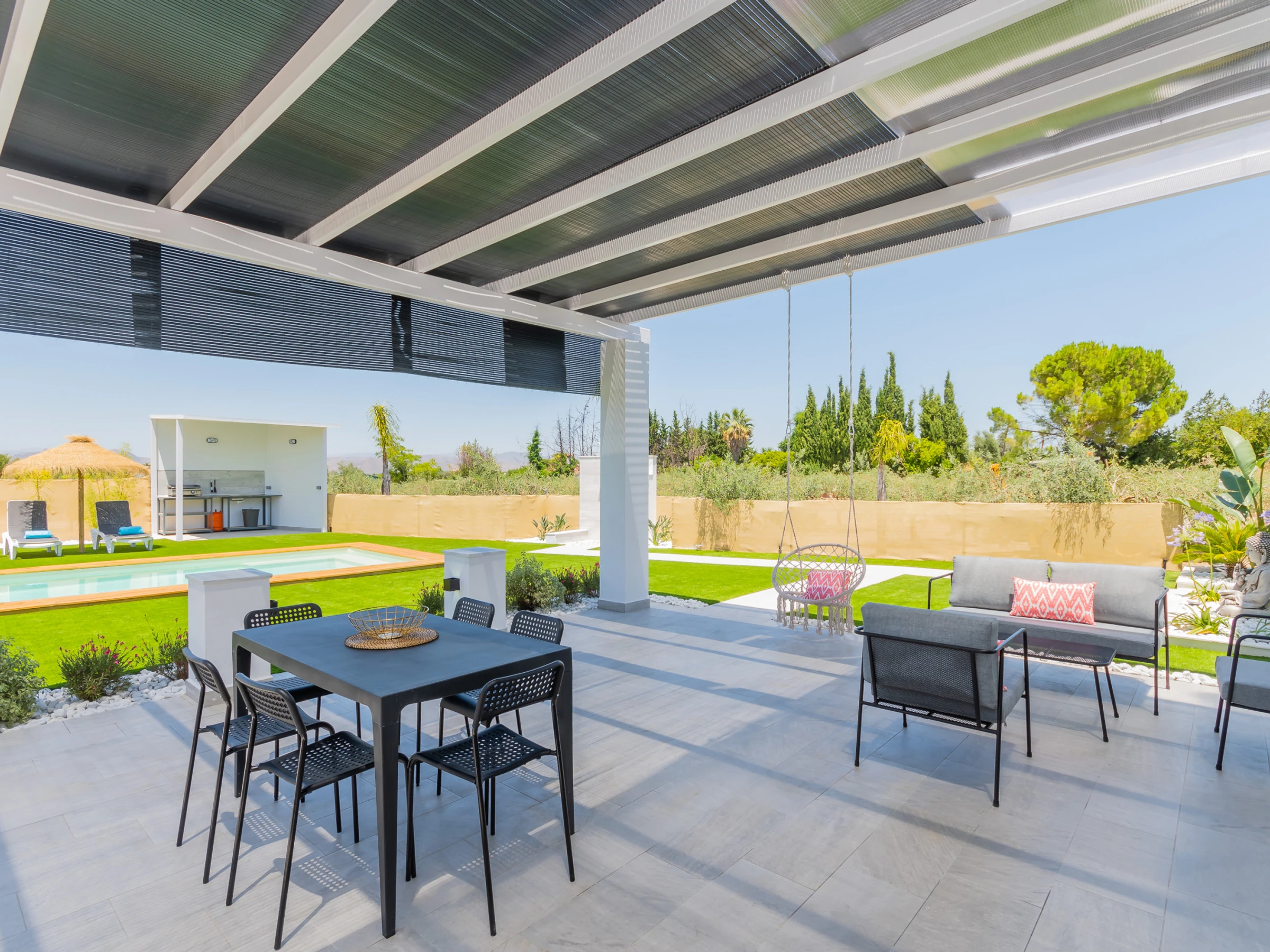 Outside, you will find well-defined spaces with high-quality furniture, including a shaded porch area for family lunches, a Balinese bed for sunbathing, and a private rooftop accessible by a staircase next to the pool, ideal for enjoying the sun with total privacy. Additionally, it has an outdoor toilet. The accommodation is equipped with air conditioning and heat pump heating for maximum comfort at any time of the year. The standard price is for 4 people, with a supplement for the fifth place.