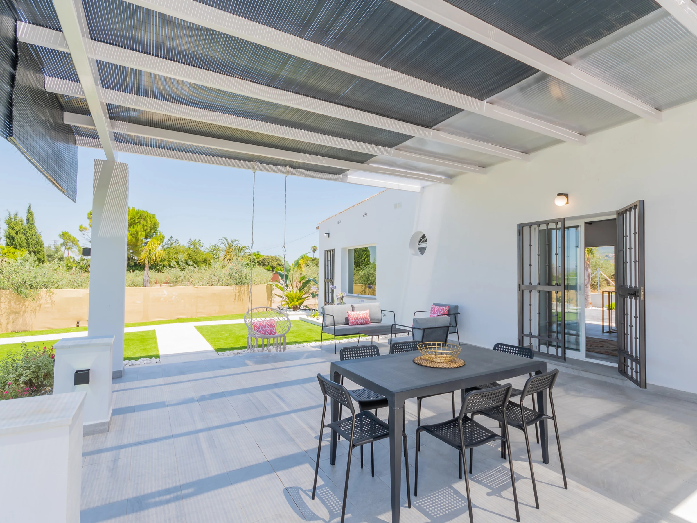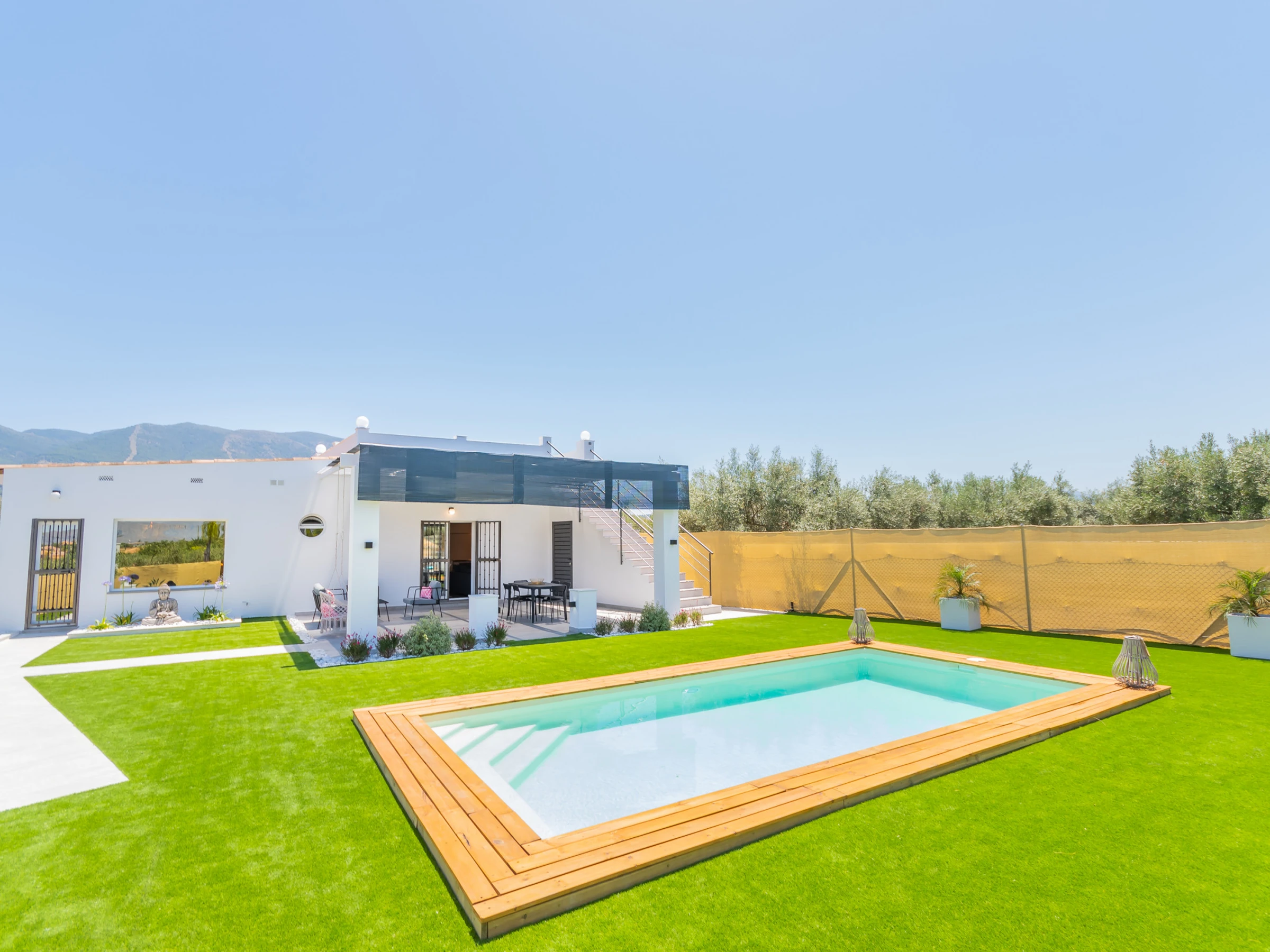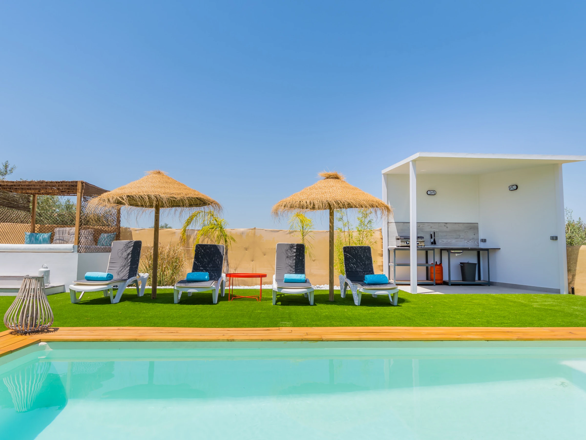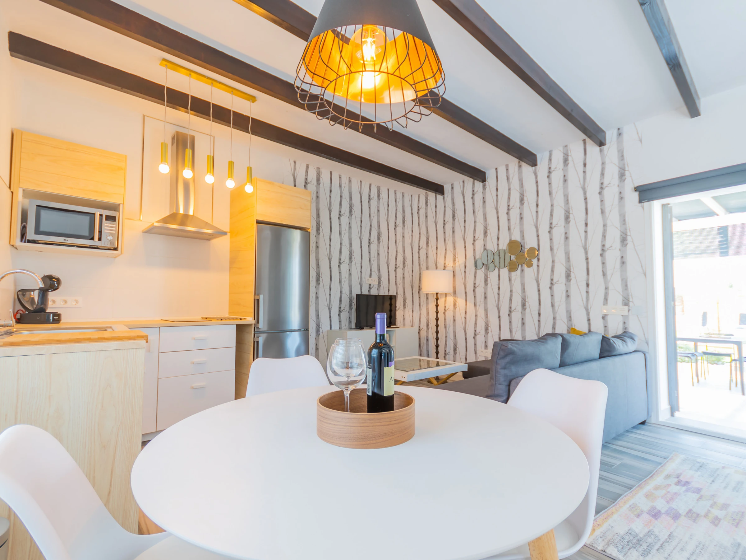The living room has a comfortable sofa bed and television with free Wi-Fi, ideal for relaxing while watching your favourite series while keeping an eye on the children thanks to the large window that connects to the outdoor area and swimming pool. The house has capacity for 5 people: two places on the sofa bed, one extra bed and an independent bedroom with a Queen Size bed, full bathroom with bathtub (NOT jacuzzi) and shower tray, and a decoration that stands out for its comfort and carefully crafted details.