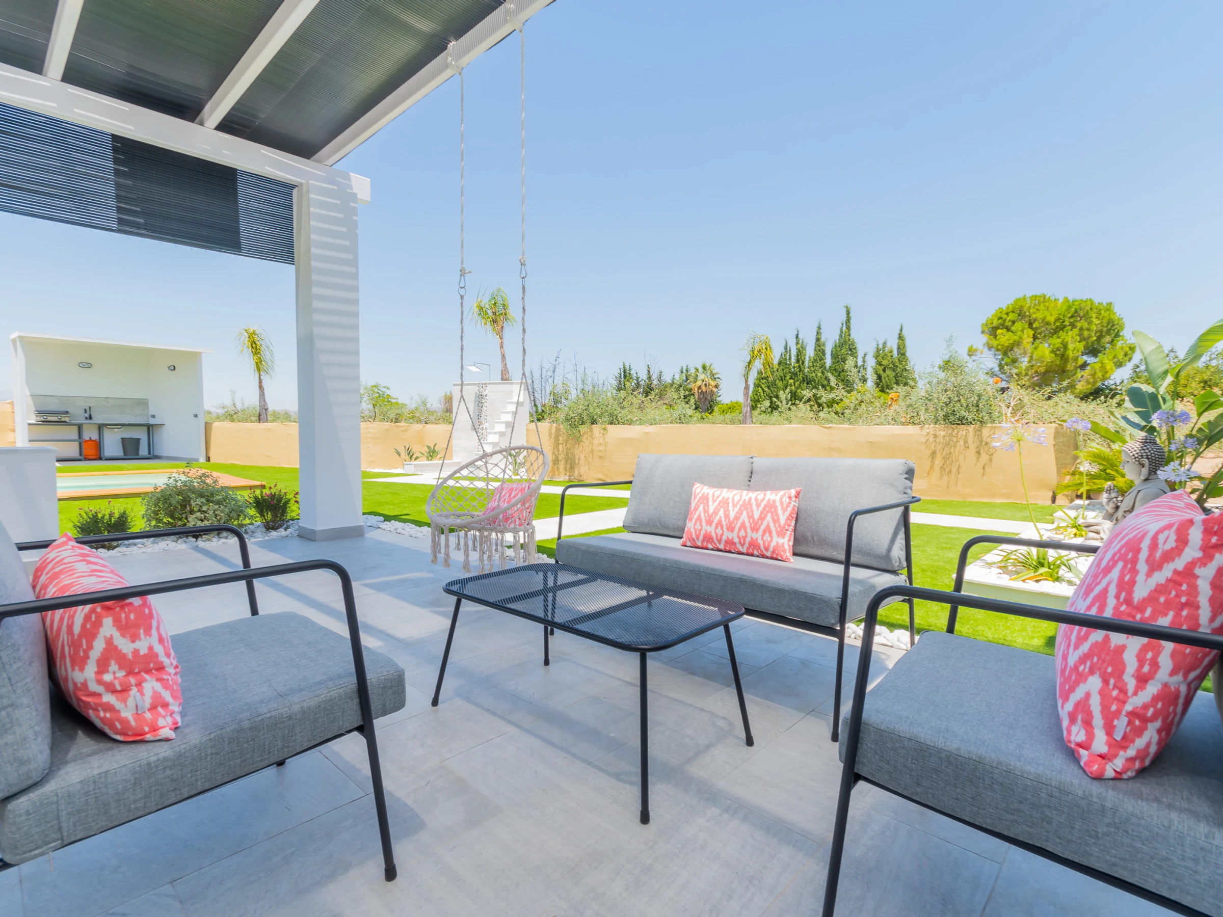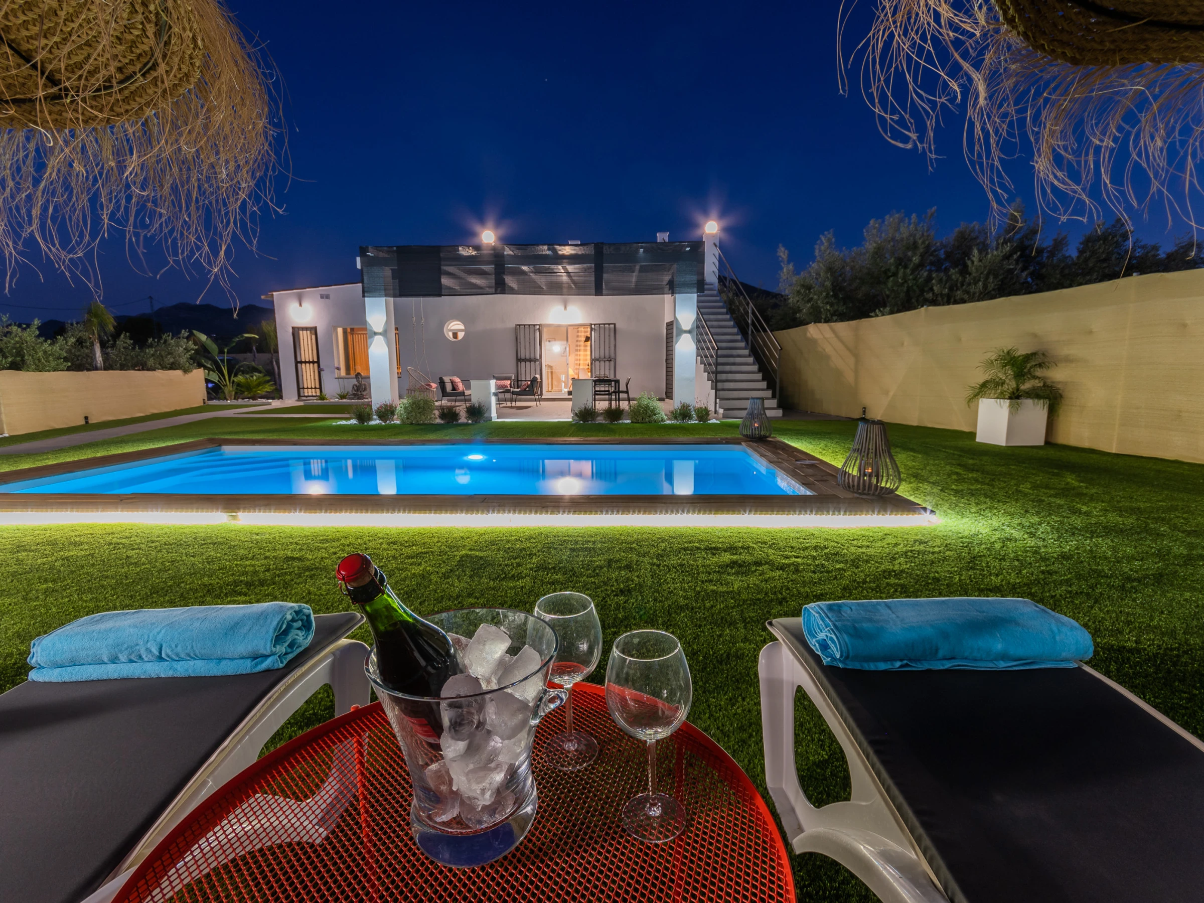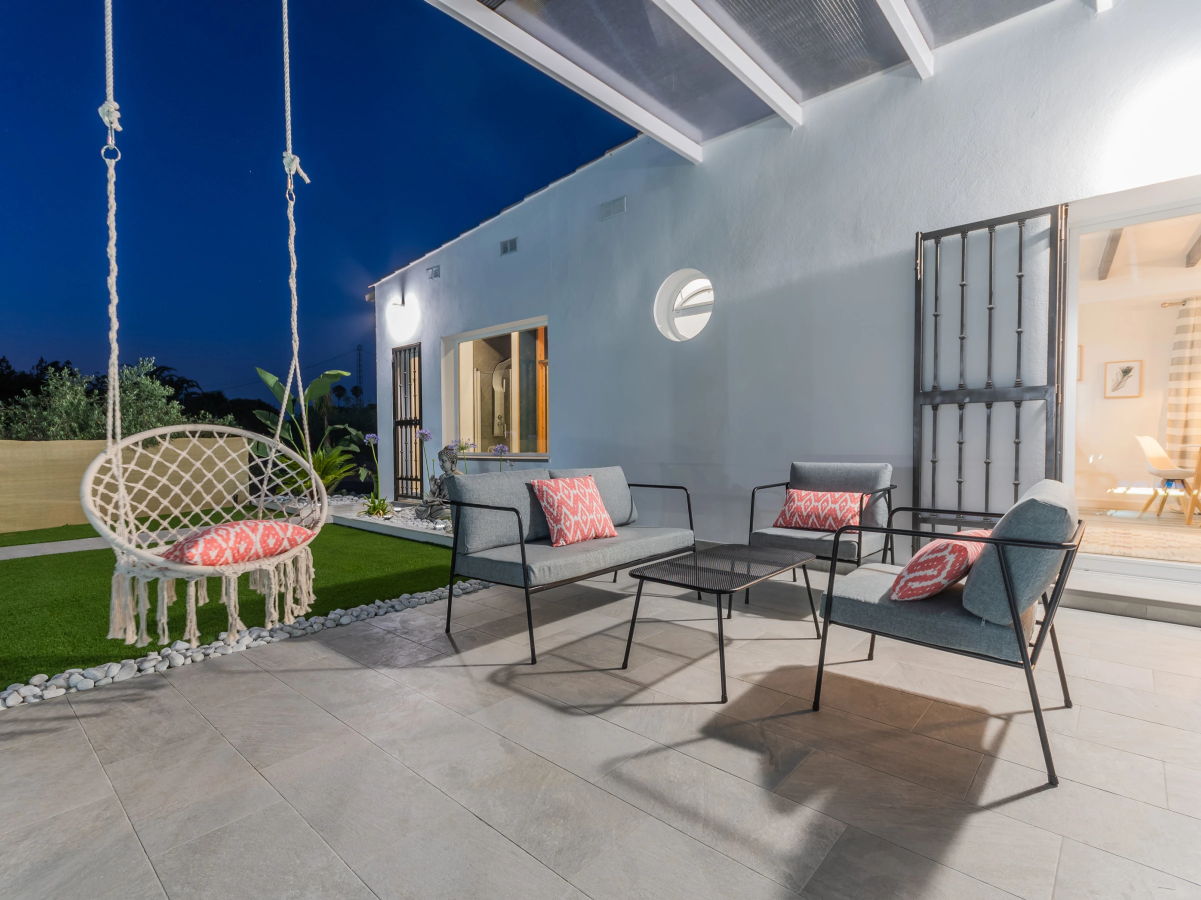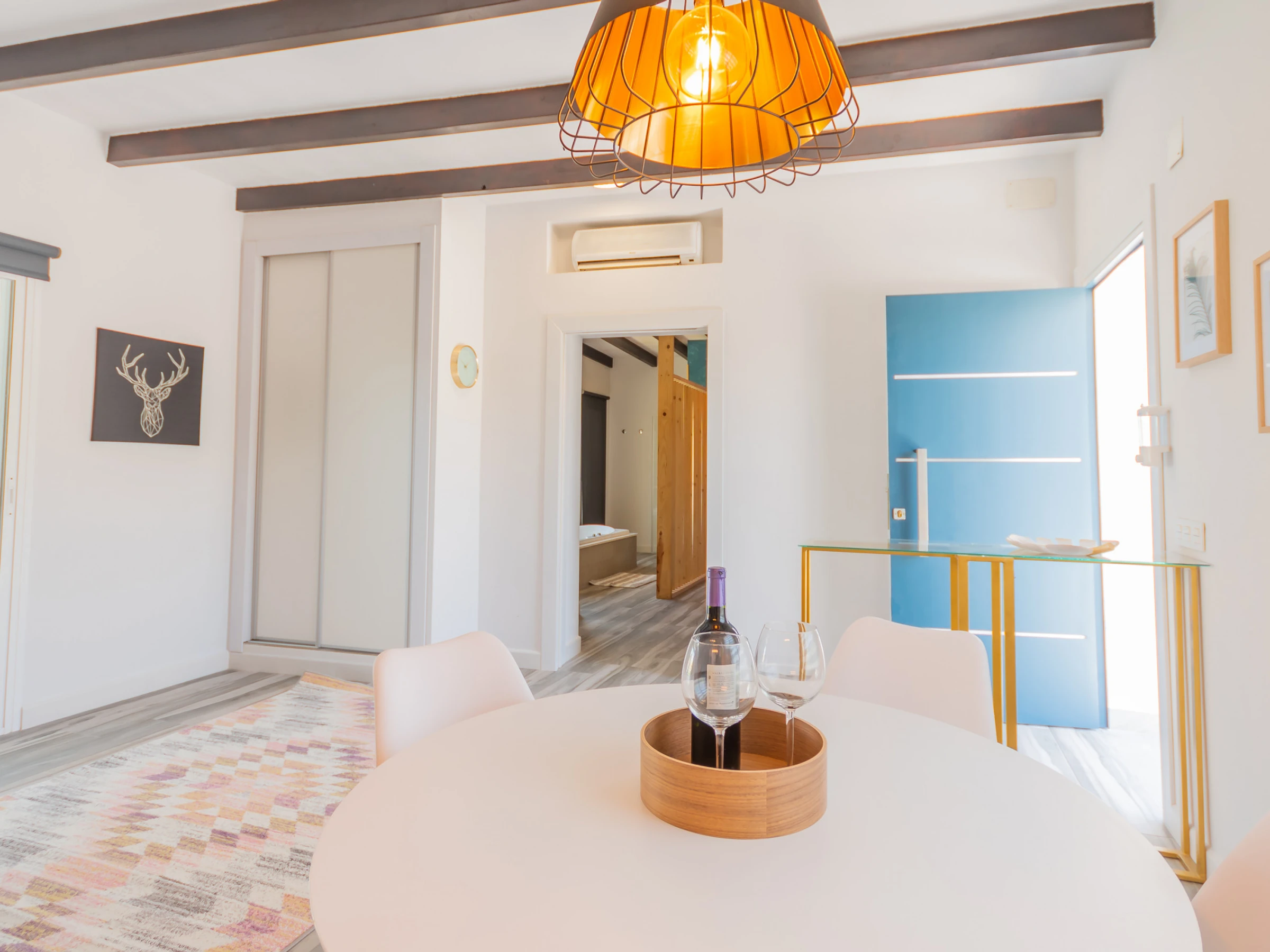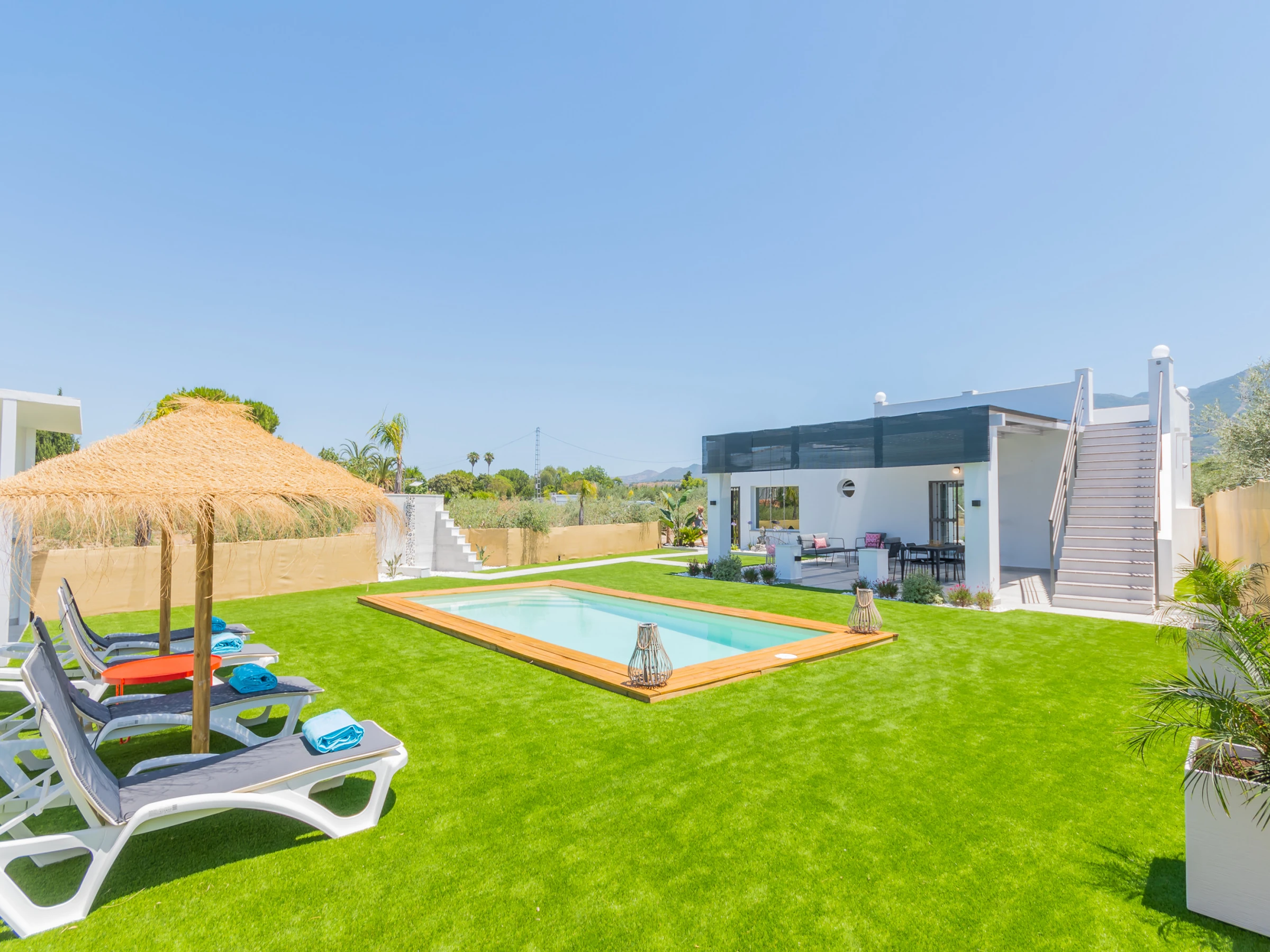 The living room has a comfortable sofa bed and television with free Wi-Fi, ideal for relaxing while watching your favourite series while keeping an eye on the children thanks to the large window that connects to the outdoor area and swimming pool. The house has capacity for 5 people: two places on the sofa bed, one extra bed and an independent bedroom with a Queen Size bed, full bathroom with bathtub (NOT jacuzzi) and shower tray, and a decoration that stands out for its comfort and carefully crafted details.