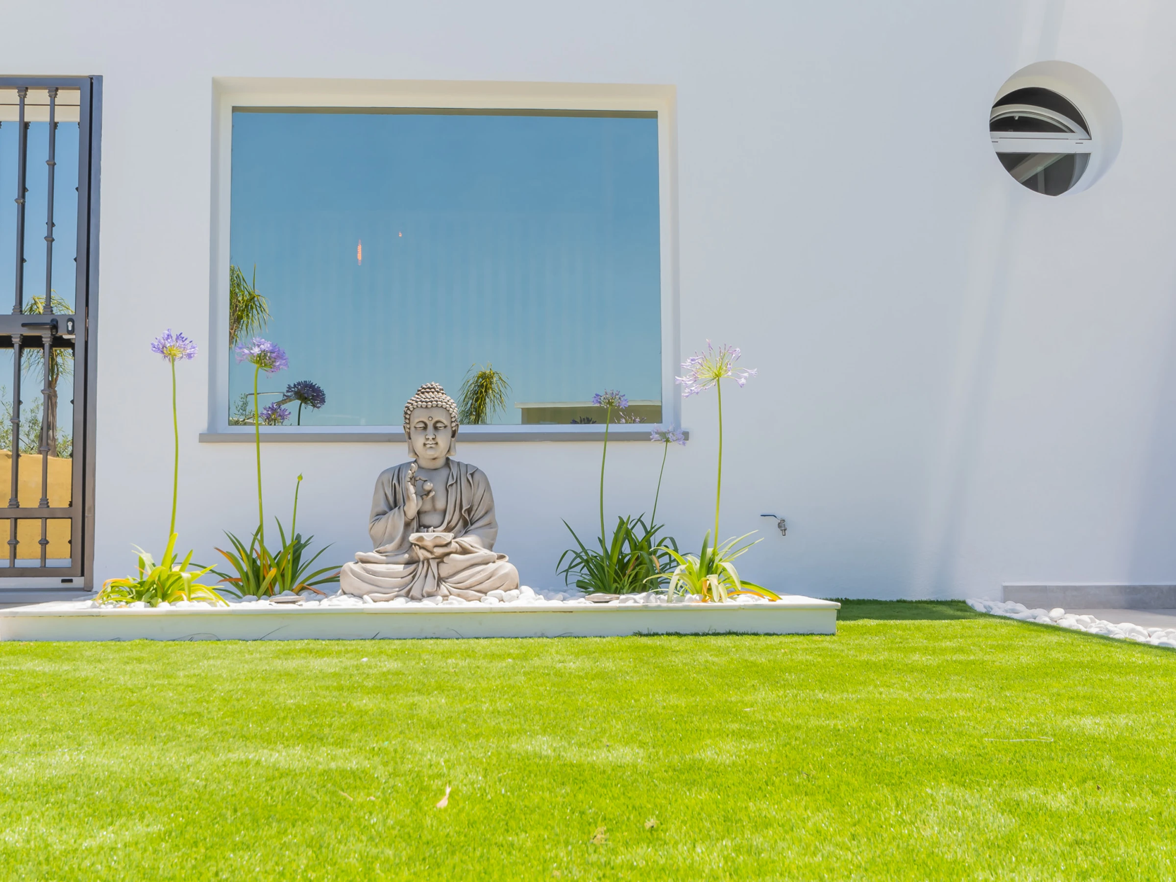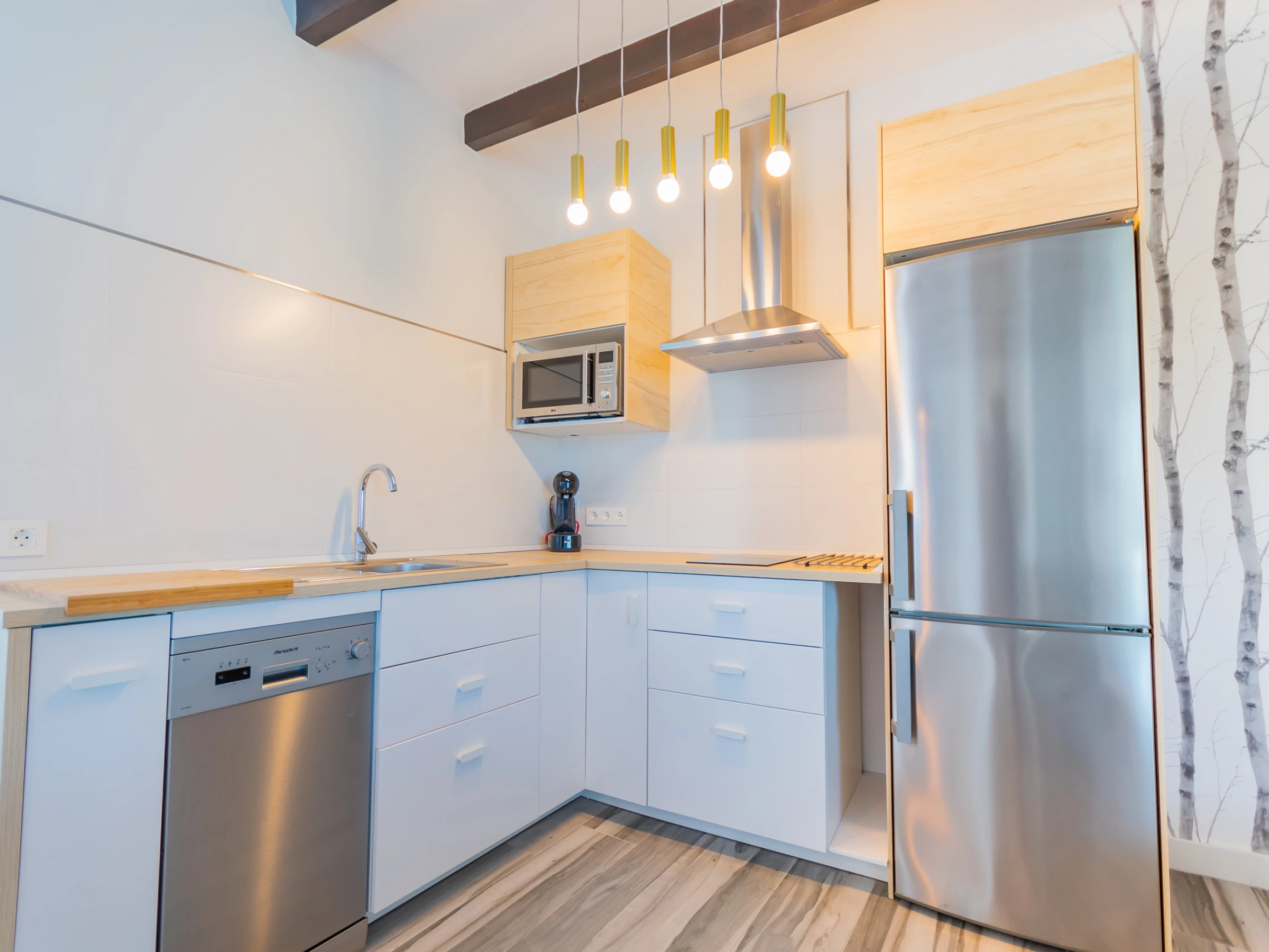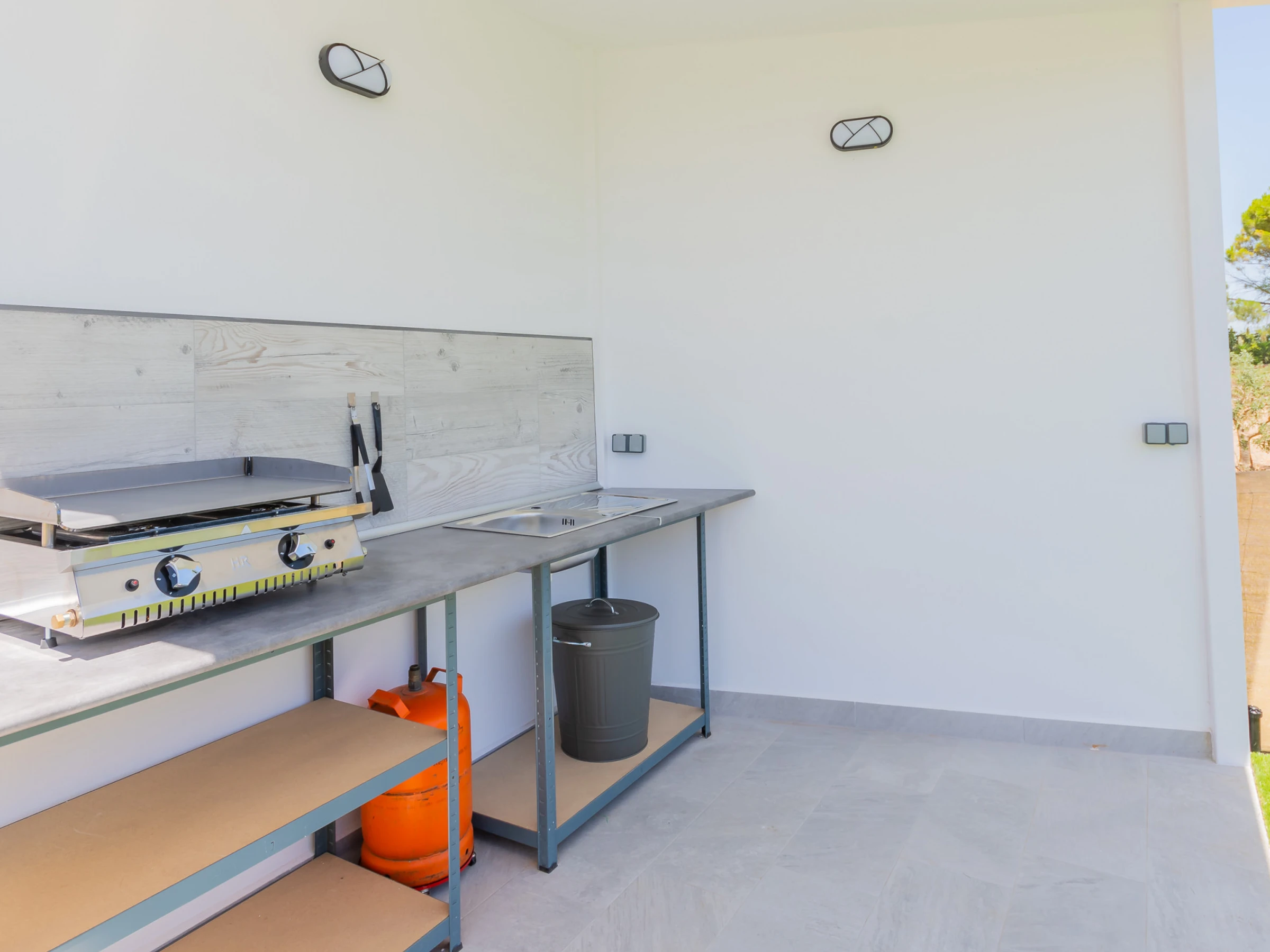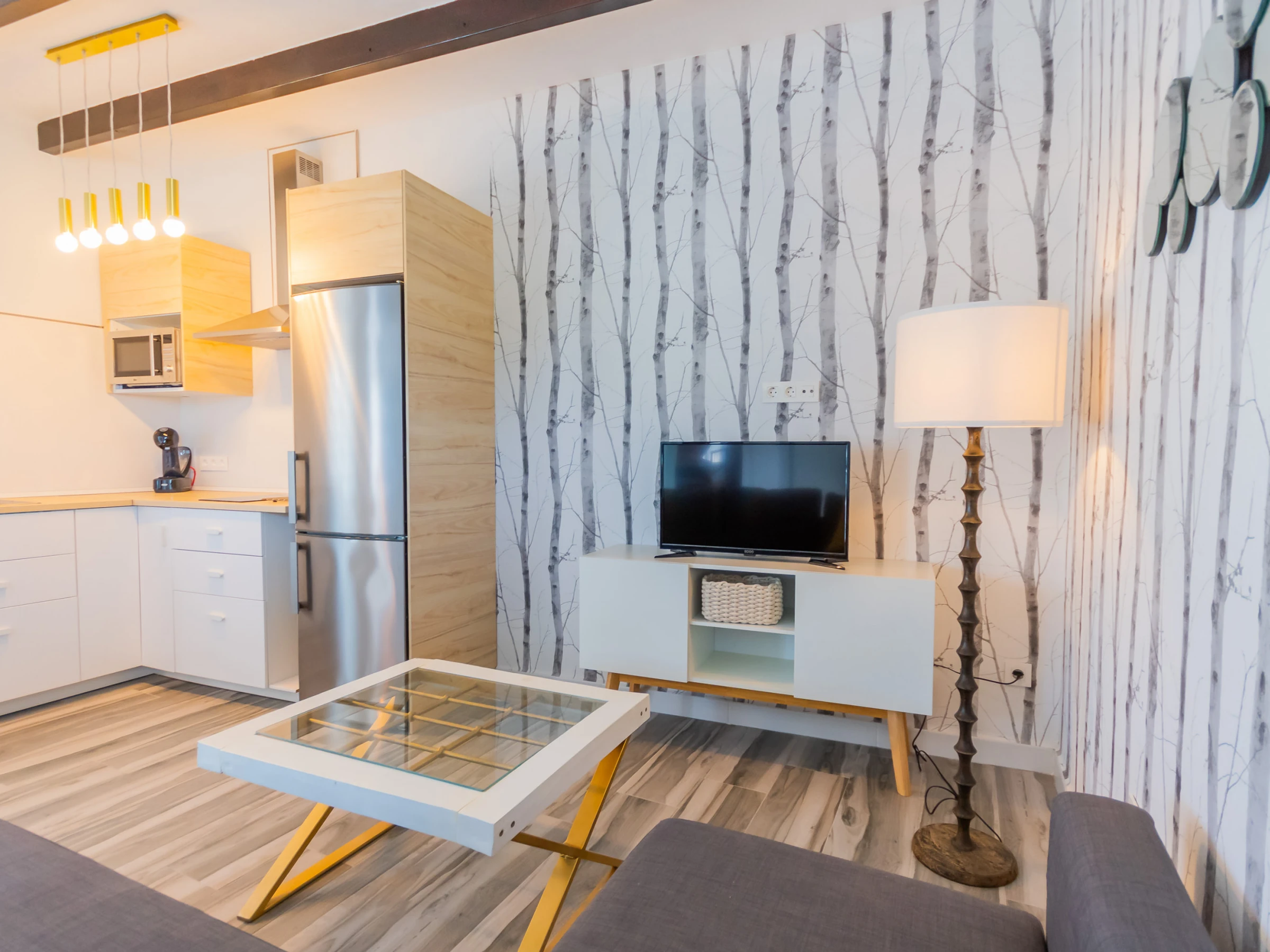 The living room has a comfortable sofa bed and television with free Wi-Fi, ideal for relaxing while watching your favourite series while keeping an eye on the children thanks to the large window that connects to the outdoor area and swimming pool. The house has capacity for 5 people: two places on the sofa bed, one extra bed and an independent bedroom with a Queen Size bed, full bathroom with bathtub (NOT jacuzzi) and shower tray, and a decoration that stands out for its comfort and carefully crafted details.
