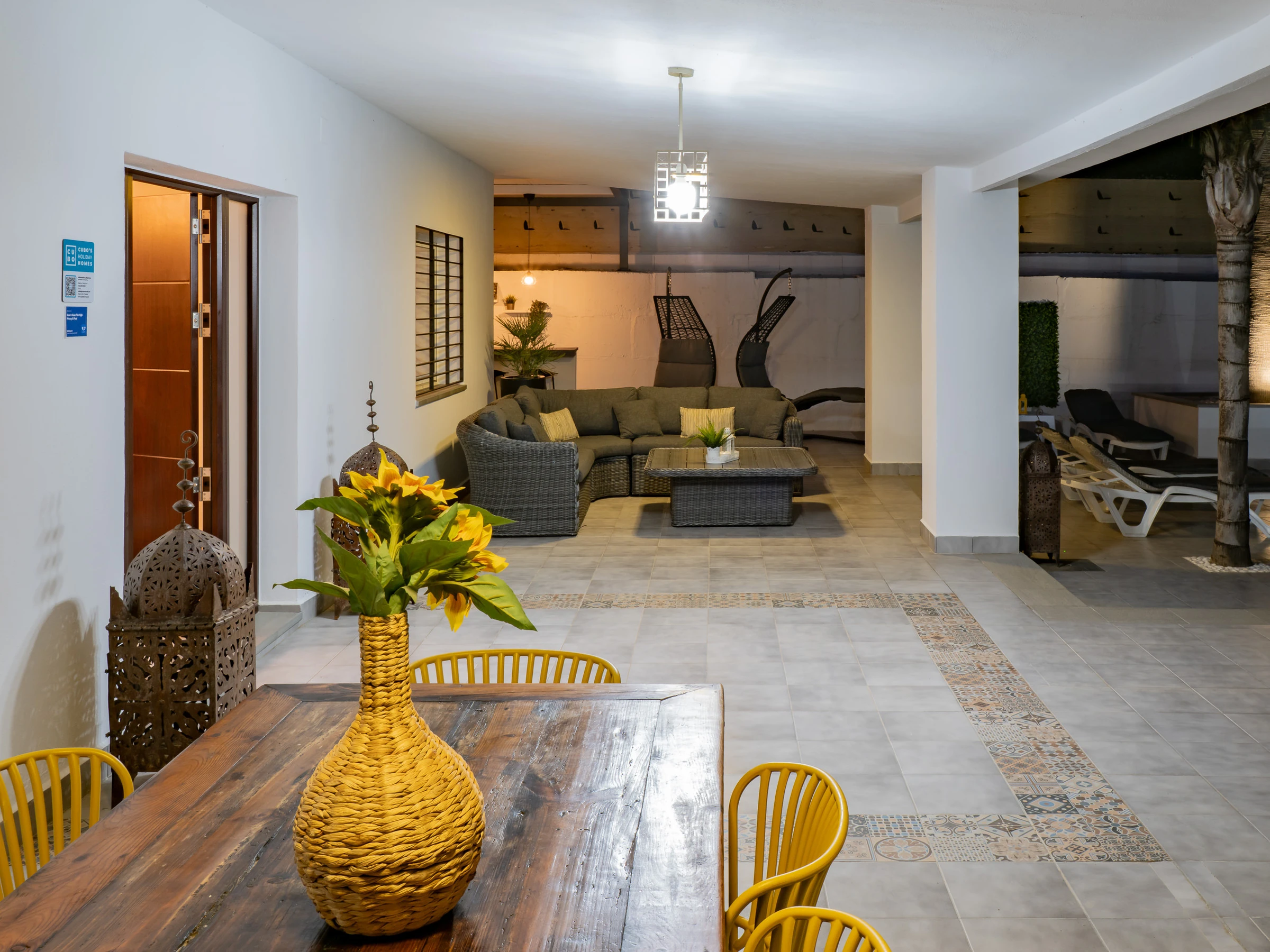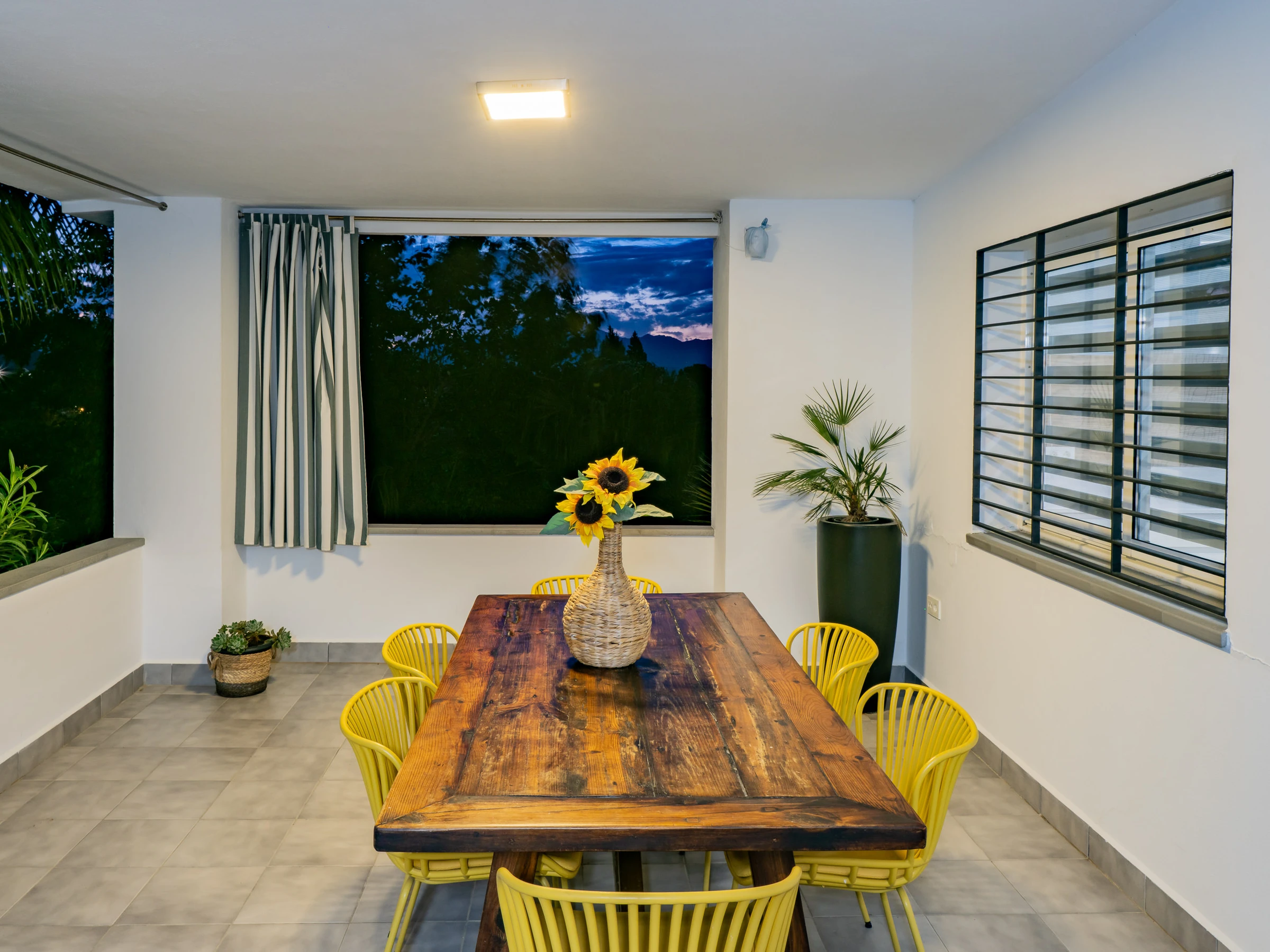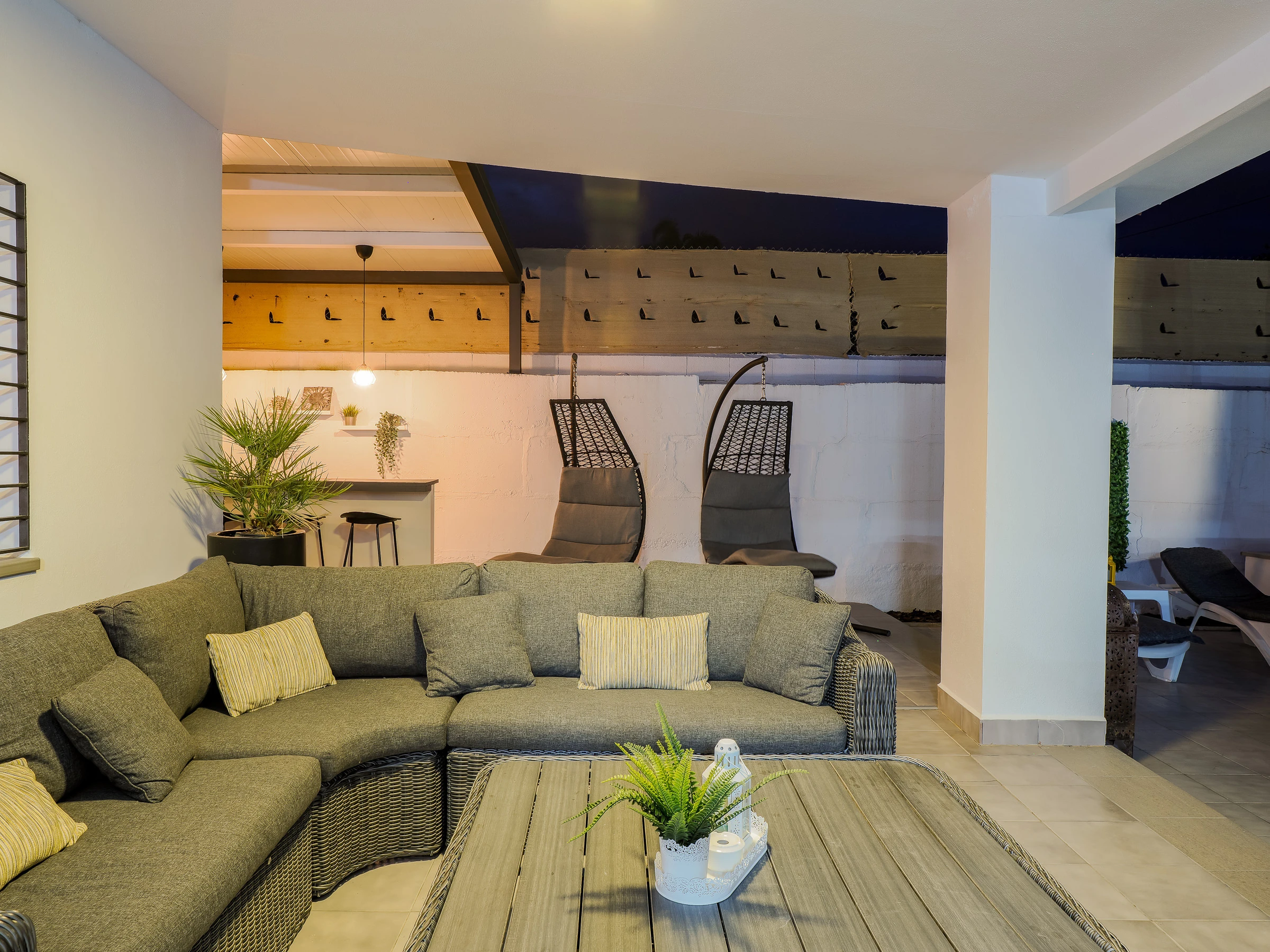 As soon as you arrive, you will comfortably park inside the fenced plot, and you will be received by a spacious outdoor area with a private pool, sun loungers and umbrellas to relax under the sun or the stars 🌌. The large covered porch offers two environments: an outdoor dining area with an elegant table and a cosy garden lounge, ideal for family chats or moments of relaxation ☕📖.