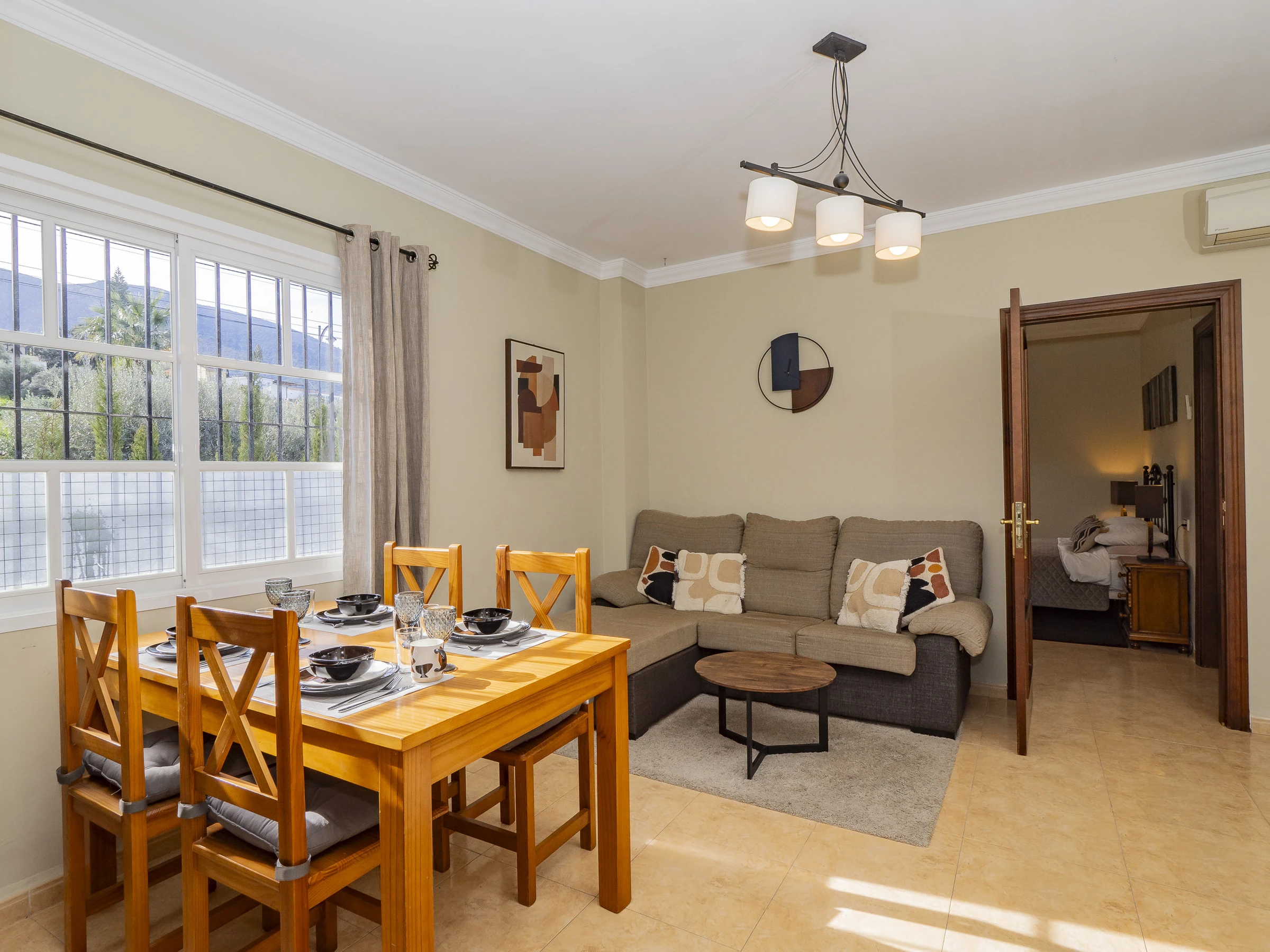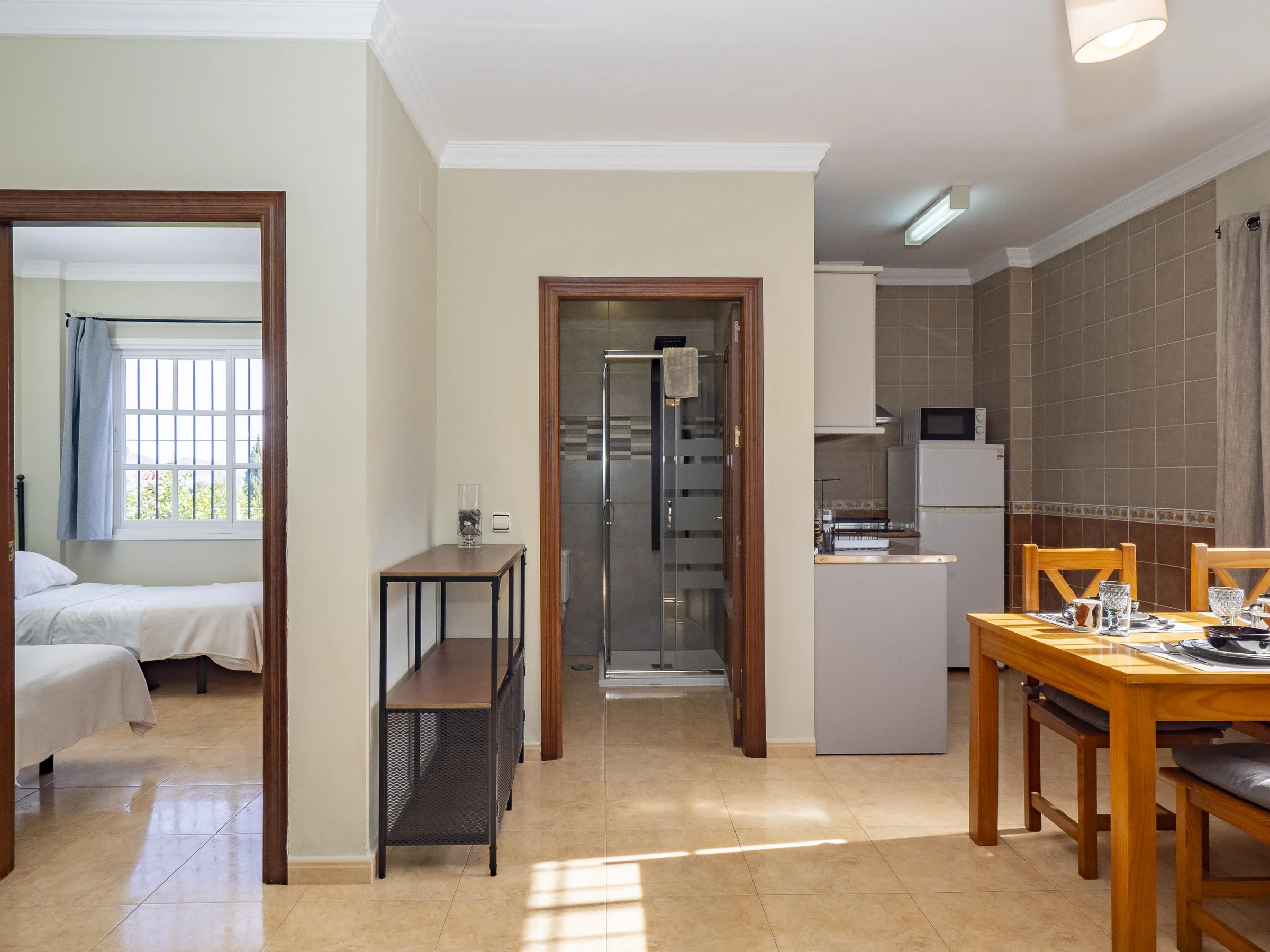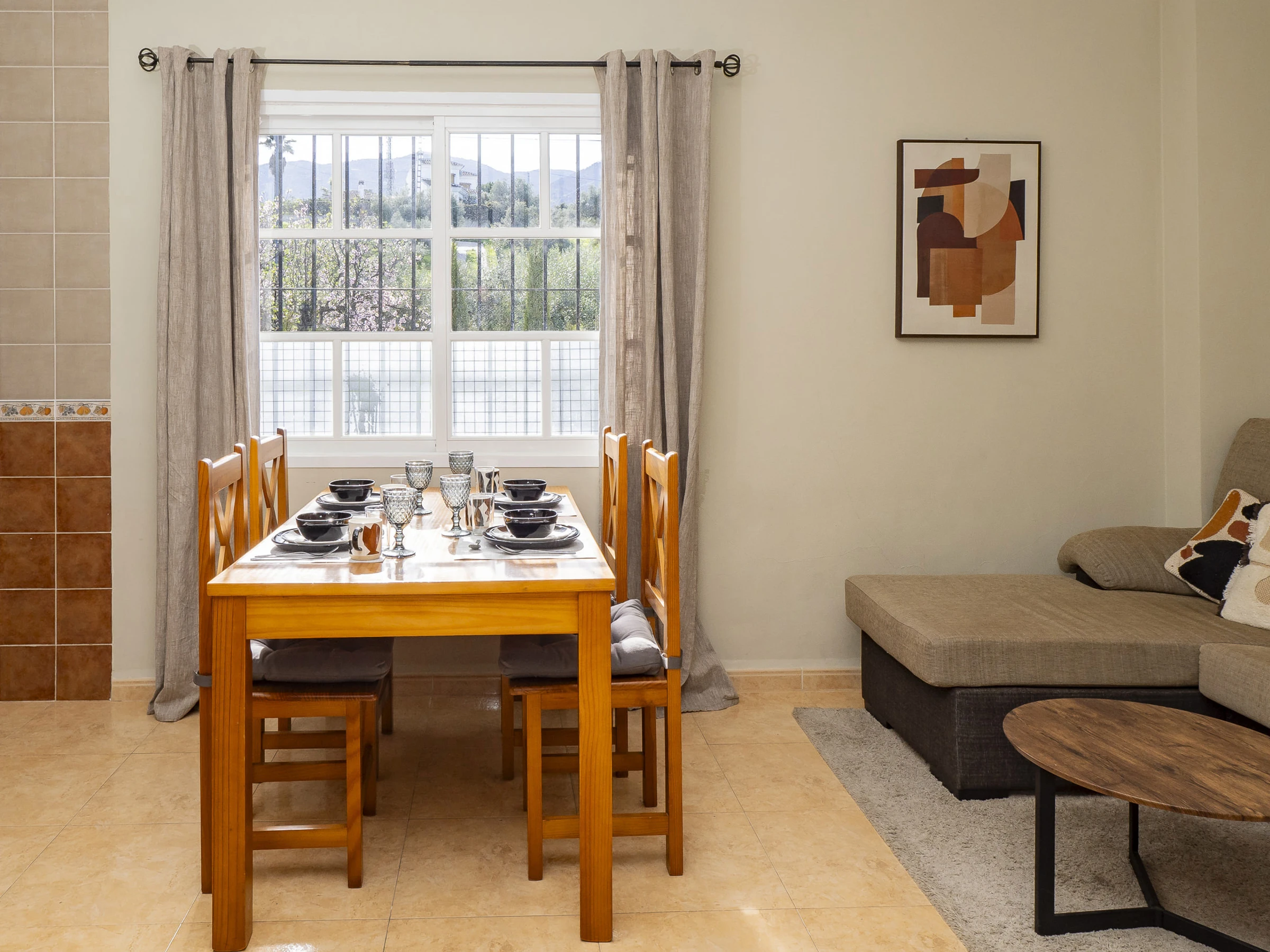 This cosy holiday apartment with a swimming pool has capacity for four people and is perfect for couples or small families who want to discover the province of Malaga. Located in a residential complex with extensive common areas, you will enjoy a communal swimming pool, outdoor relaxation area and billiards table, creating an ideal environment to relax and socialise. In addition, the host lives in the same enclosure alongside her pets, and if you travel with yours, it is possible to accommodate it for a supplement, always under supervision and on a leash within the enclosure.