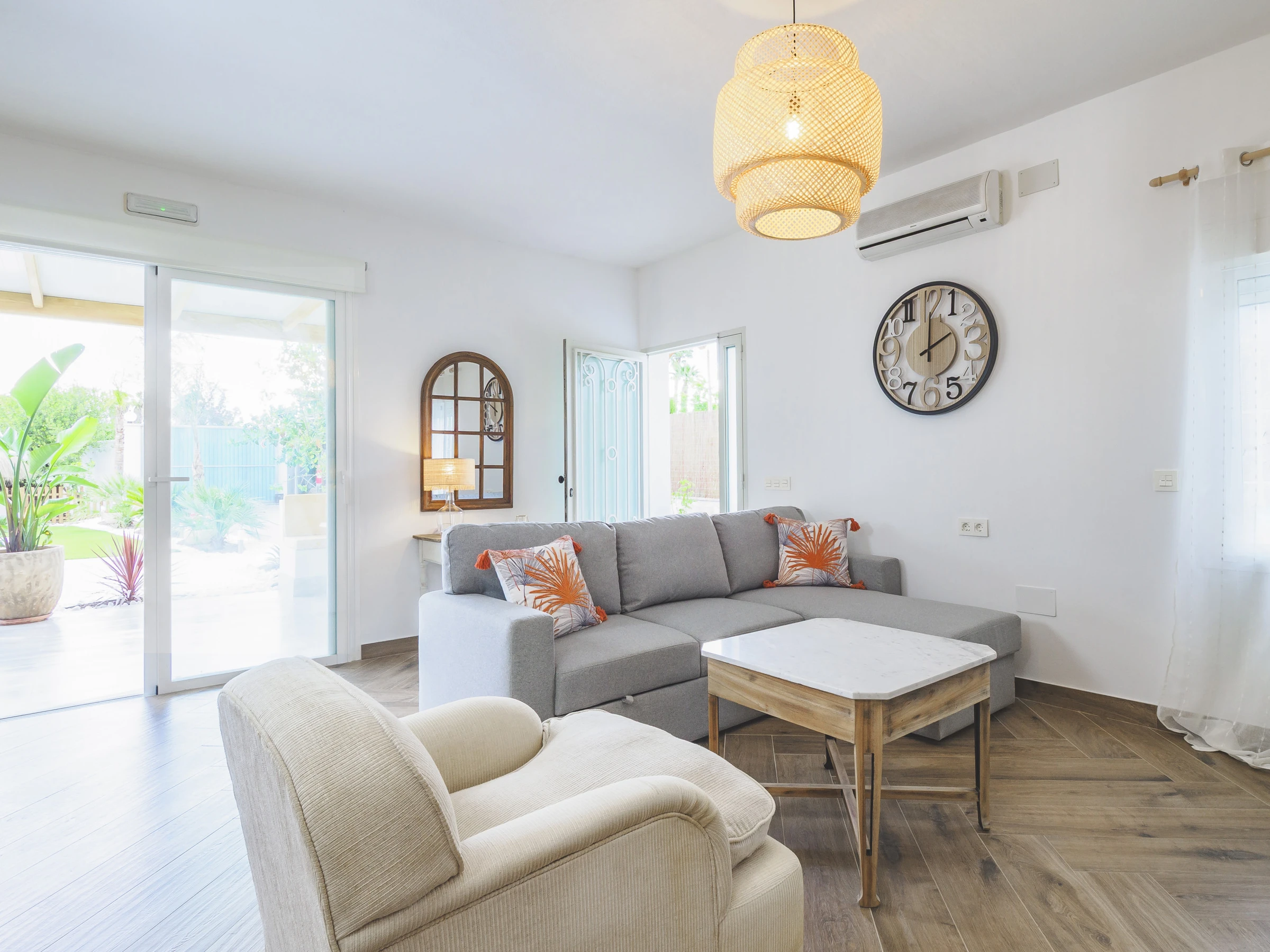 🛋️ Inside, the house has a spacious living-dining room with a Smart TV and a fully equipped open-plan kitchen. It has two accesses, facilitating the connection between interior and exterior.