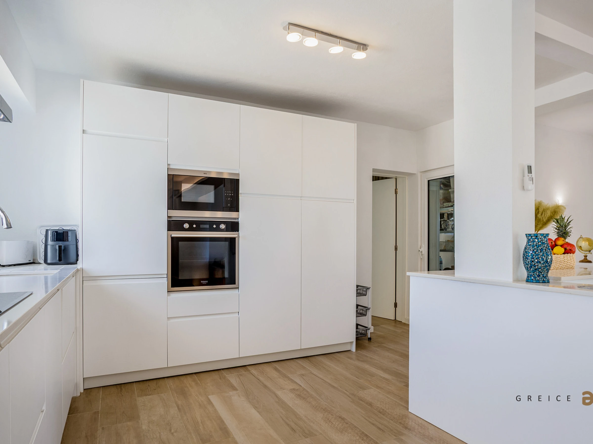 The open‑plan kitchen includes a ceramic hob, refrigerator, microwave, oven, freezer, dishwasher, kitchen utensils, coffee machine, fryer, toaster, electric kettle and juicer.