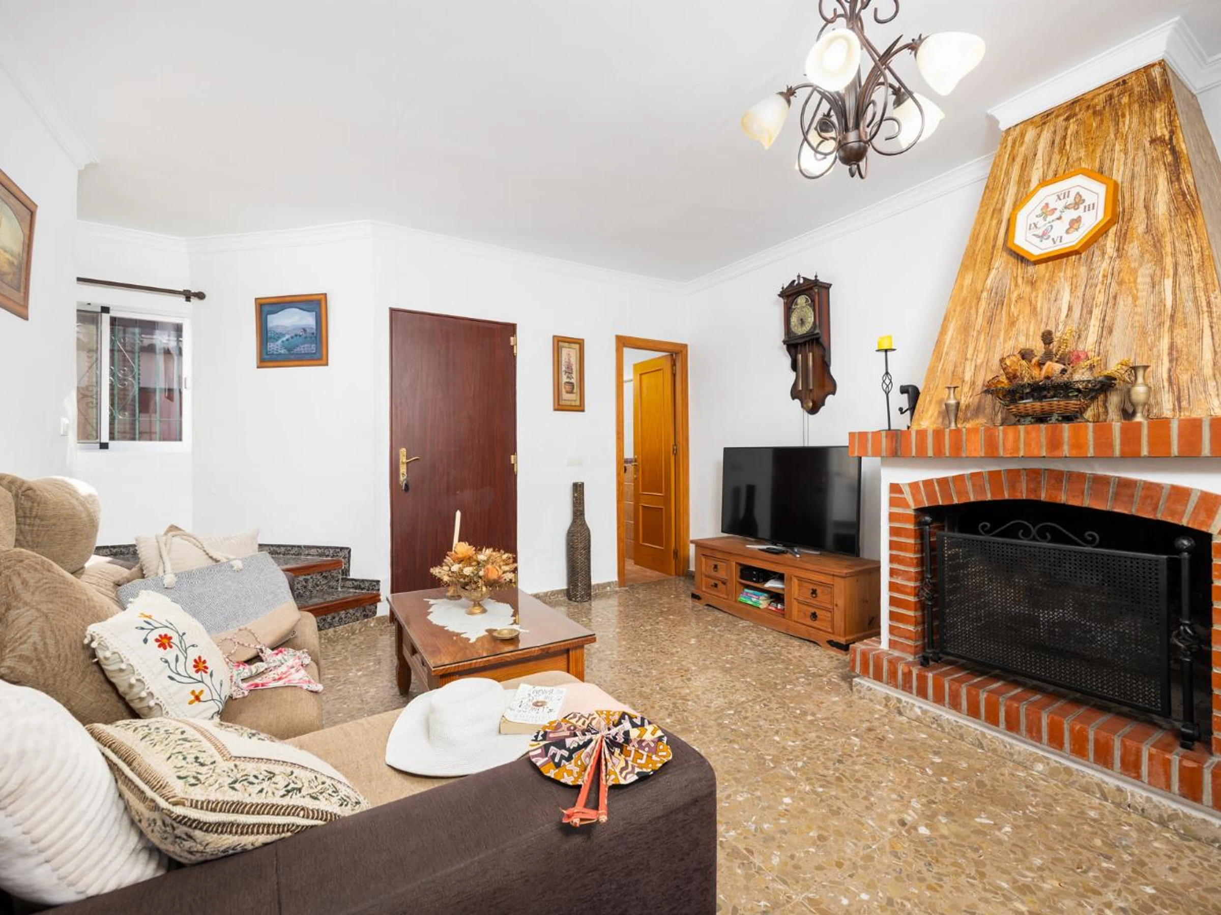 The living room is air-conditioned and has a ornamental fireplace,