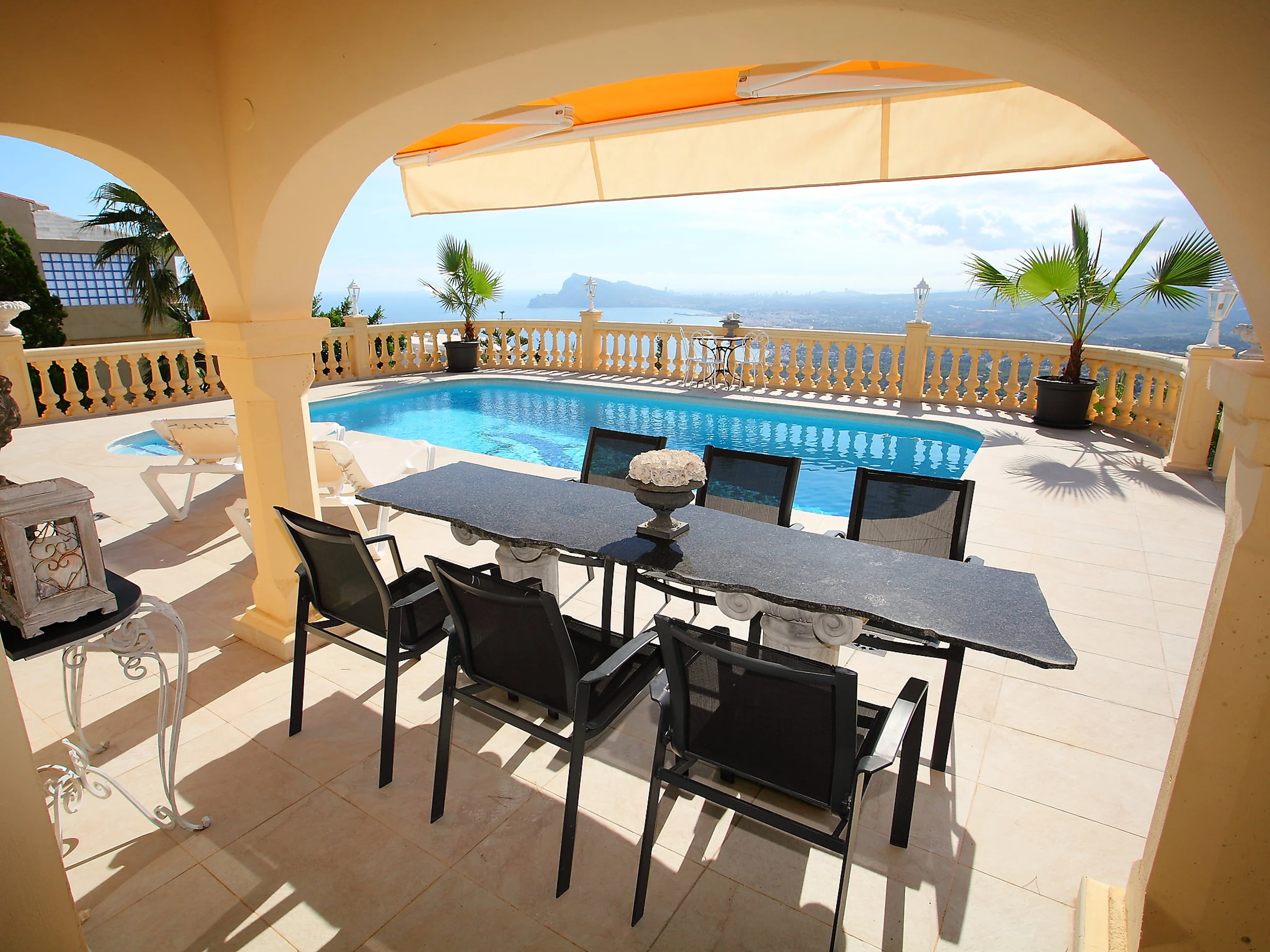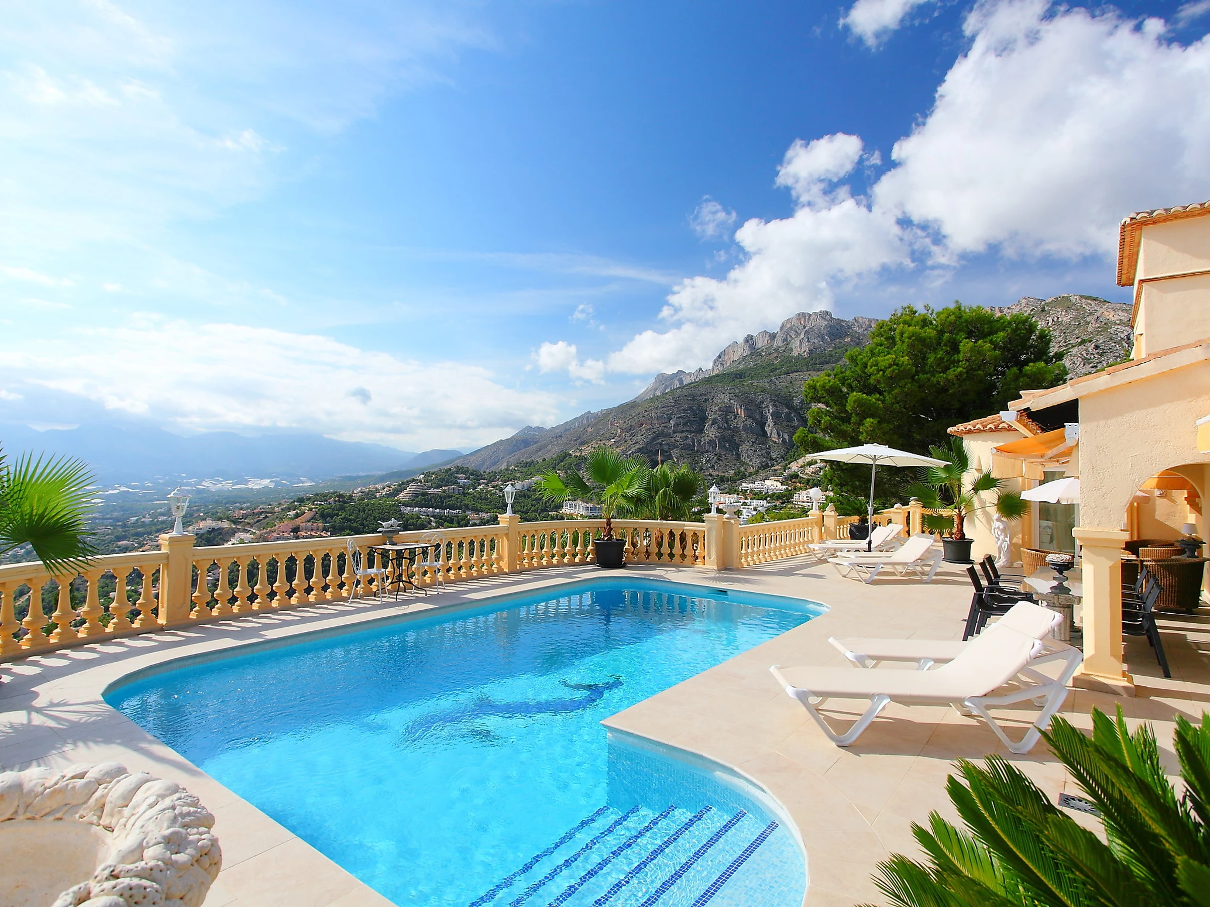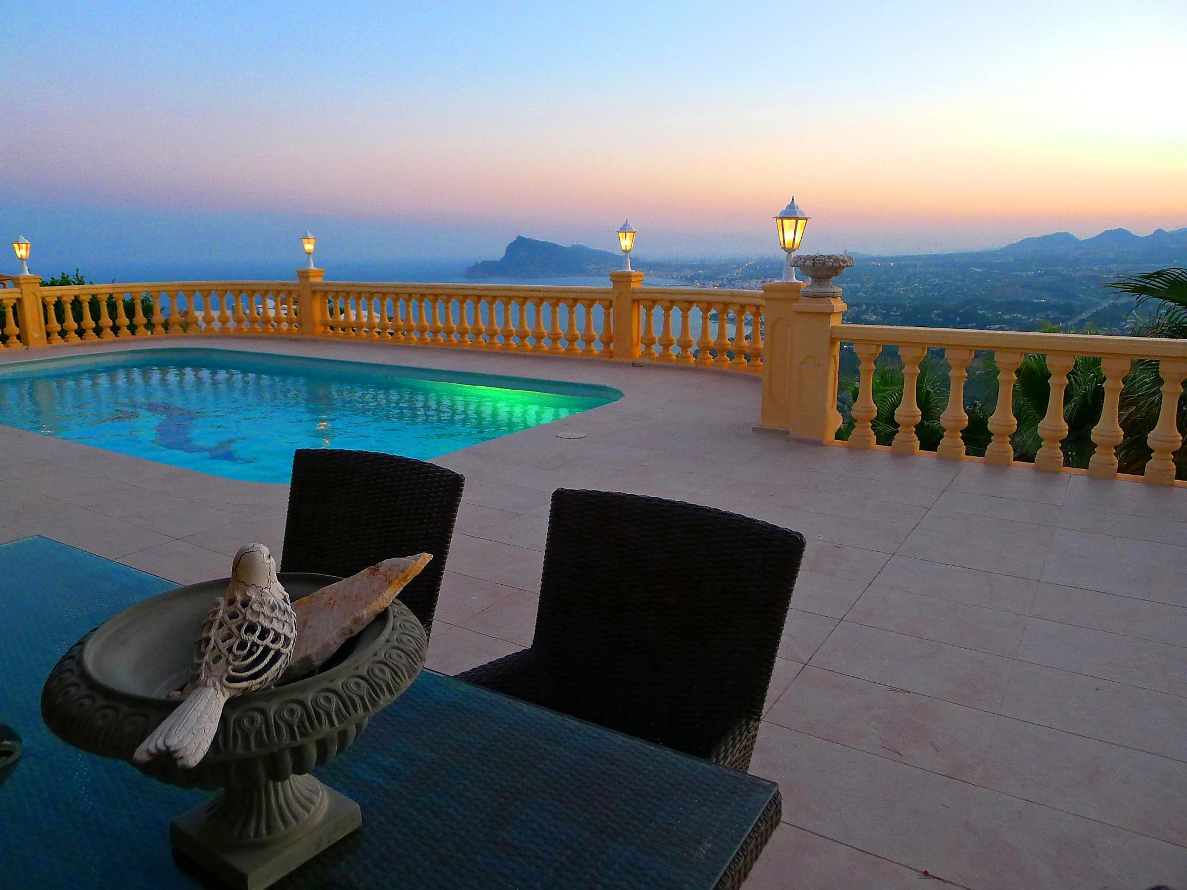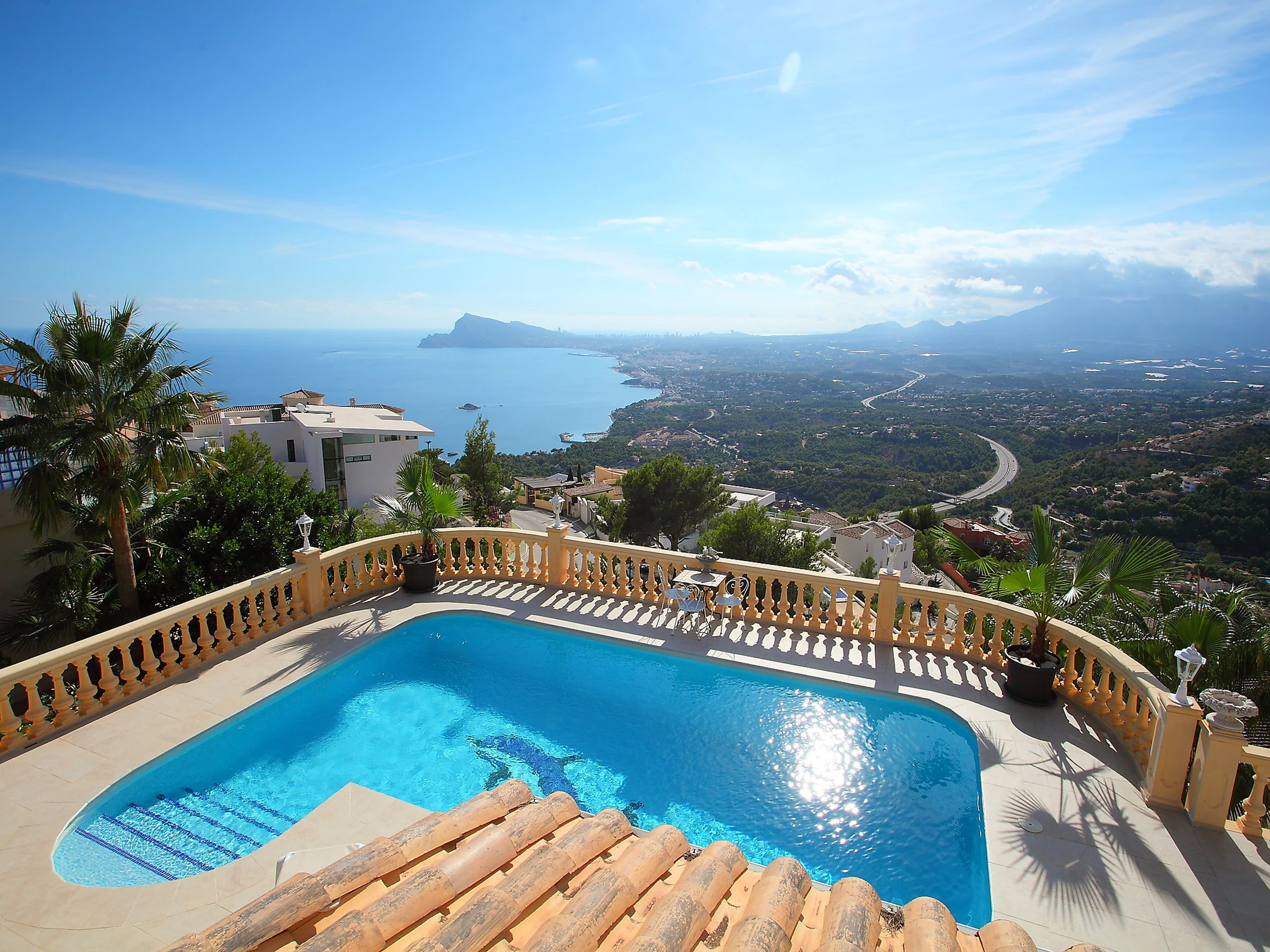 Altea Hills: Modern, very comfortable villa "Del Sol". In a sunny, elevated position, 6 km from the sea, in a cul-de-sac. Private: property 890 m2 (fenced), swimming pool (8 x 5 m, seasonal availability: [hidden] - [hidden] with internal staircase. Outdoor shower, terrace, garden furniture. Supermarket 2 km, restaurant 2 km, bar 2 km, sandy beach 6 km pebble beach 6 km. Golf course (9 hole) 4 km, tennis 2 km. Nearby attractions: Aqualandia, Mundomar, Terra Mítica, Terra Natura, y Benidorm Palace (Benidorm). Nice view of the Sierra de Bernia, ideal for hiking.