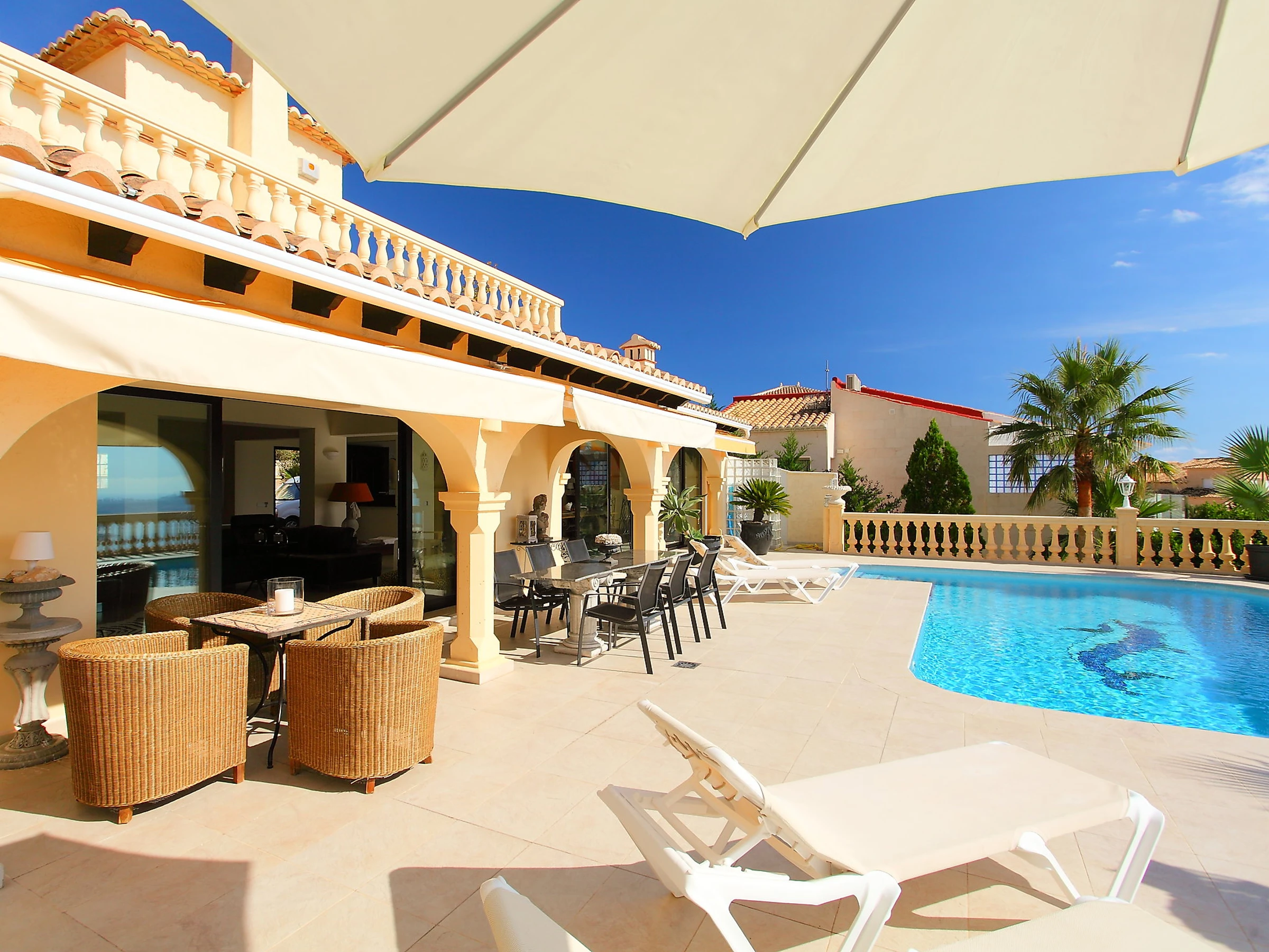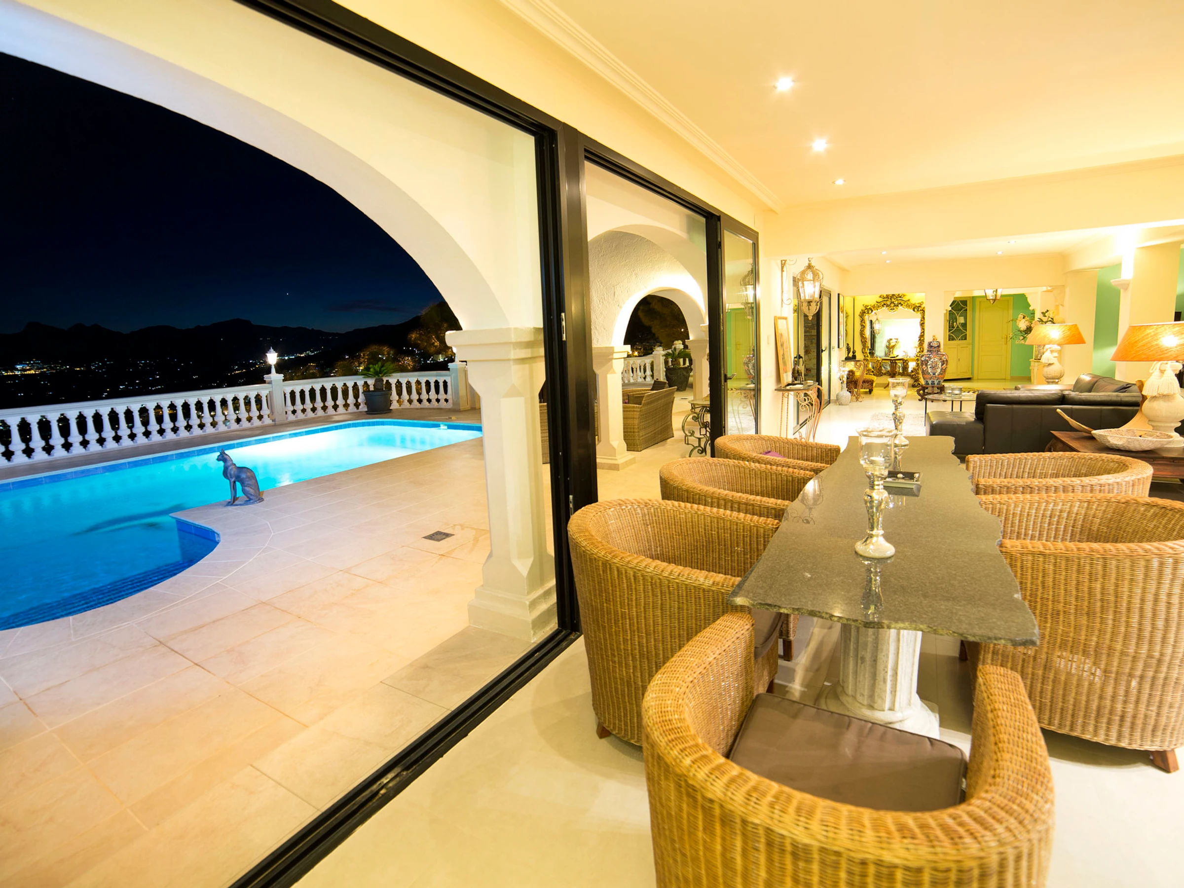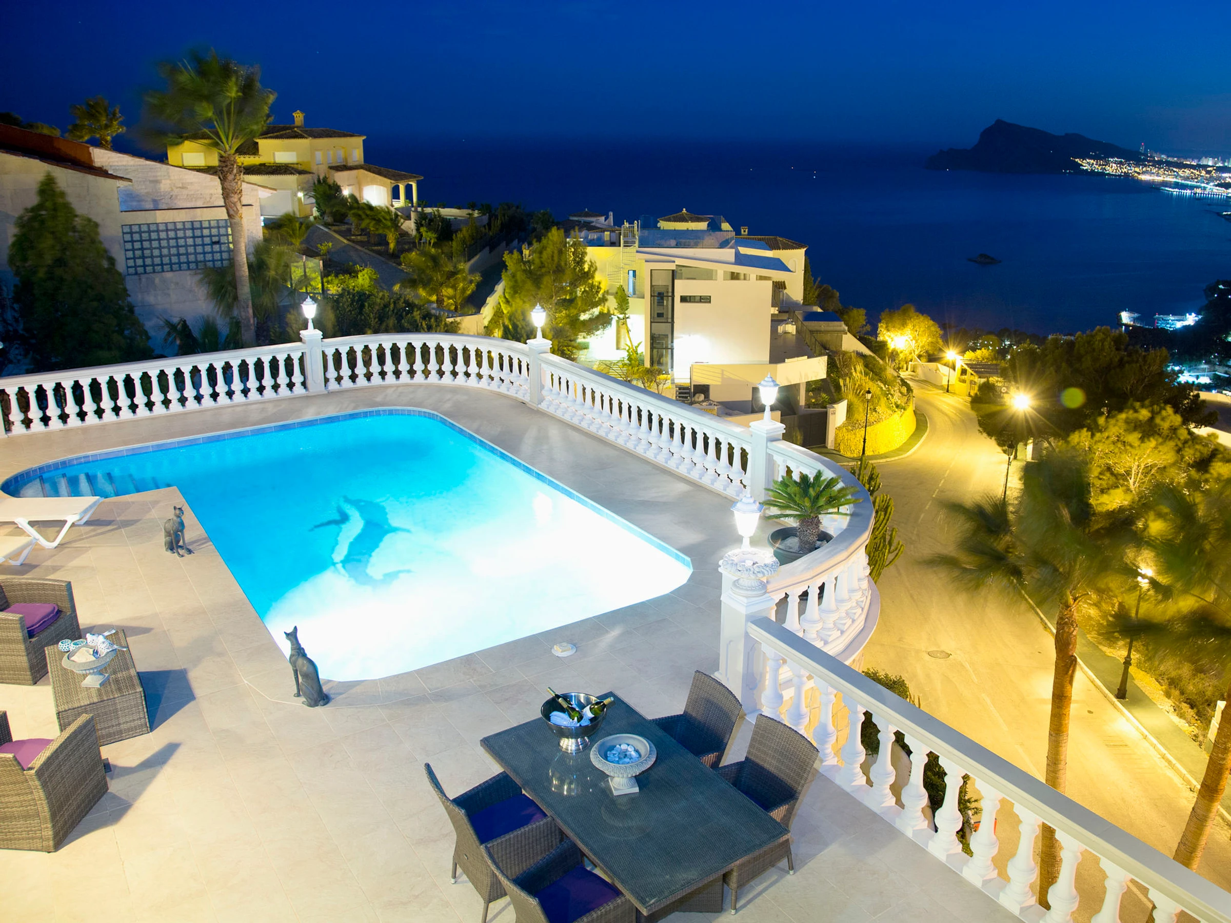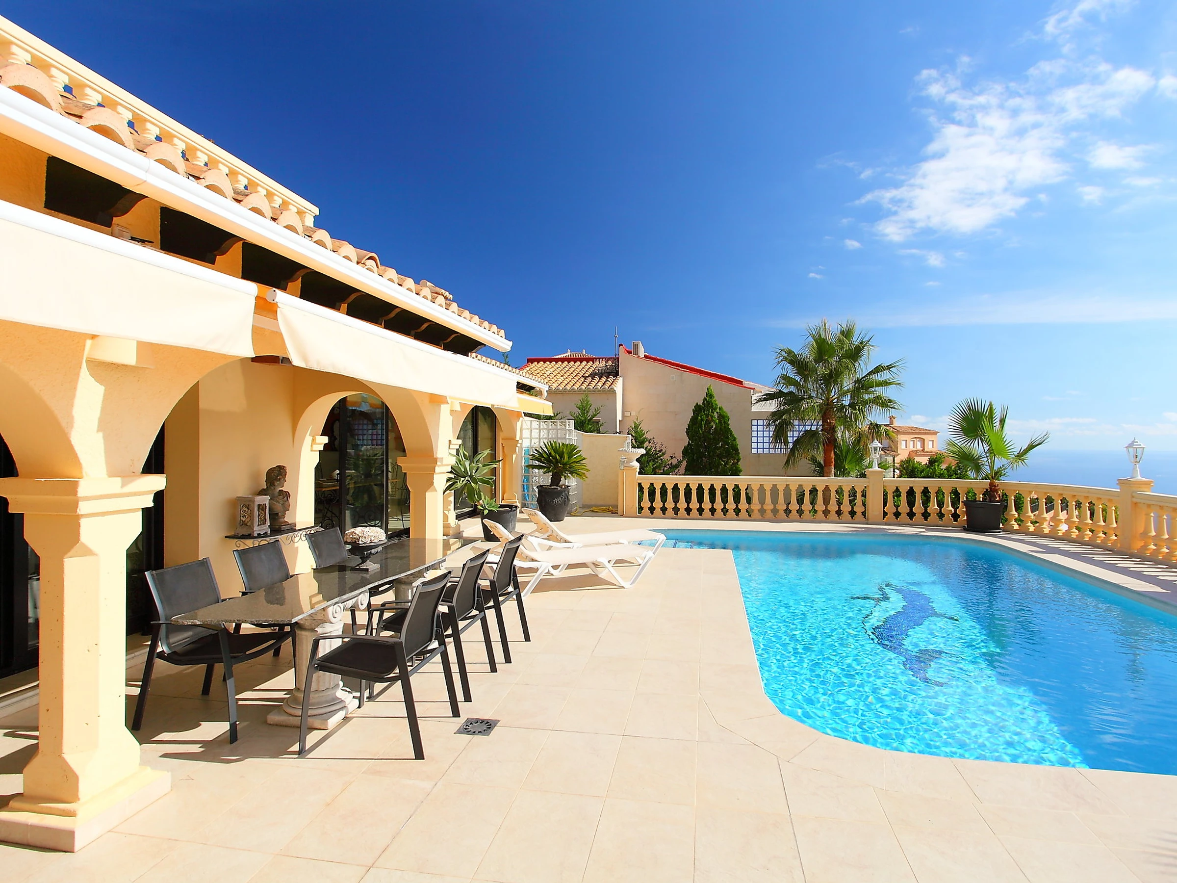 Altea Hills: Modern, very comfortable villa "Del Sol". In a sunny, elevated position, 6 km from the sea, in a cul-de-sac. Private: property 890 m2 (fenced), swimming pool (8 x 5 m, seasonal availability: [hidden] - [hidden] with internal staircase. Outdoor shower, terrace, garden furniture. Supermarket 2 km, restaurant 2 km, bar 2 km, sandy beach 6 km pebble beach 6 km. Golf course (9 hole) 4 km, tennis 2 km. Nearby attractions: Aqualandia, Mundomar, Terra Mítica, Terra Natura, y Benidorm Palace (Benidorm). Nice view of the Sierra de Bernia, ideal for hiking.