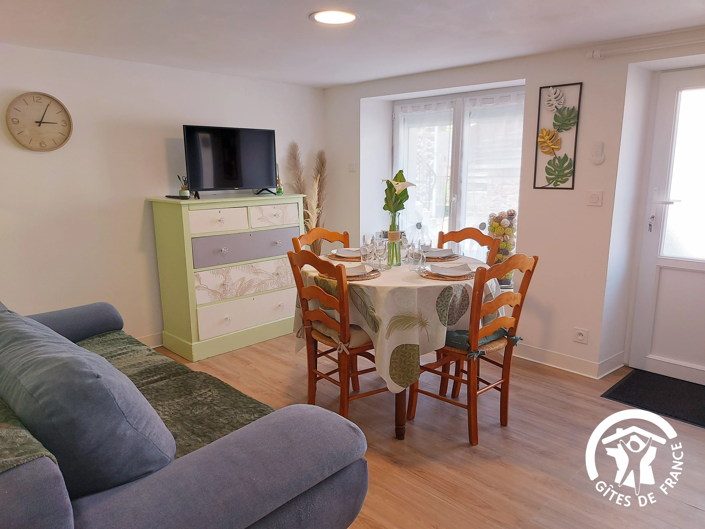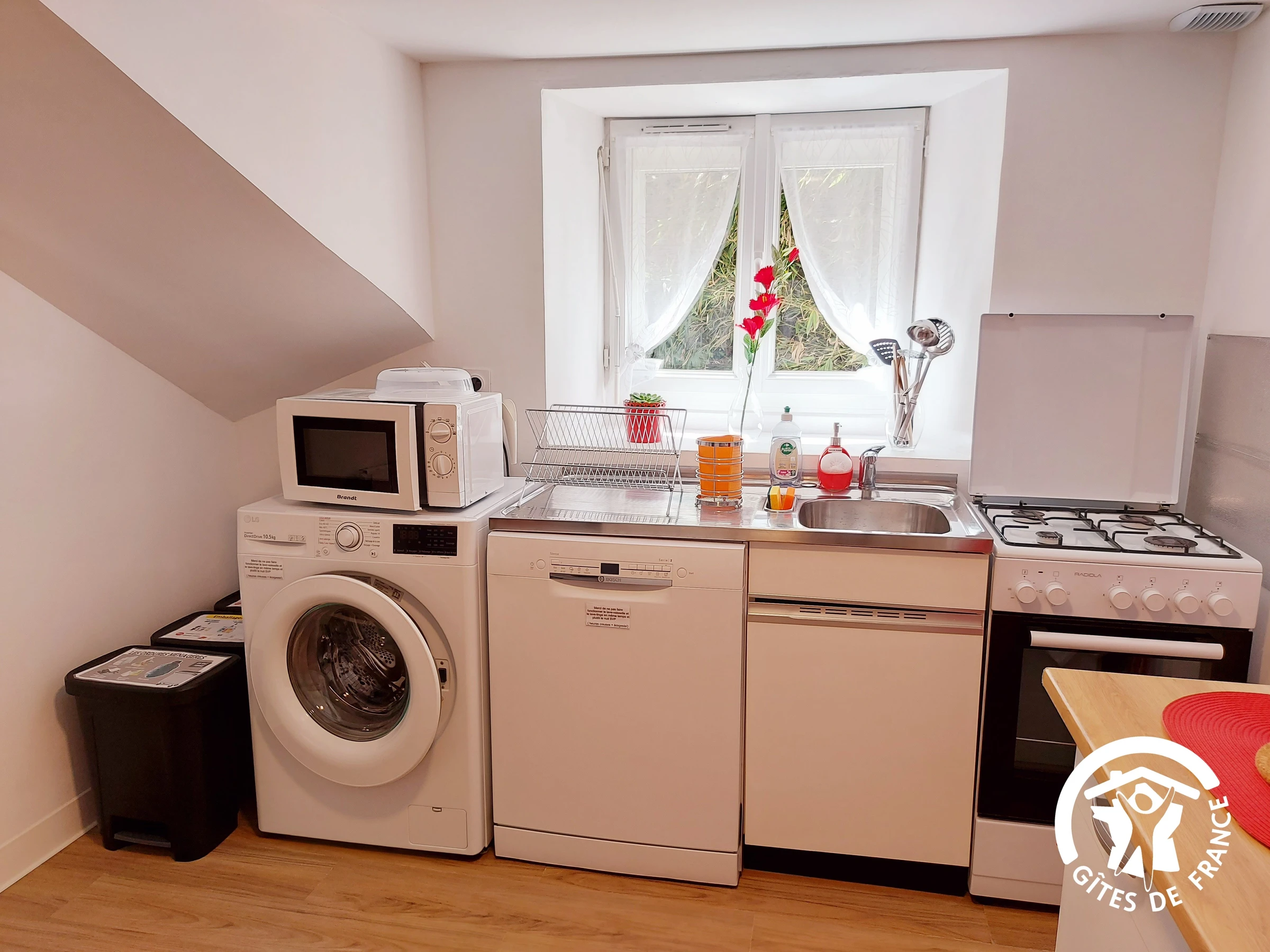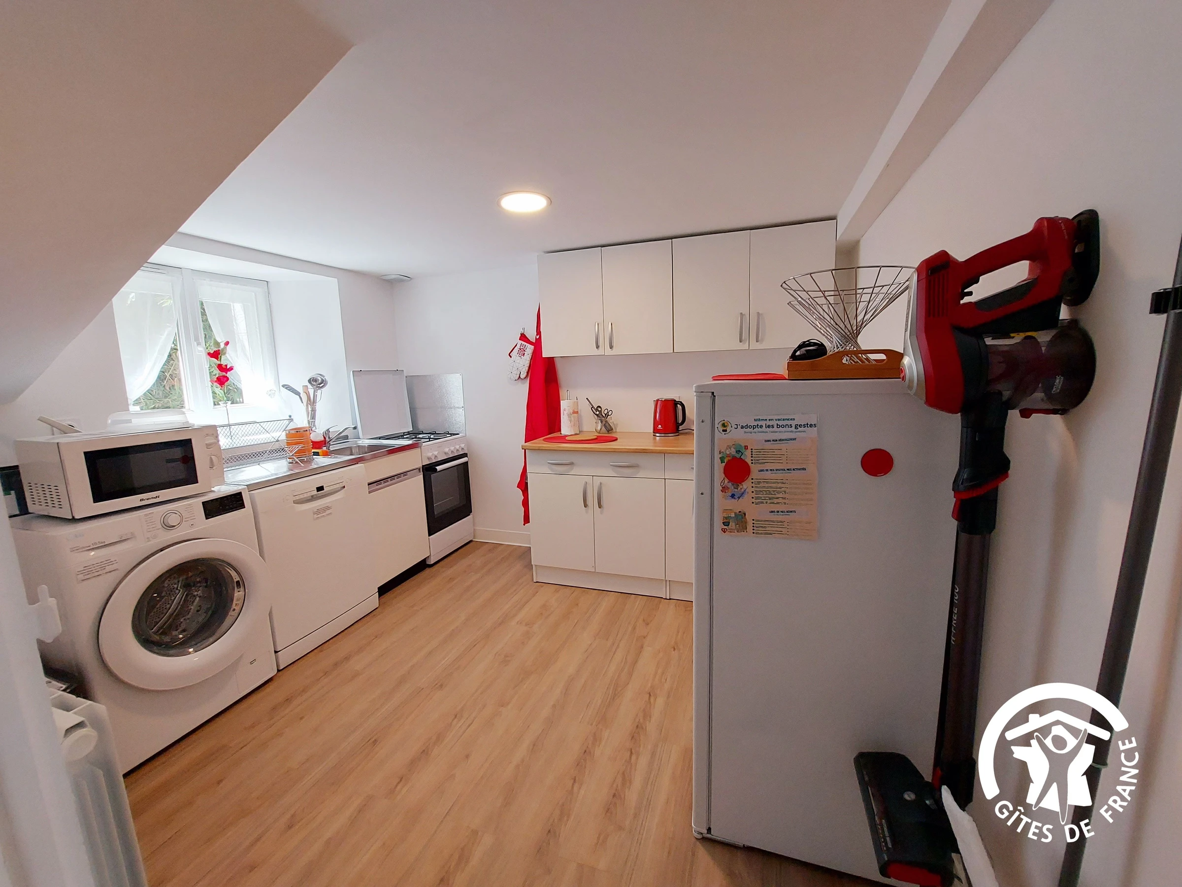 3-night stay or more: arrival 6 pm - departure 11 am The cottage is located at the entrance to the village of Andouillé, a town of 2,300 inhabitants, 500 meters from shops and amenities. On the ground floor, with a ceiling height of 1.95 m, there is a 12.1 m² living room with a dining table and chairs, a sofa bed, and a TV. The 8.3 m² kitchen includes a dishwasher, refrigerator and freezer compartment, a 4-burner gas stove and electric oven, a microwave, a kettle, a Senseo coffee machine, a food processor, and a washing machine. 1st floor, standard ceiling height: 13.7m² bedroom with 1 queen-size bed, wardrobe, and desk - 5.6m² bathroom with shower, sink, hairdryer, towel dryer, and clothes horse.