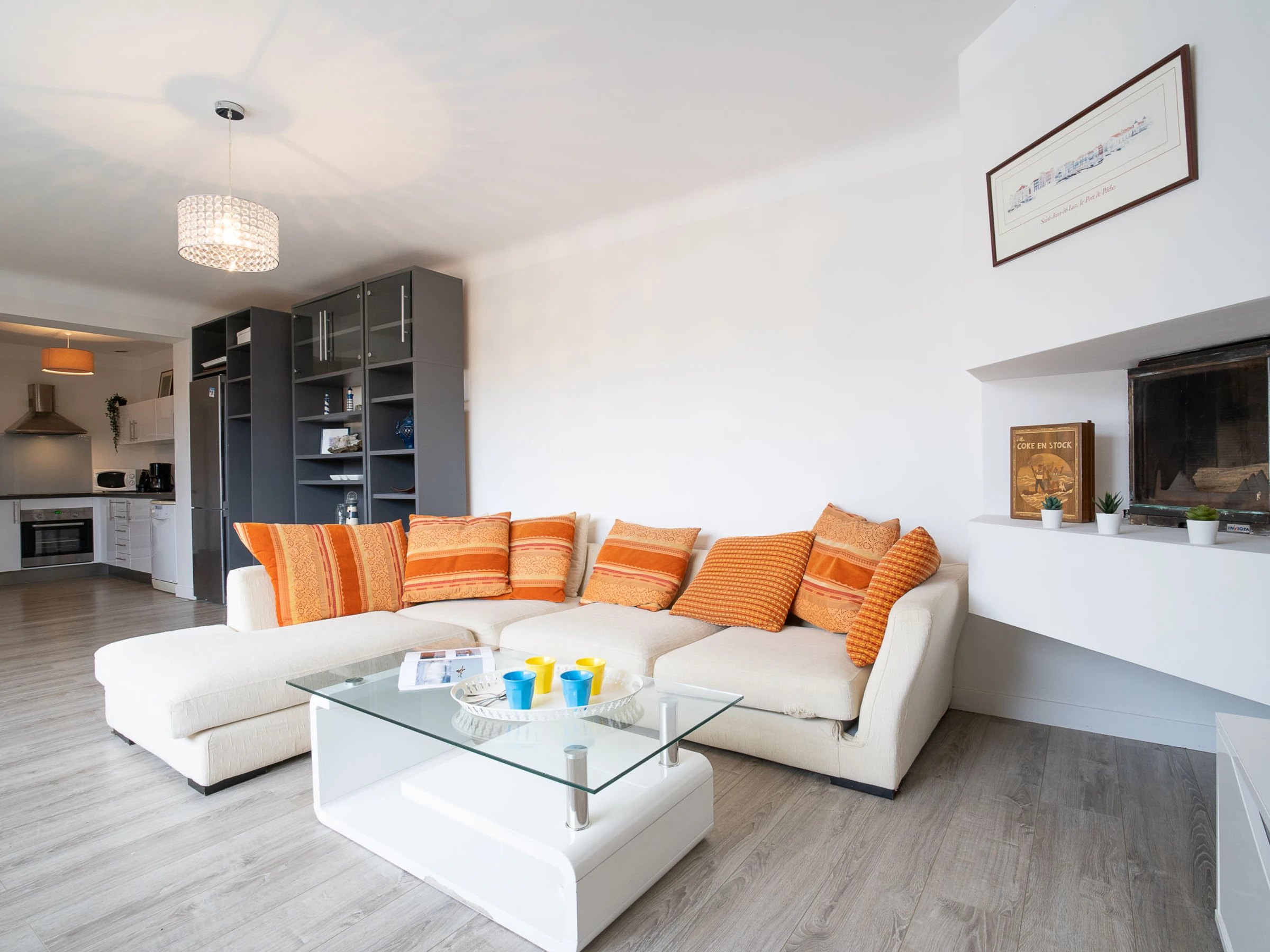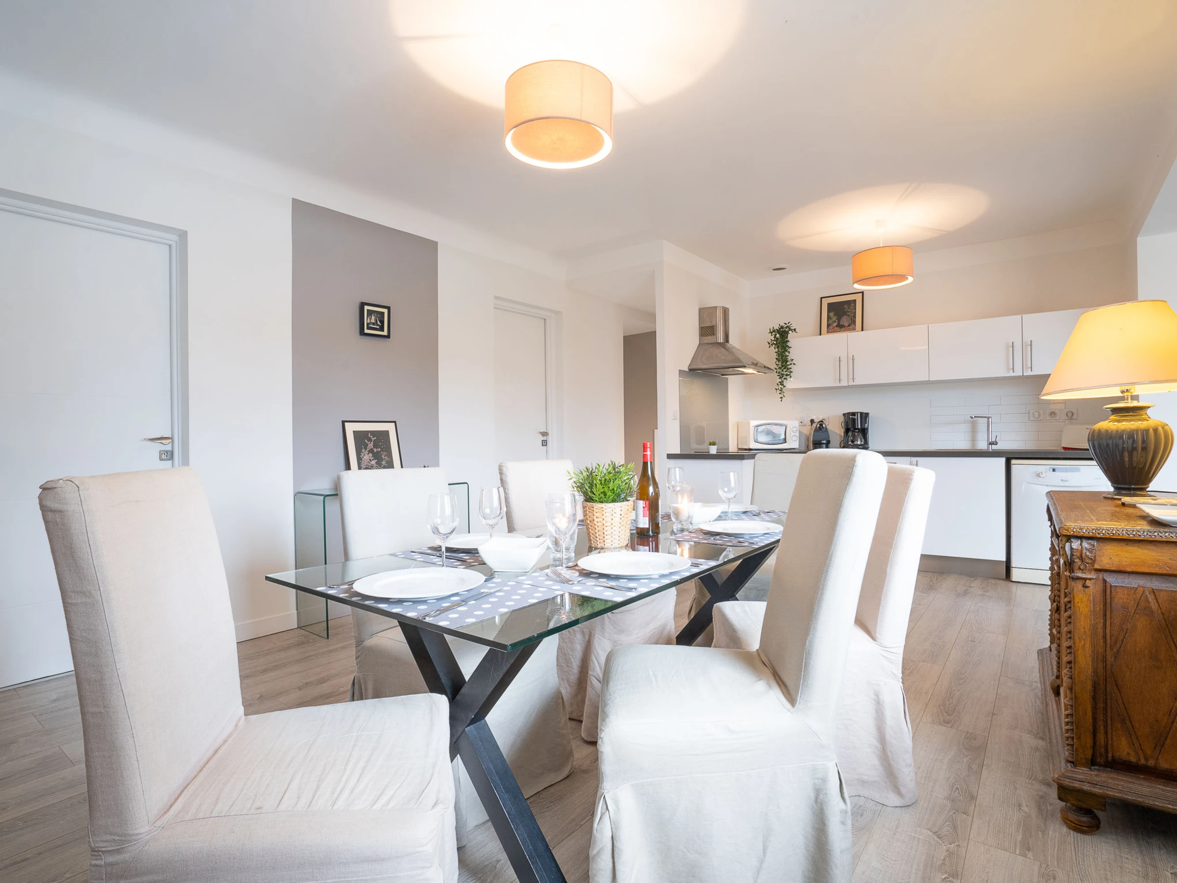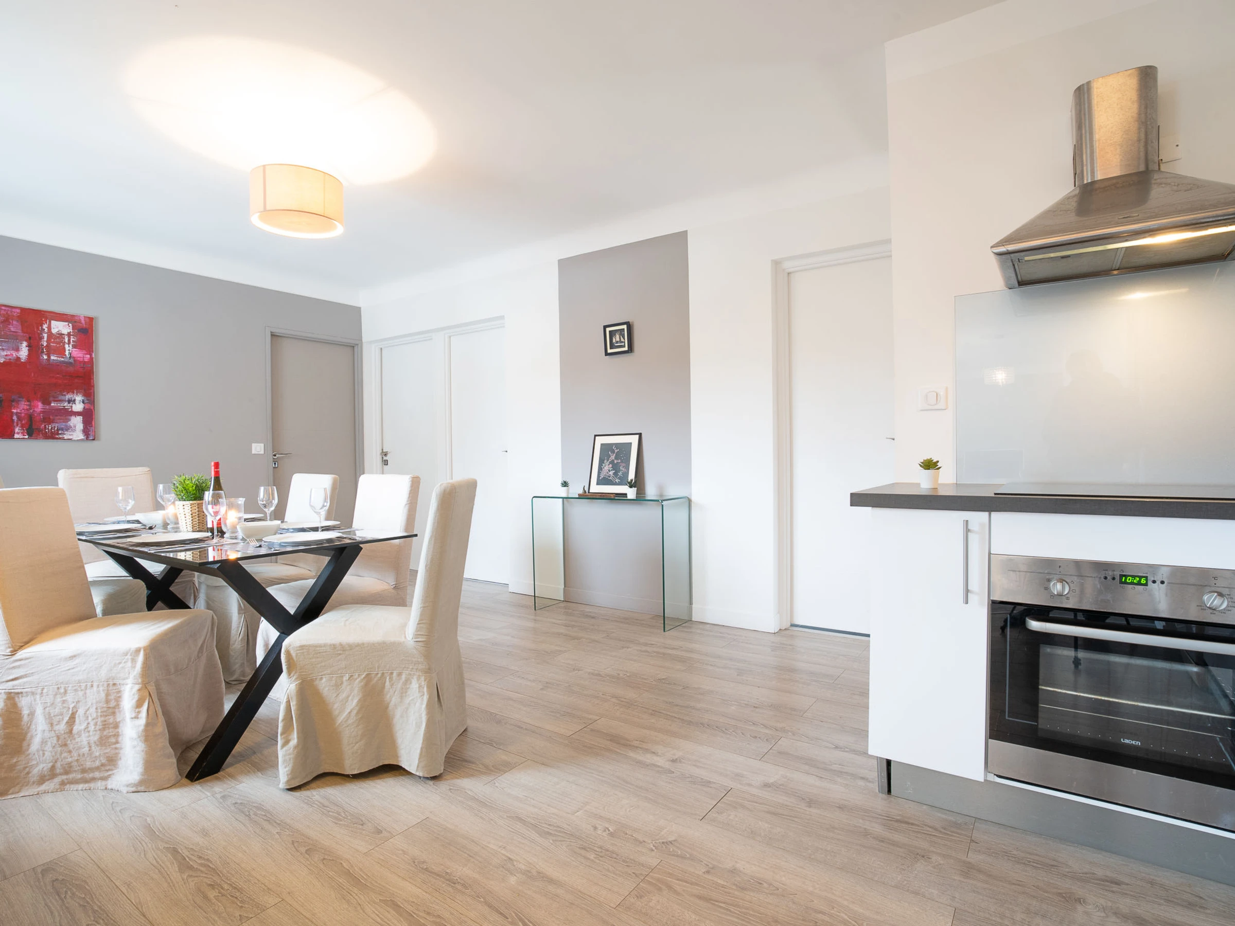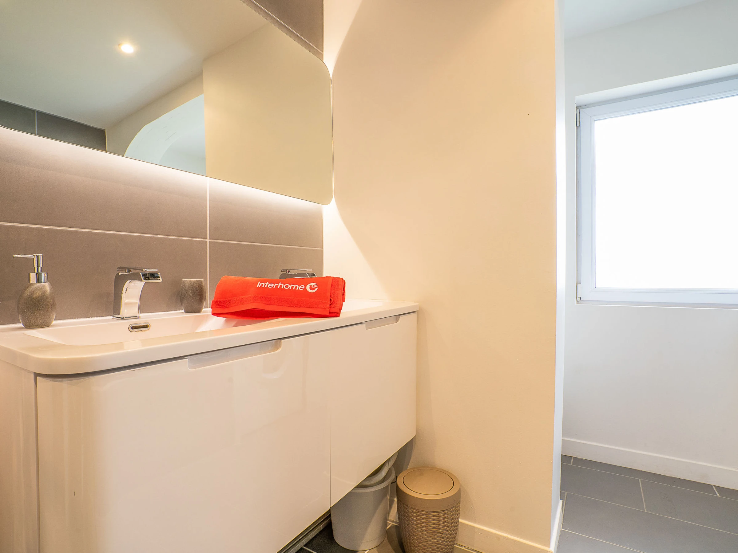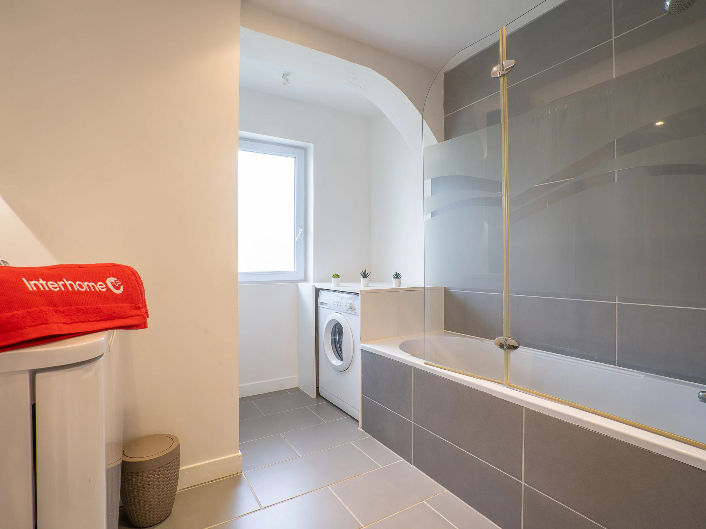 4-room apartment 85 m2 on 2 levels. Comfortable and modern furnishings: dining room. Living room with TV and flat screen. Exit south facing position. 1 room with 1 x 2 bunk beds (90 cm, length 190 cm). 1 room with 1 french bed (1 x 140 cm, length 190 cm). 1 room with 1 french bed (1 x 140 cm, length 190 cm). Exit to the balcony. Open kitchen (oven, dishwasher, 4 ceramic glass hob hotplates, microwave, electric coffee machine, Capsules for coffee machine (Nespresso) extra). Bath/WC, double hand-basin. Electric heating. On the lower ground floor: entrance hall with separate WC. Large terrace 15 m2. Terrace furniture, barbecue. Facilities: washing machine, iron, hair dryer. Internet (WiFi, free). Reserved parking (fenced). Please note: 1 pet/ dog allowed. Smoke alarm. [hidden]