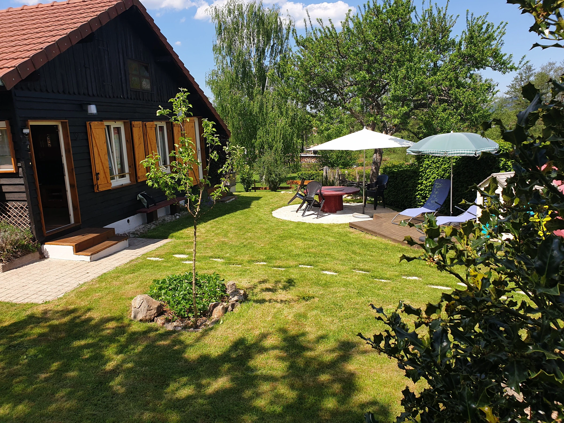 Exterior: A private, enclosed garden with garden furniture, sun loungers, a barbecue, a parasol, and outdoor games (playhouse, badminton rackets, pétanque balls, etc.).