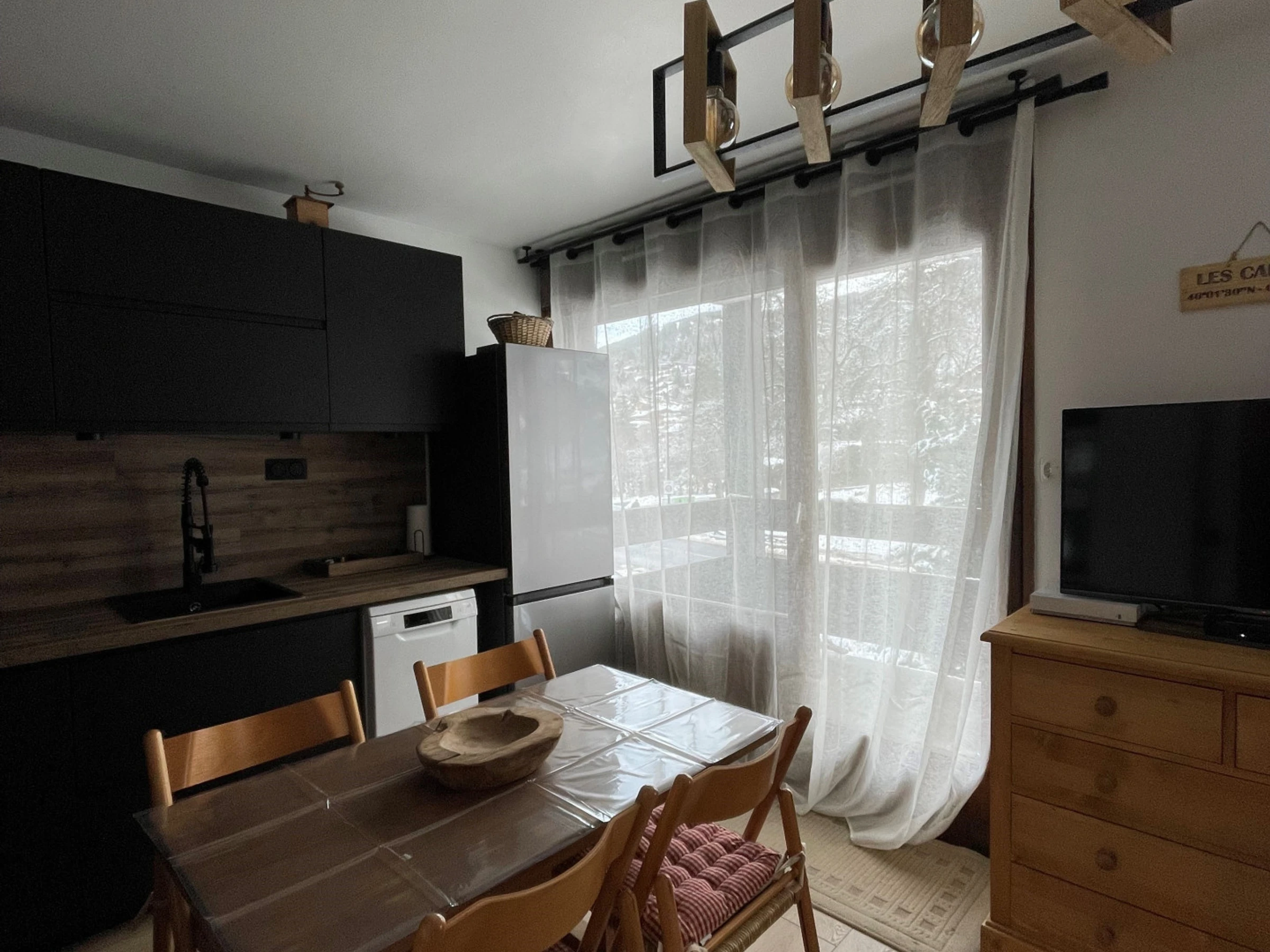 Open plan kitchen, Glass ceramic hob, Filter coffee pot, Coffee machine NESPRESSO, Dishwasher, Fondue set, Large Fridge, Electric kettle, Microwave, Oven, Raclette set, Toaster