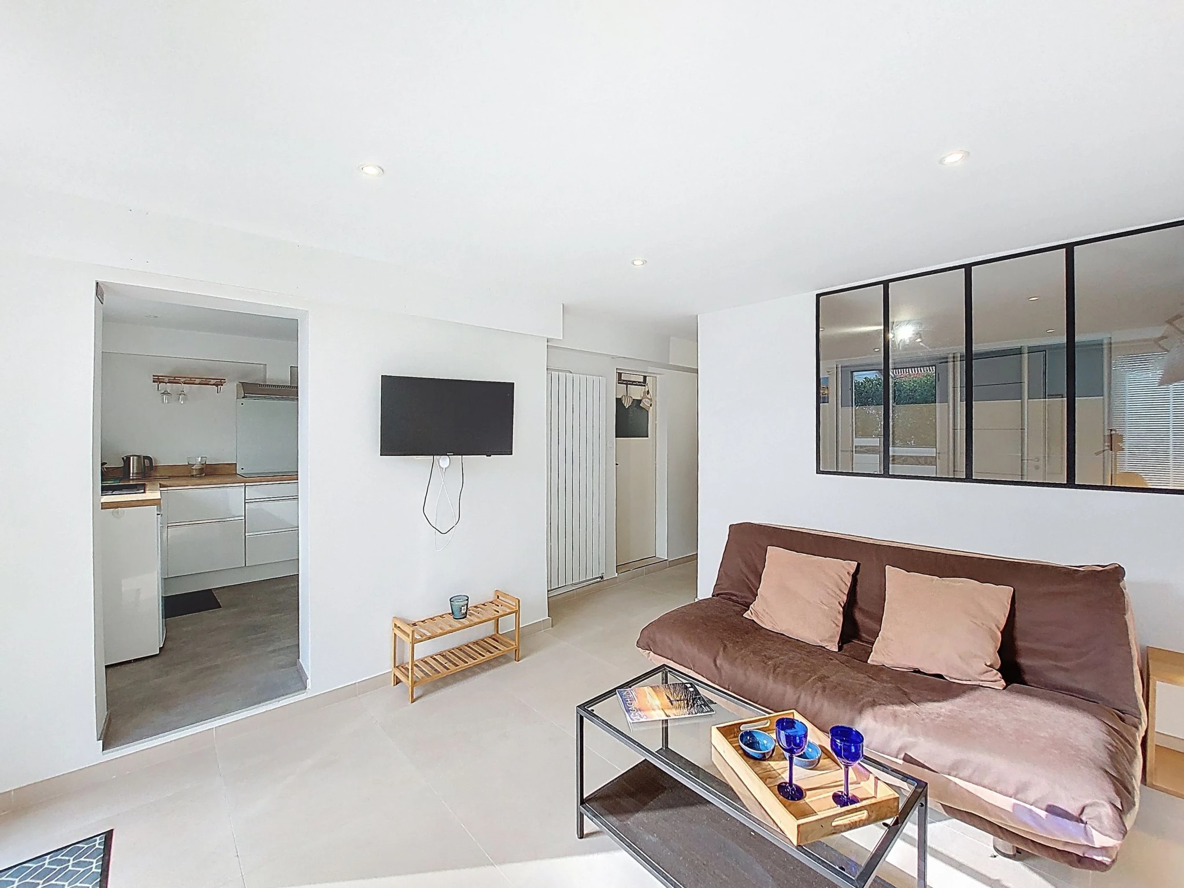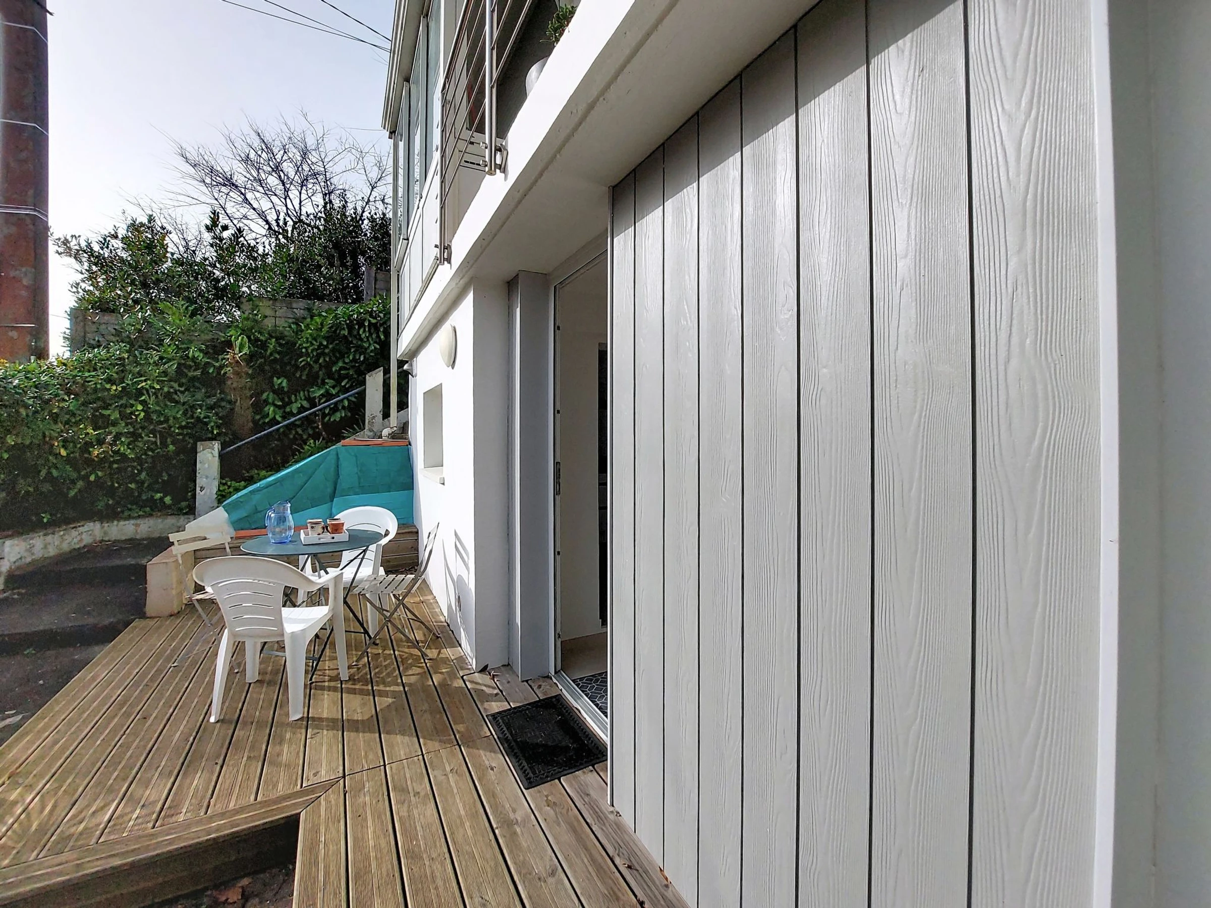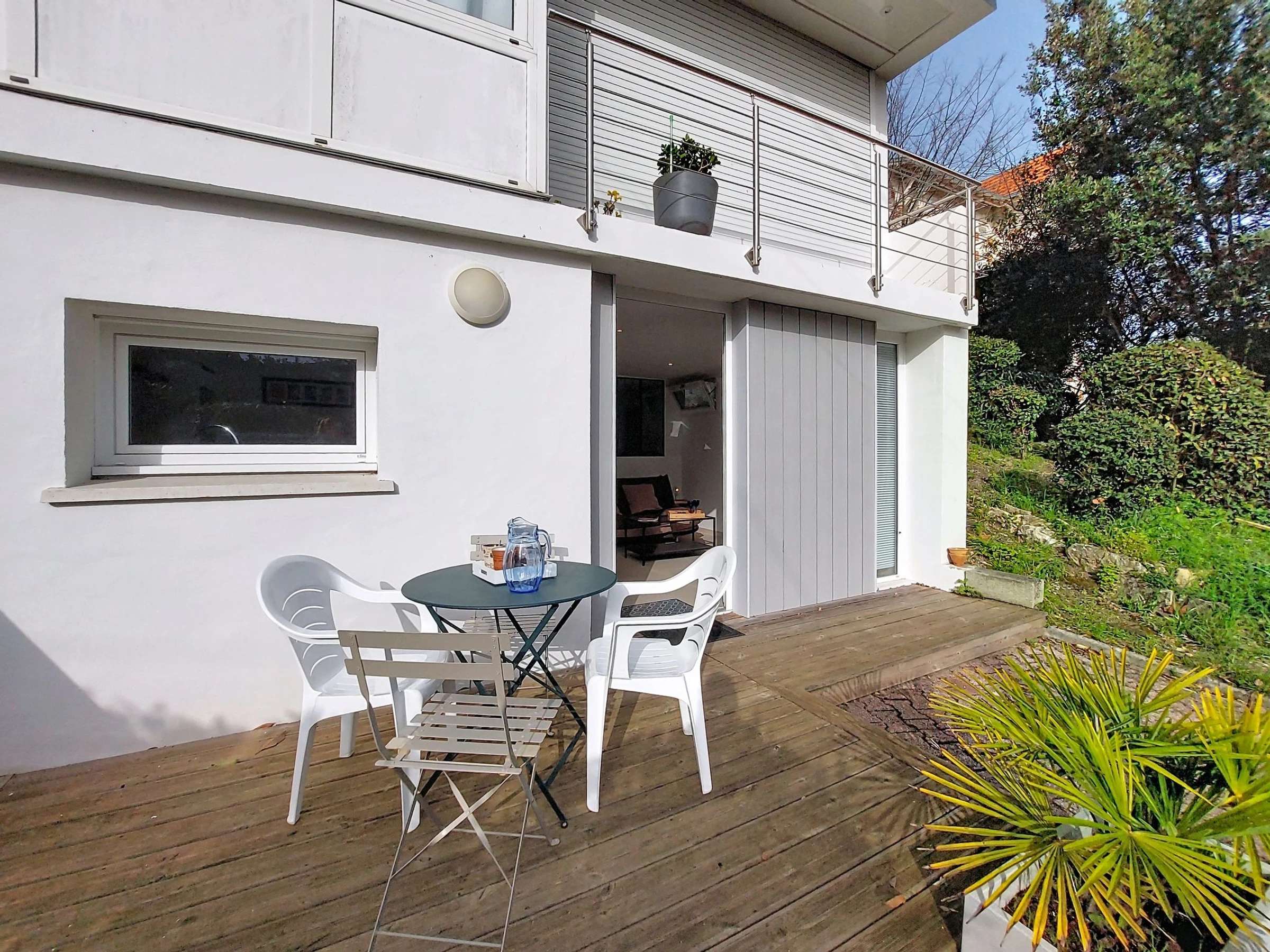 1-room apartment 35 m2, on the ground floor. Comfortable furnishings: living/dining room with 1 double sofabed (1 x 160 cm, length 200 cm), TV (flat screen). Walk-through room with 1 french bed (1 x 160 cm, length 200 cm). Kitchen (oven, 3 induction hot plates, toaster, kettle, microwave, electric coffee machine). Shower, sep. WC. Gas heating. Terrace 12 m2, south facing position and, east facing position. Terrace furniture. Facilities: hair dryer. Internet (WiFi, free). Parking. Please note: smoke alarm. Offer by a private individual according to  Art. 155, IV of CGI. [hidden]