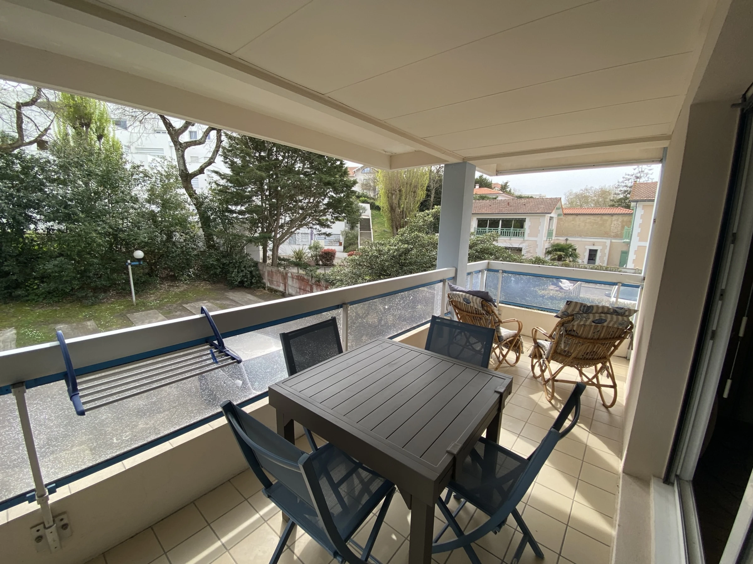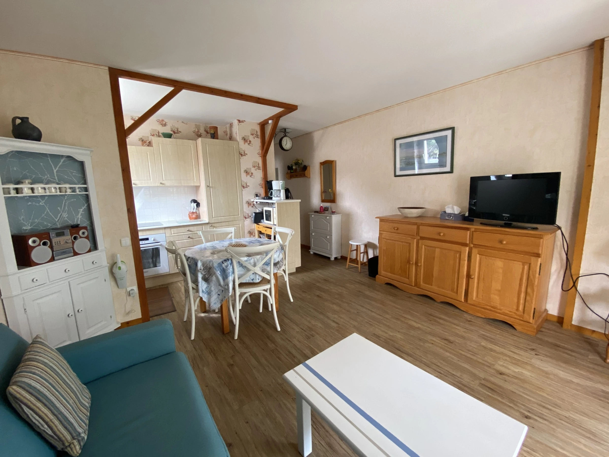 The apartment consists of a large living room opening on one side onto an open equipped kitchen (fridge-freezer, induction hob, extractor hood, filter coffee maker + Senseo coffee maker, oven) with a table and 4 chairs and on the other side a lounge area with a sofa bed (140cm) a coffee table, a flat screen TV and a stereo. The living room also opens onto a beautiful terrace with outdoor furniture (a table and 4 chairs). A bedroom with a 140cm bed, a closet and an armchair. A bathroom with a shower, a sink and a closet with washing machine. Separate toilet. 1 parking space.