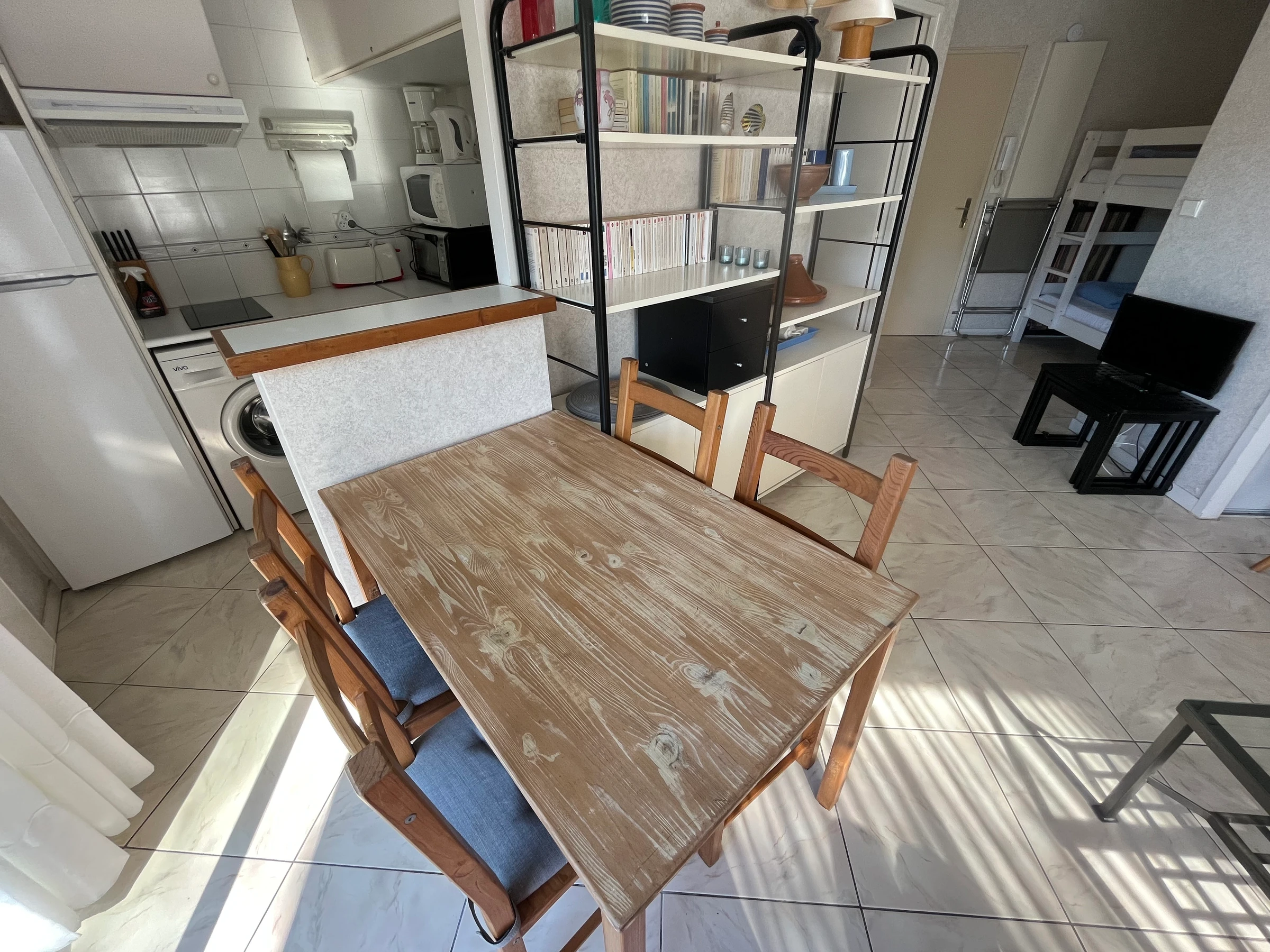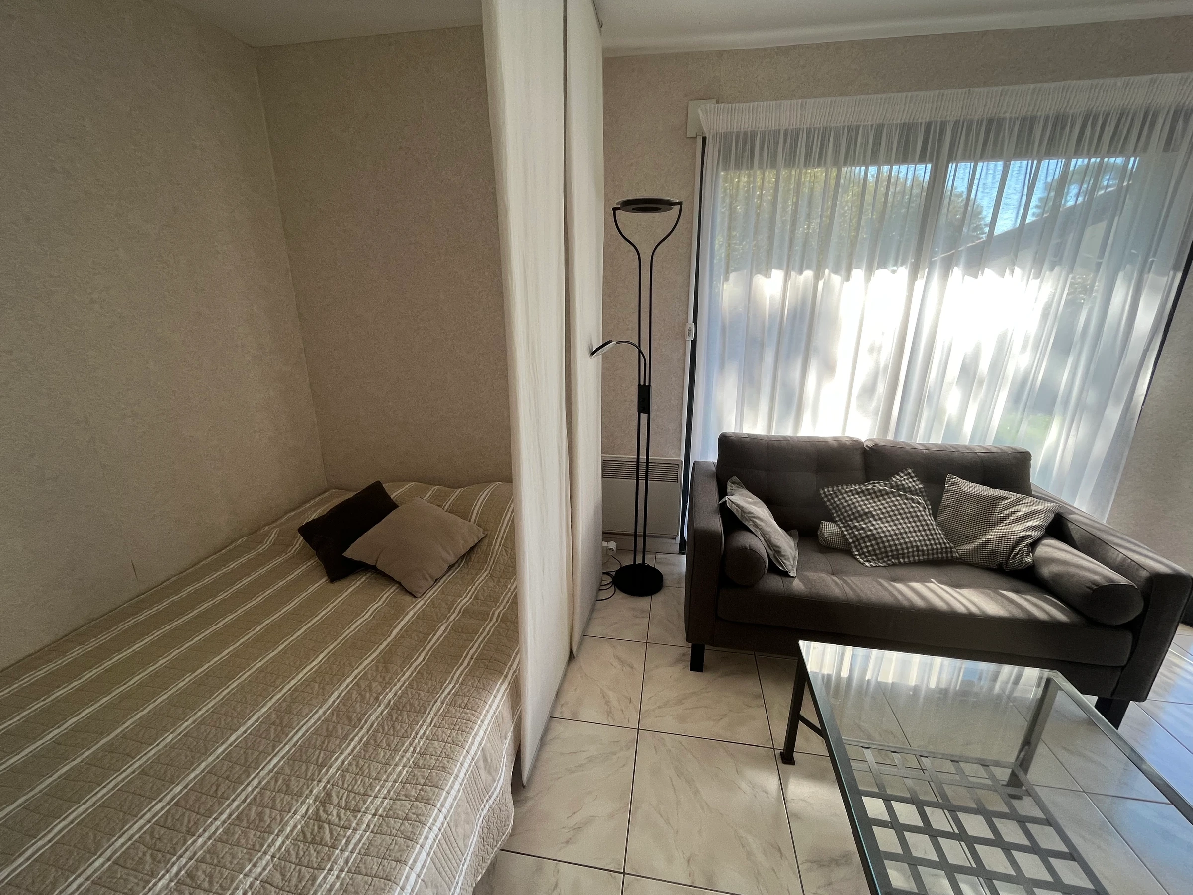 The main room has a sleeping area with a double bed (140 cm) for two people, allowing you to relax after a day exploring our beautiful city of Arcachon. It also includes a wardrobe, a living area with TV and Wi-Fi, and a small dining area opening onto the terrace.