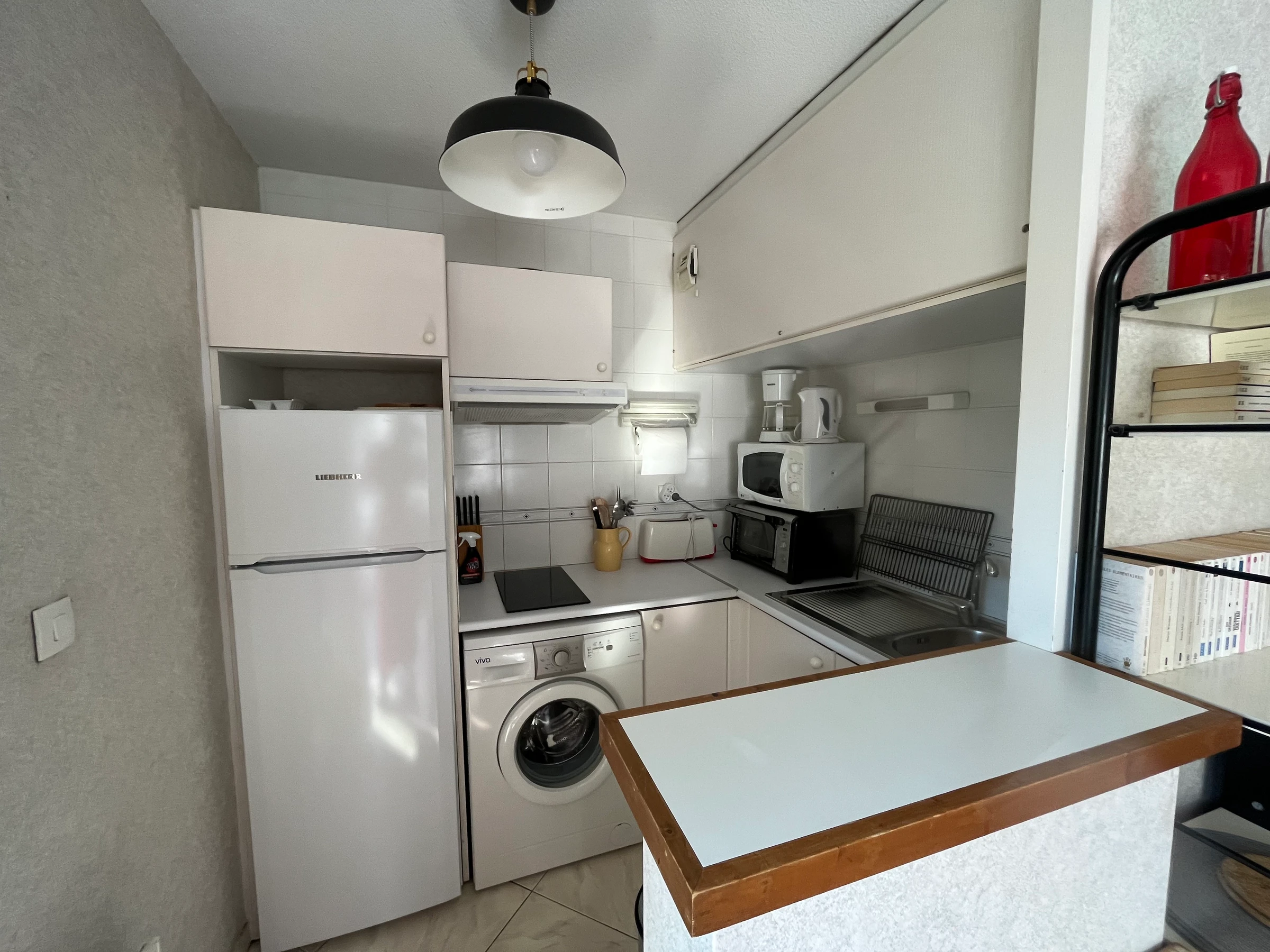 A small, fully equipped open-plan kitchen includes a refrigerator/freezer, oven, stovetop, washing machine, and microwave.
