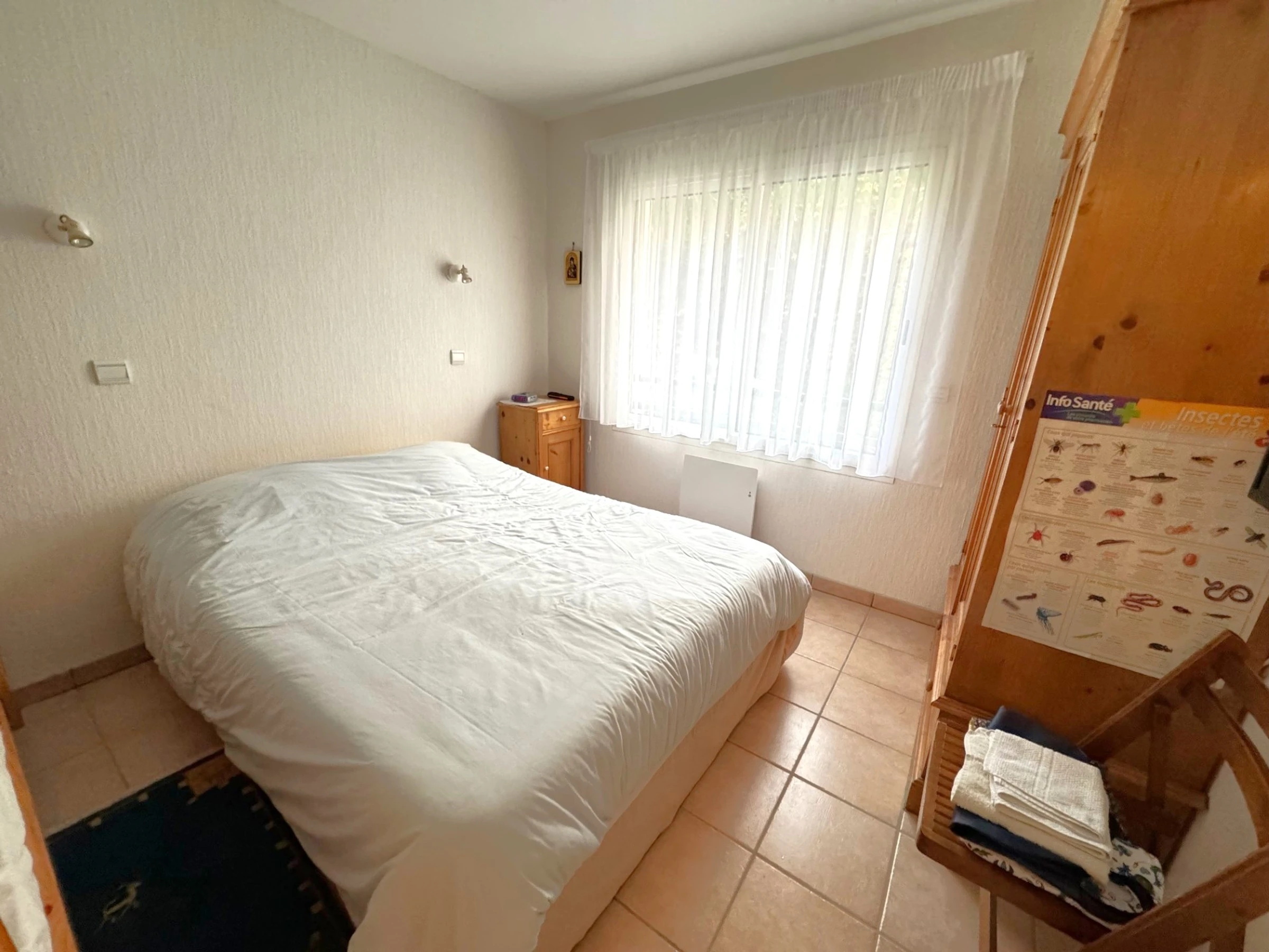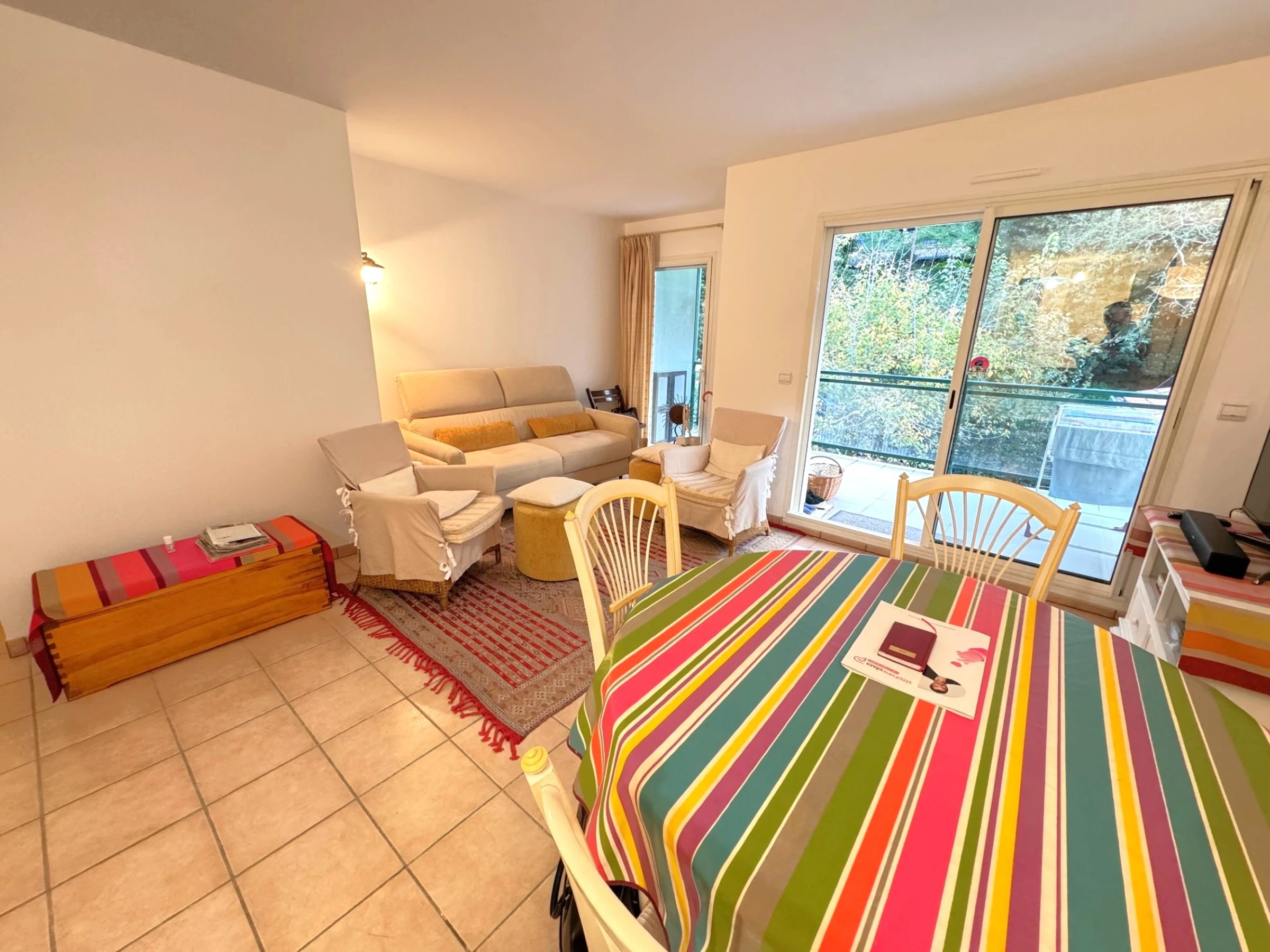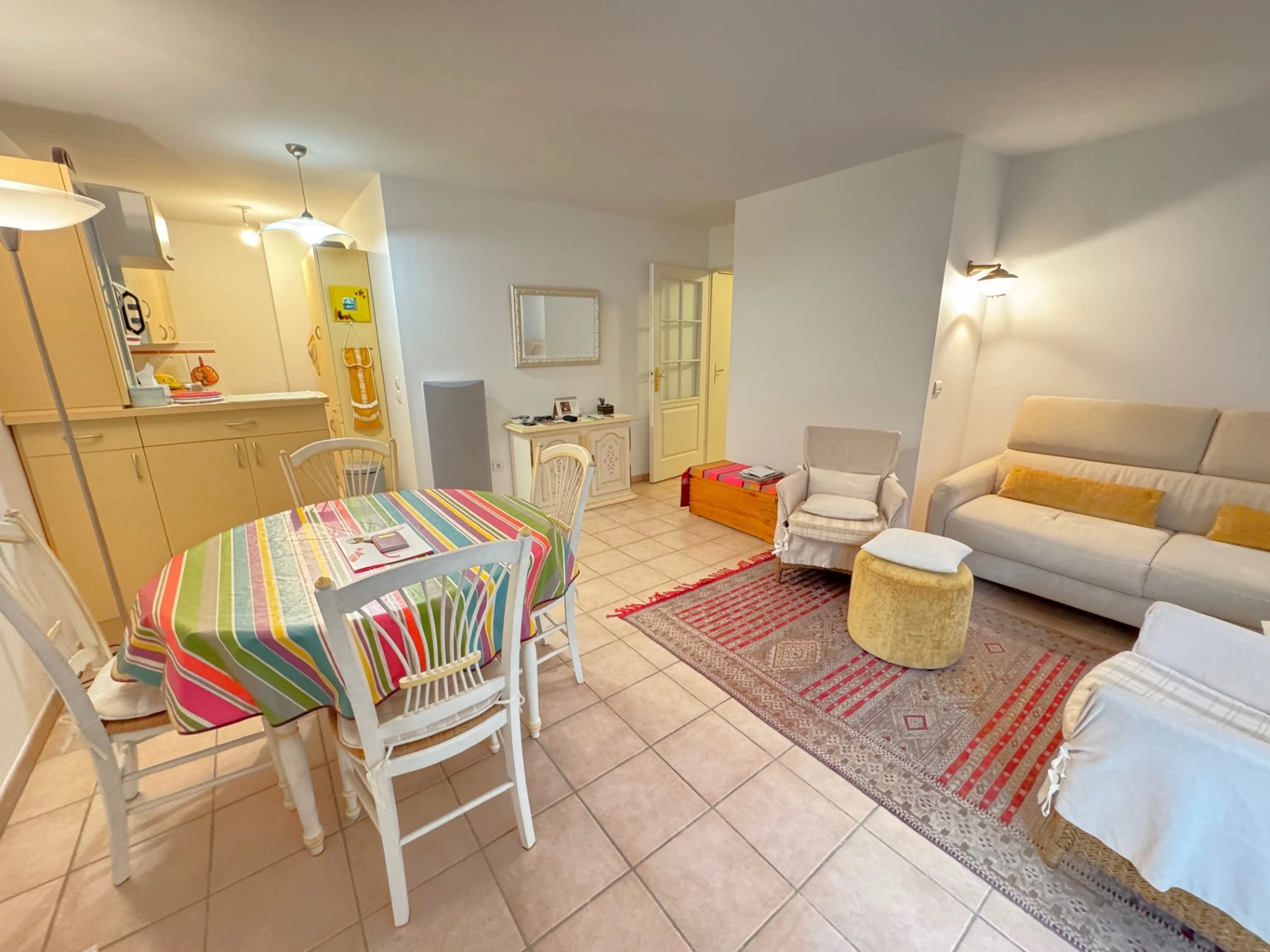 This charming, bright, quiet 2-room apartment on the 3rd floor with elevator sleeps 4. It includes an entrance hall, a living room with a sofa bed, TV, dining area, and an open-plan kitchen equipped with ceramic hob, oven, microwave, dishwasher, and washing machine. A bedroom with a 140cm bed, a bathroom, and a separate toilet. A 10m² south-facing terrace. A garage. Cleaning included. Linens are not provided; they can be rented. For example, a 90cm sheet and towel pack is €30 per week; a 140cm sheet and towel pack for two people is €40 per week; a 160cm sheet and towel pack for two people is €45 per week. Rates are reduced for multiple weeks.