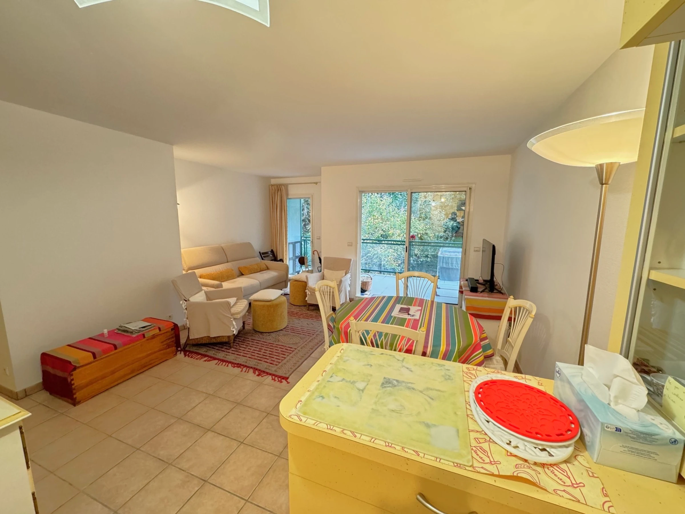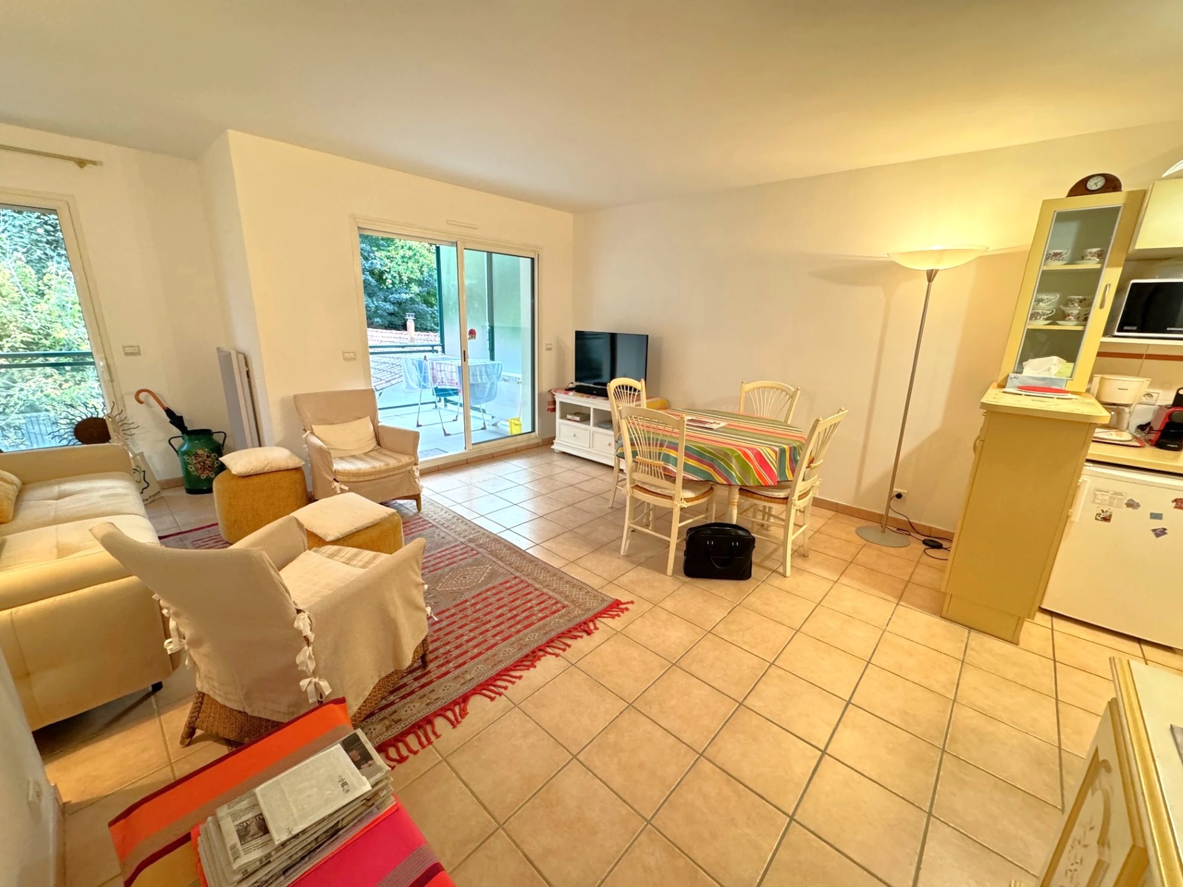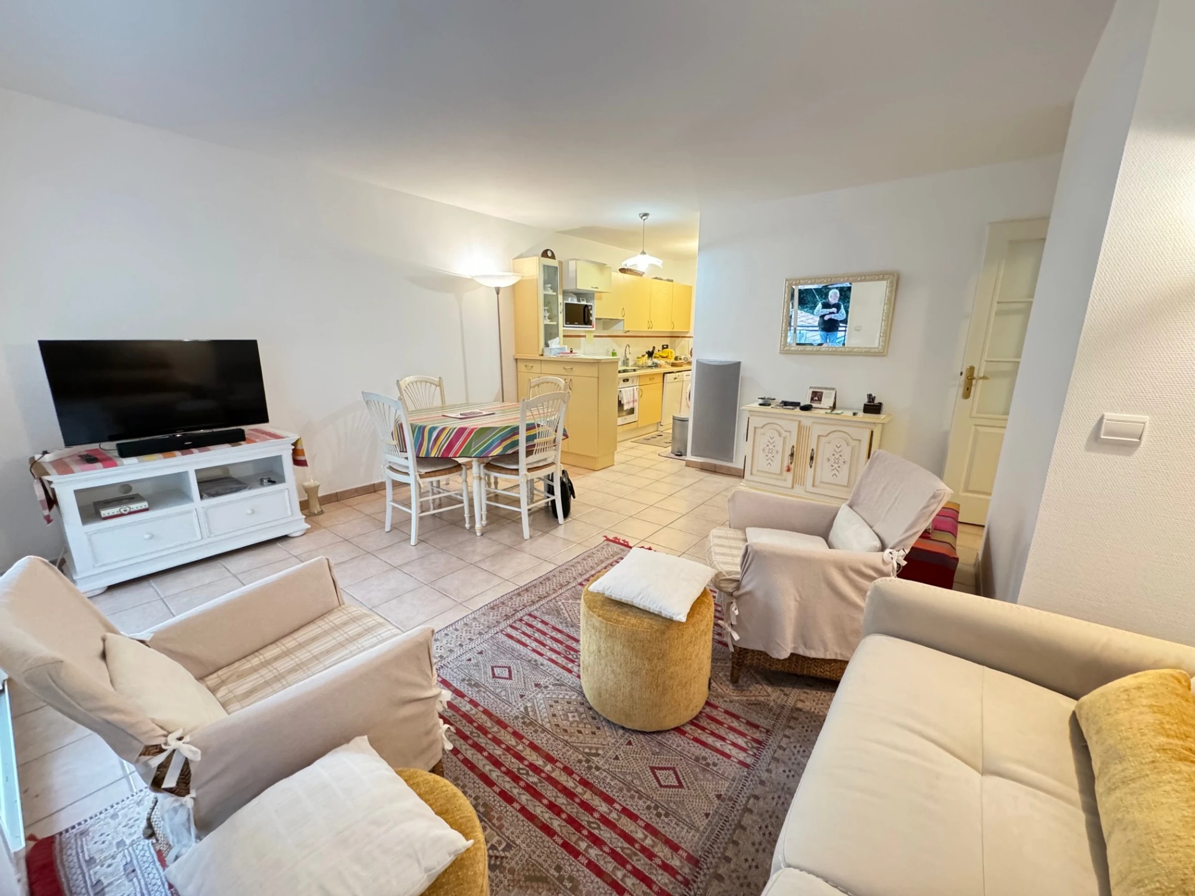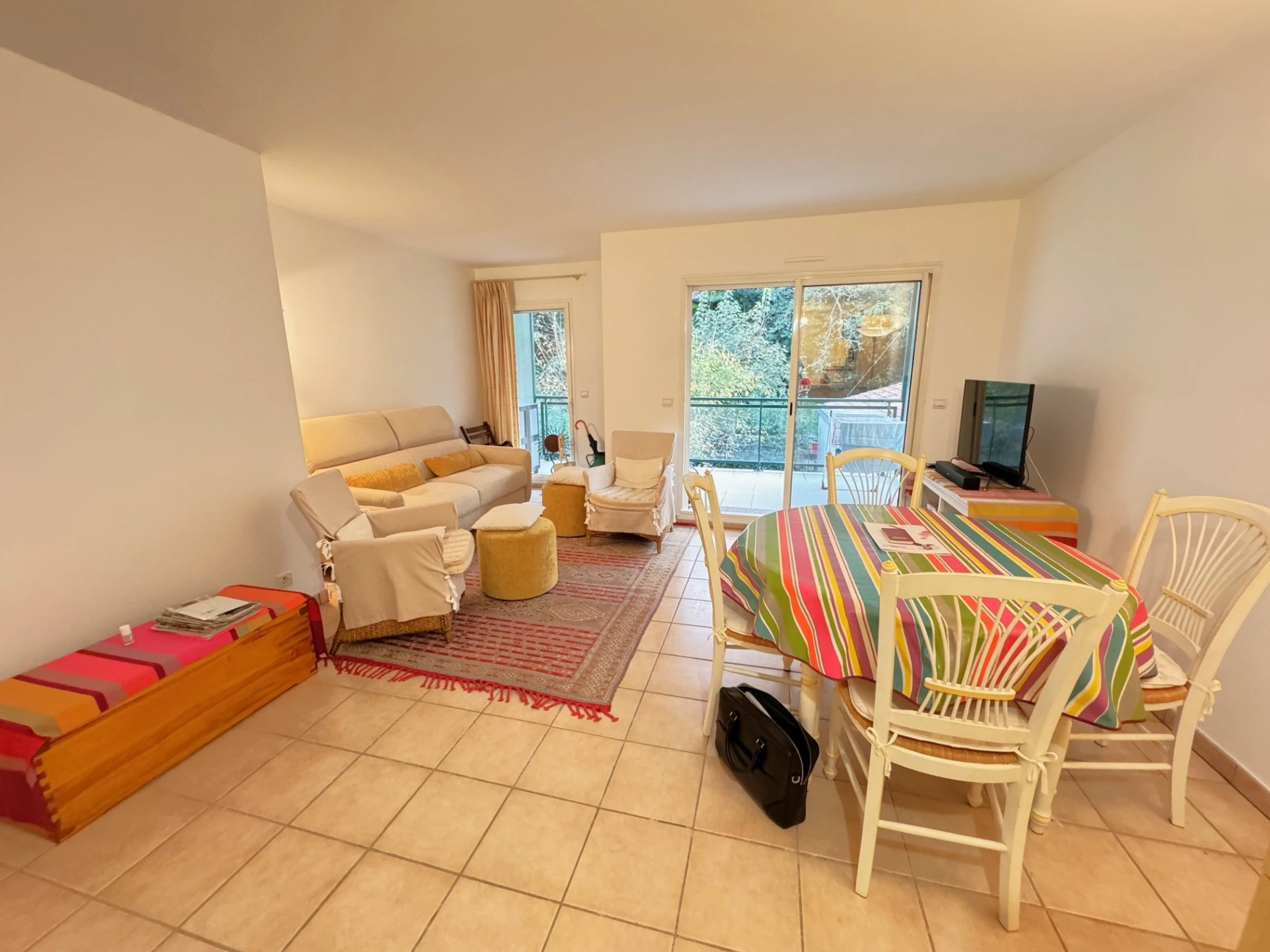 This charming, bright, quiet 2-room apartment on the 3rd floor with elevator sleeps 4. It includes an entrance hall, a living room with a sofa bed, TV, dining area, and an open-plan kitchen equipped with ceramic hob, oven, microwave, dishwasher, and washing machine. A bedroom with a 140cm bed, a bathroom, and a separate toilet. A 10m² south-facing terrace. A garage. Cleaning included. Linens are not provided; they can be rented. For example, a 90cm sheet and towel pack is €30 per week; a 140cm sheet and towel pack for two people is €40 per week; a 160cm sheet and towel pack for two people is €45 per week. Rates are reduced for multiple weeks.