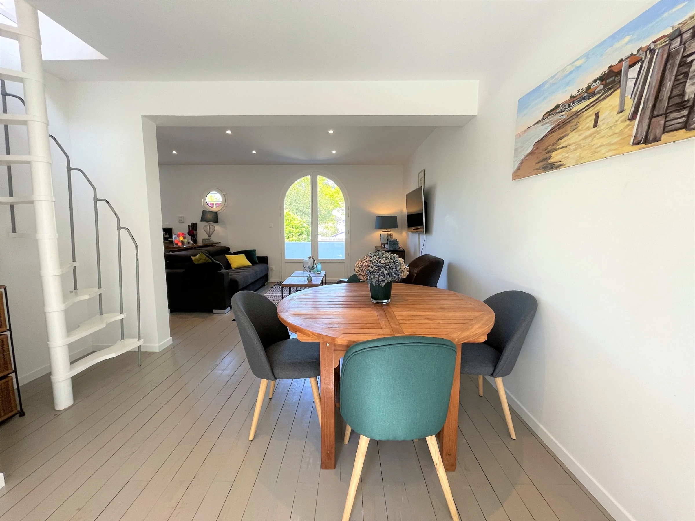 Beautiful house of approximately 150m² (1600 sq ft) on 3 levels with a seaside decor. The garden level features a relaxation/living area, a bedroom (120x190cm bed) with its own shower room, a second bedroom (140x190cm bed) with access to the garden, a shower room, and a separate toilet. On the first floor: a living room (TV/Wi-Fi) with a fully equipped open kitchen and a dining area, a bedroom (180x200cm bed/TV), a shower room, and a separate toilet. On the second floor (spiral/steep staircase), a children's area (TV), and a bedroom (140x190cm bed). A garden with large wooden terraces: one in front, northwest-facing, with a high table under a pergola and a gas grill, and one in the southeast-facing, with garden furniture. Free parking in front of the house (very residential area).