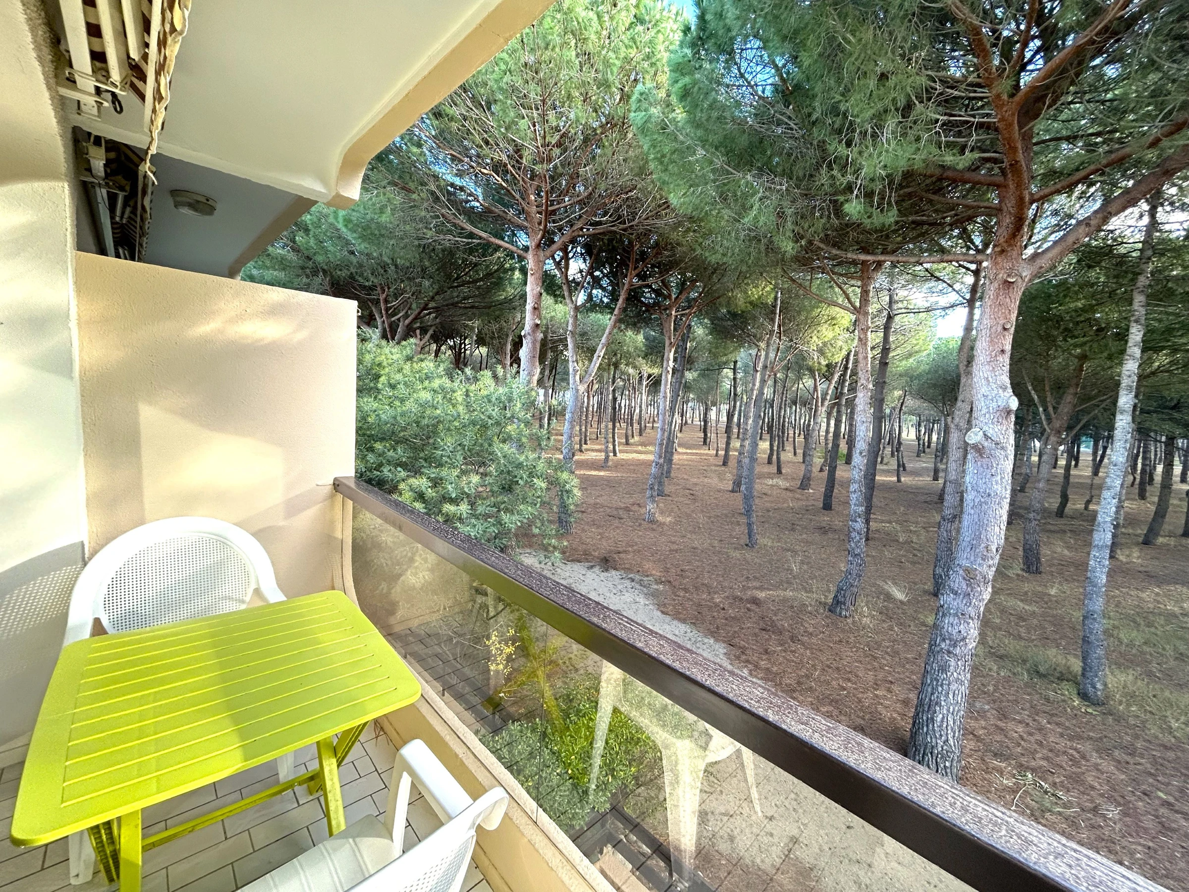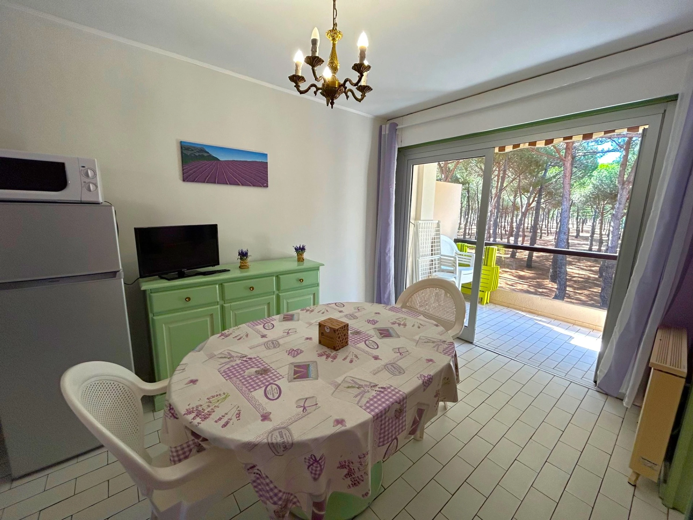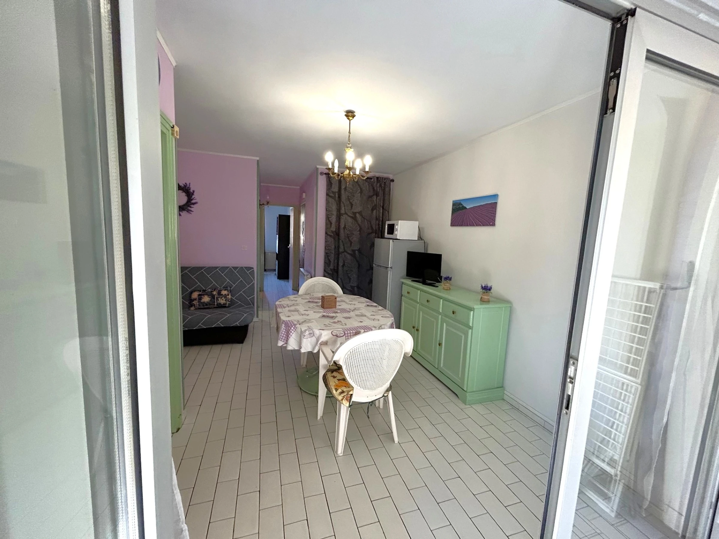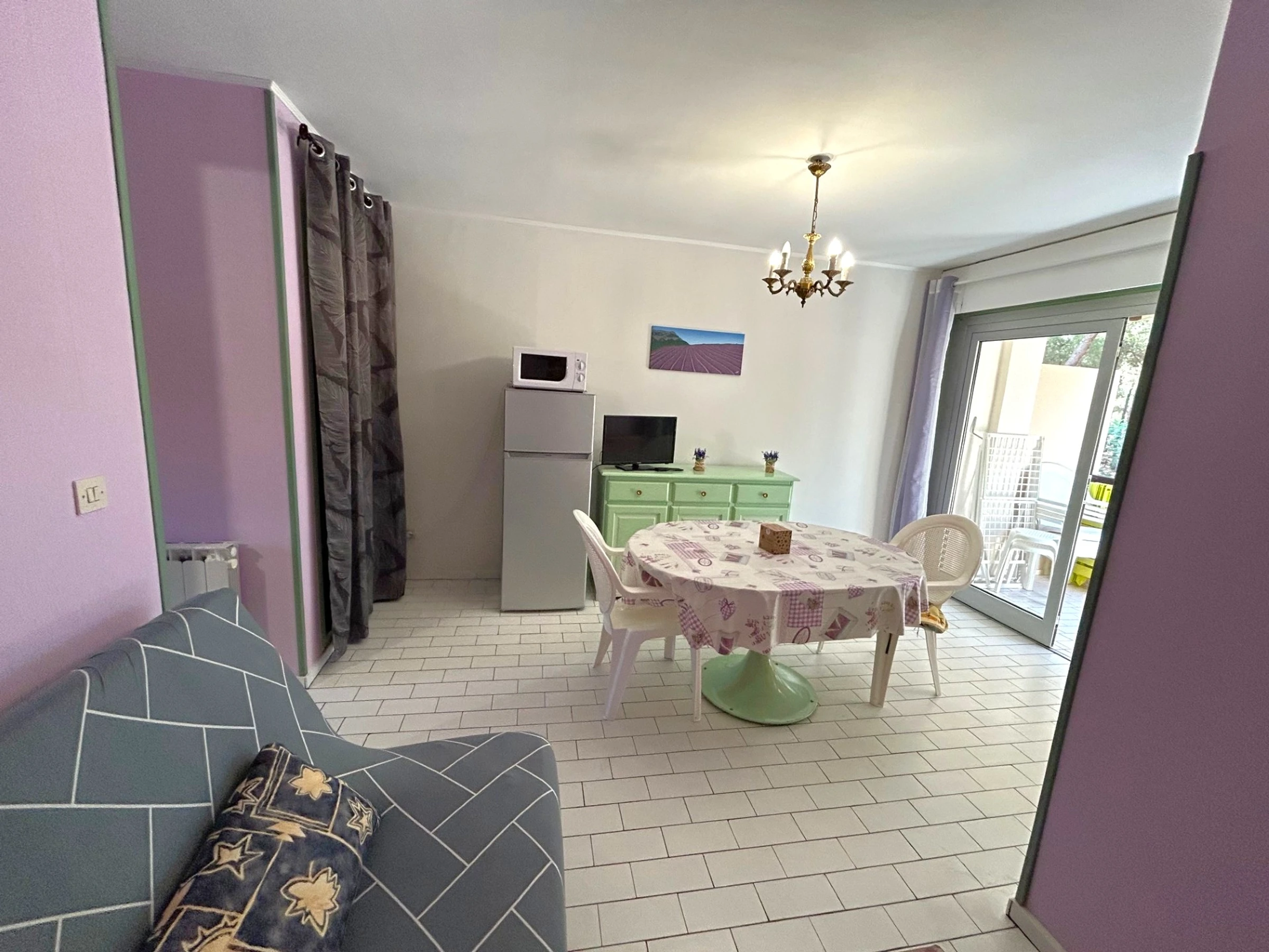 The apartment is located on the first floor of a residence 150 meters from the sea and bordering a pine forest. It can accommodate four people: a double sofa bed in the living room and a double bed in the bedroom. The apartment is equipped with a refrigerator/freezer, two electric hobs, a microwave, an oven, a washing machine, and a television. It also has a south-facing balcony (with awning) and a private parking space.