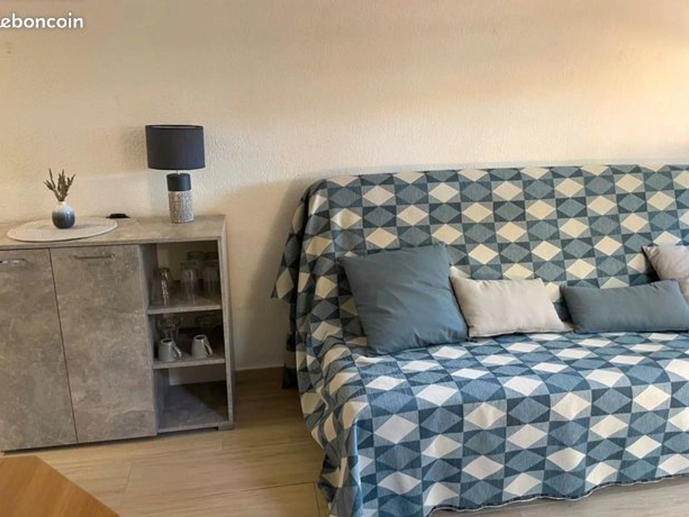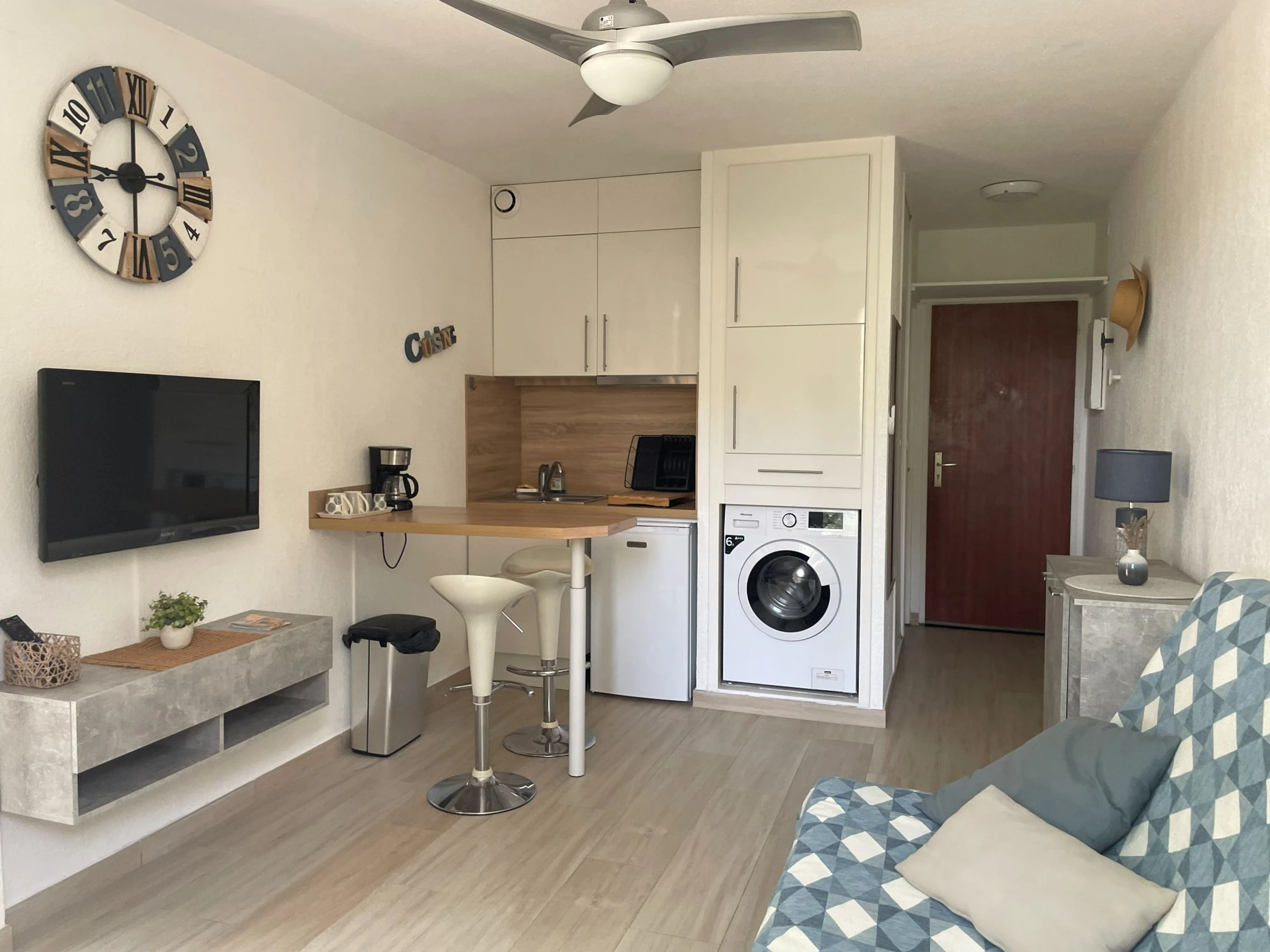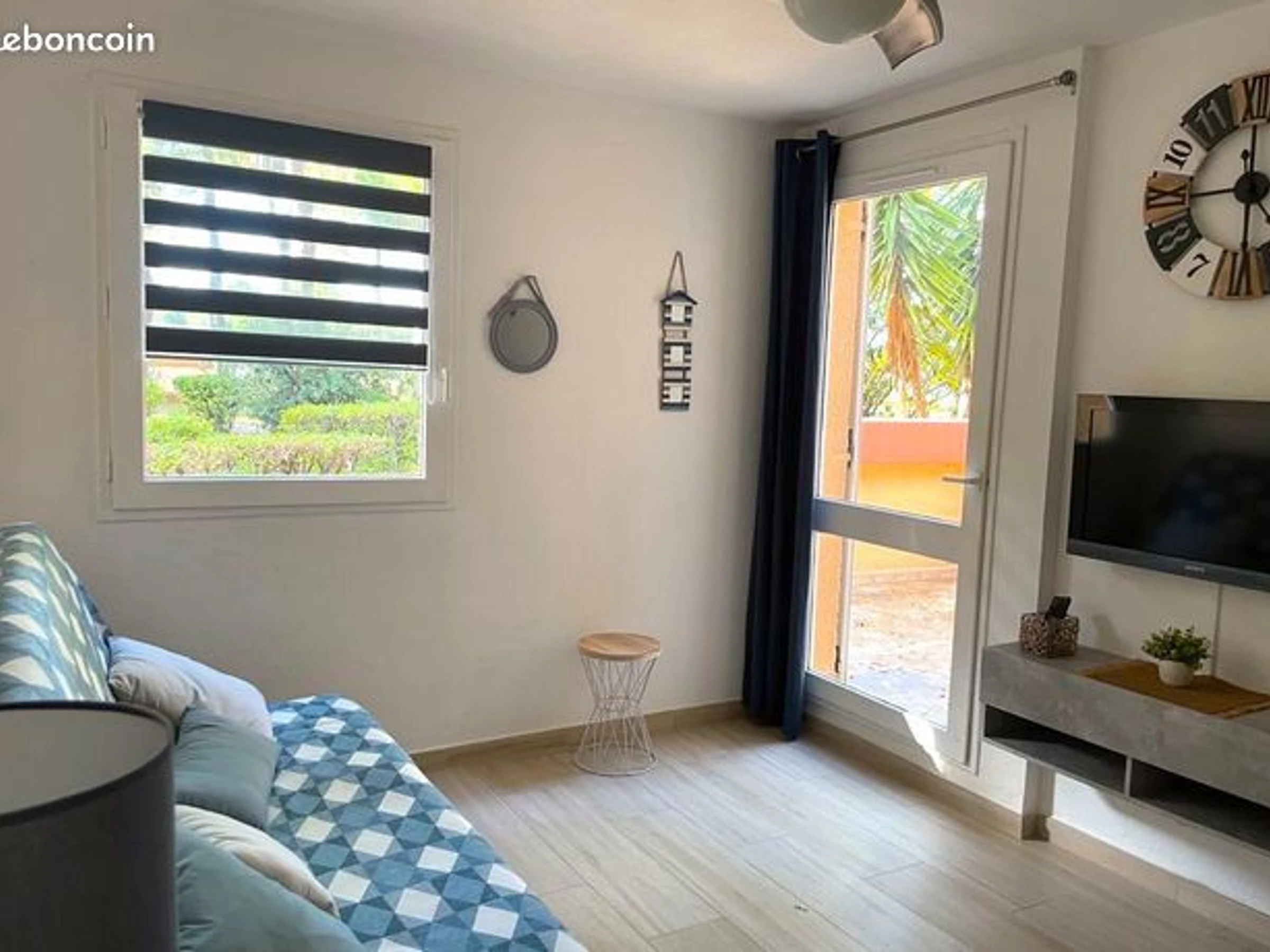 The apartment is located on the ground floor of a residence 200 meters from the beach. It can accommodate 2 people: 1 sofa bed in the living room (140x190 cm, 15 cm Bultex mattress). The apartment is equipped with a tabletop refrigerator with a small integrated freezer, 2 induction hobs, a microwave, and a washing machine. It also features a 9 m² terrace with an awning and a private parking space.