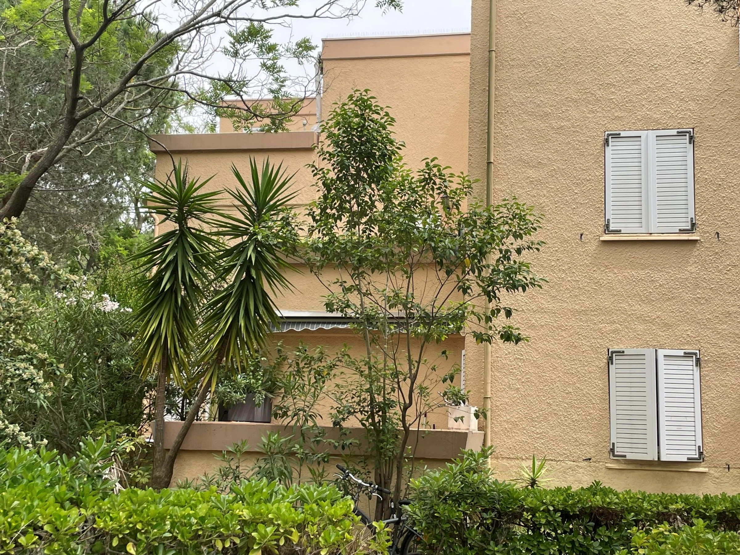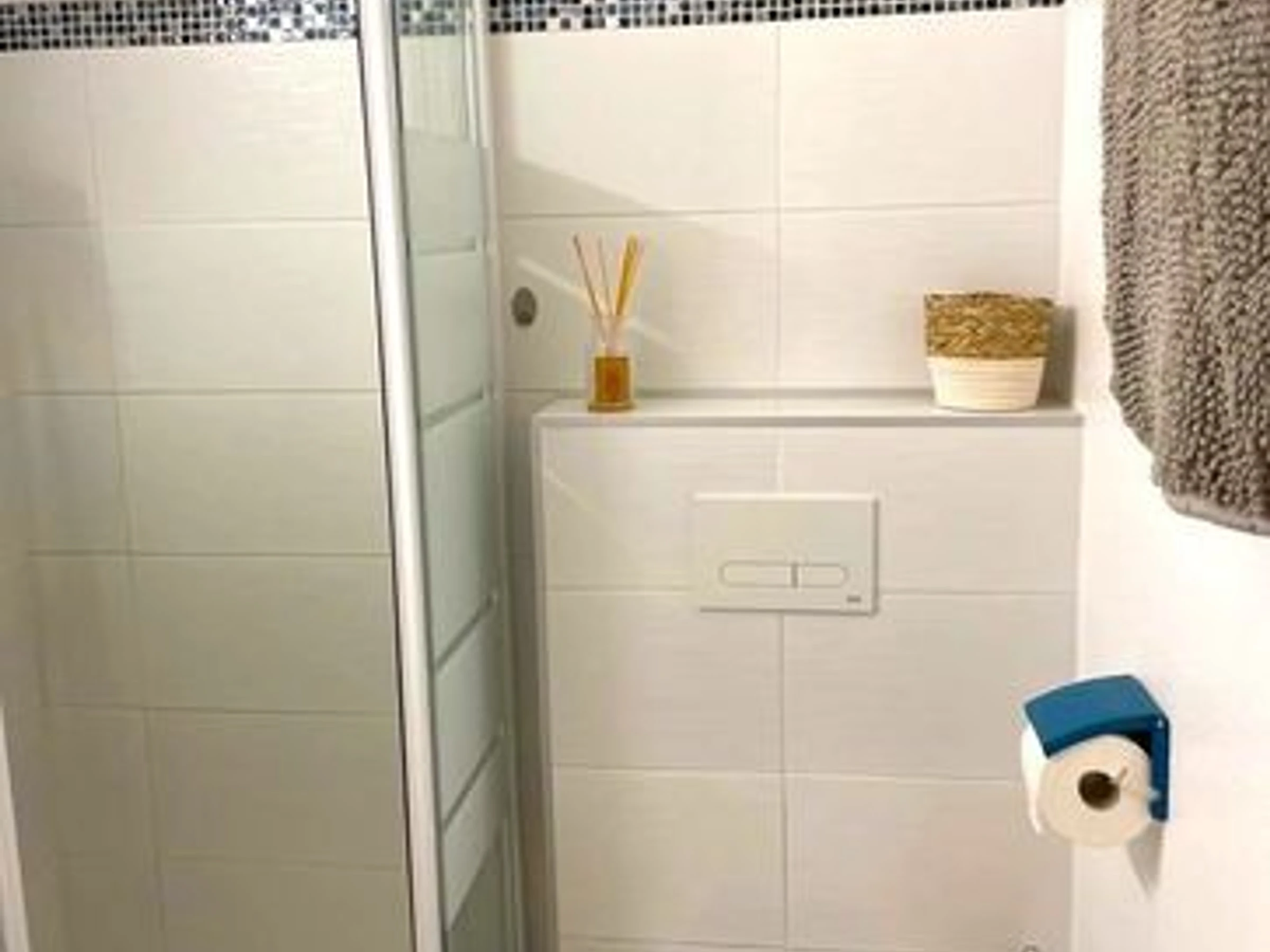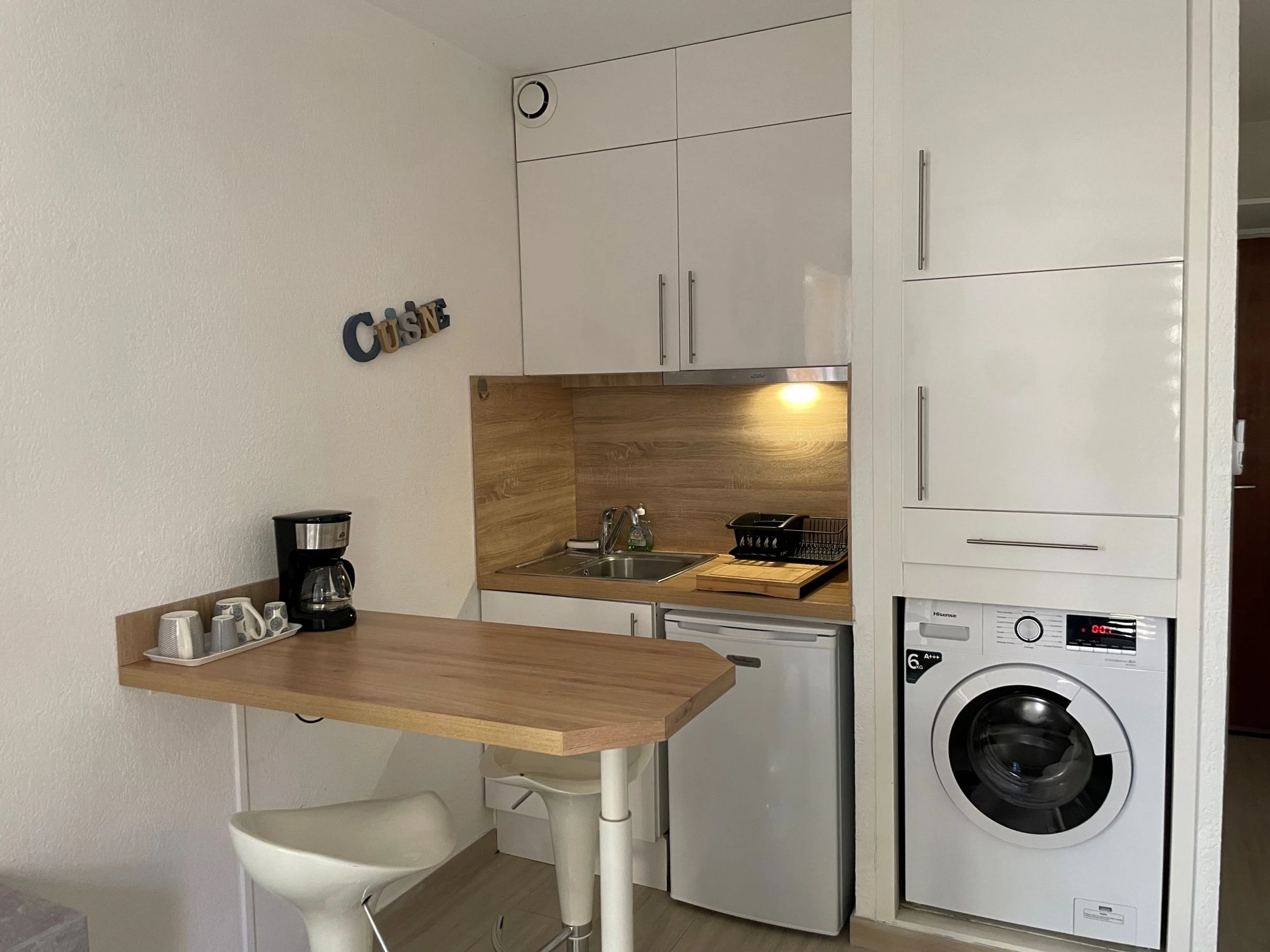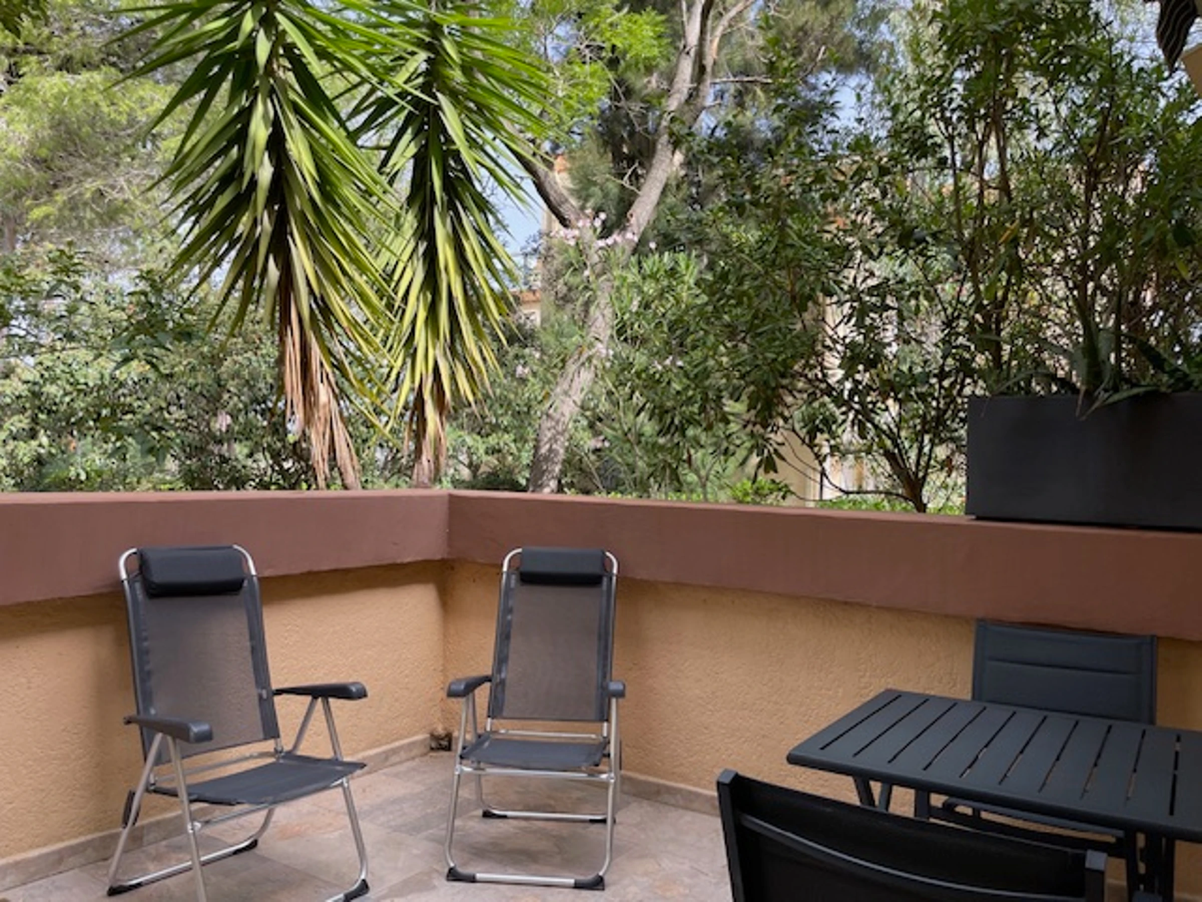 The apartment is located on the ground floor of a residence 200 meters from the beach. It can accommodate 2 people: 1 sofa bed in the living room (140x190 cm, 15 cm Bultex mattress). The apartment is equipped with a tabletop refrigerator with a small integrated freezer, 2 induction hobs, a microwave, and a washing machine. It also features a 9 m² terrace with an awning and a private parking space.