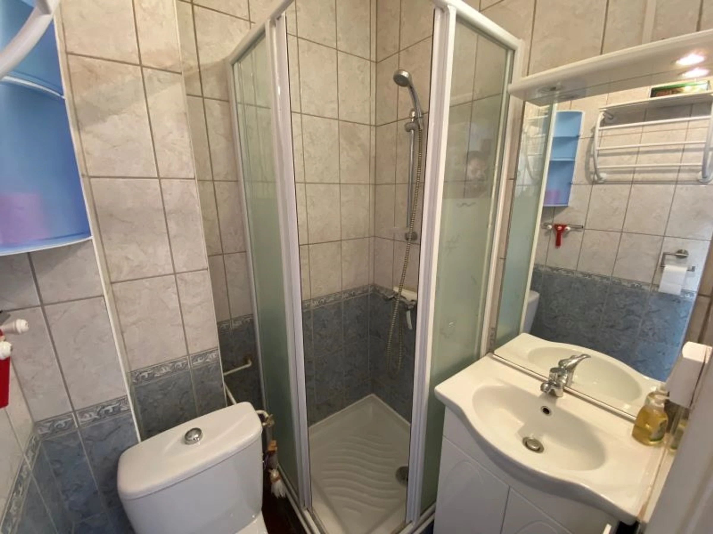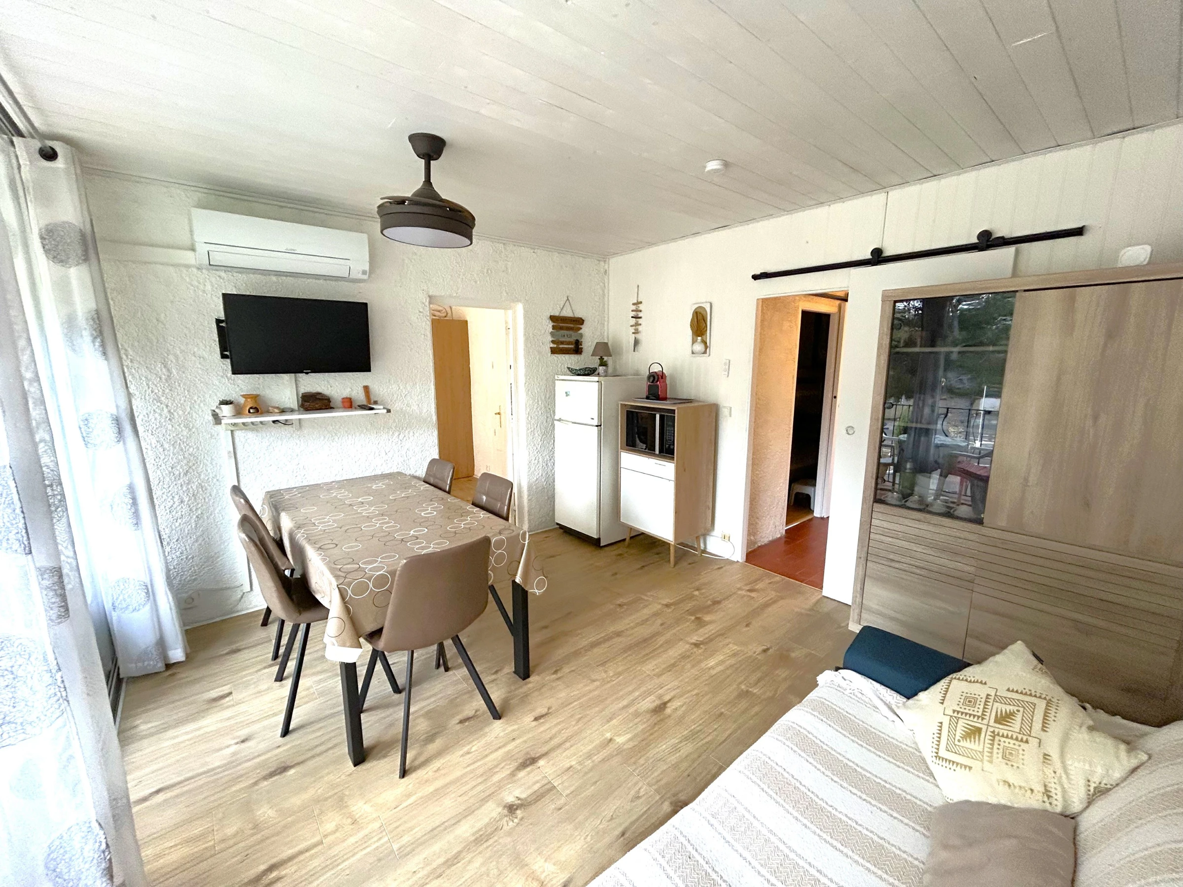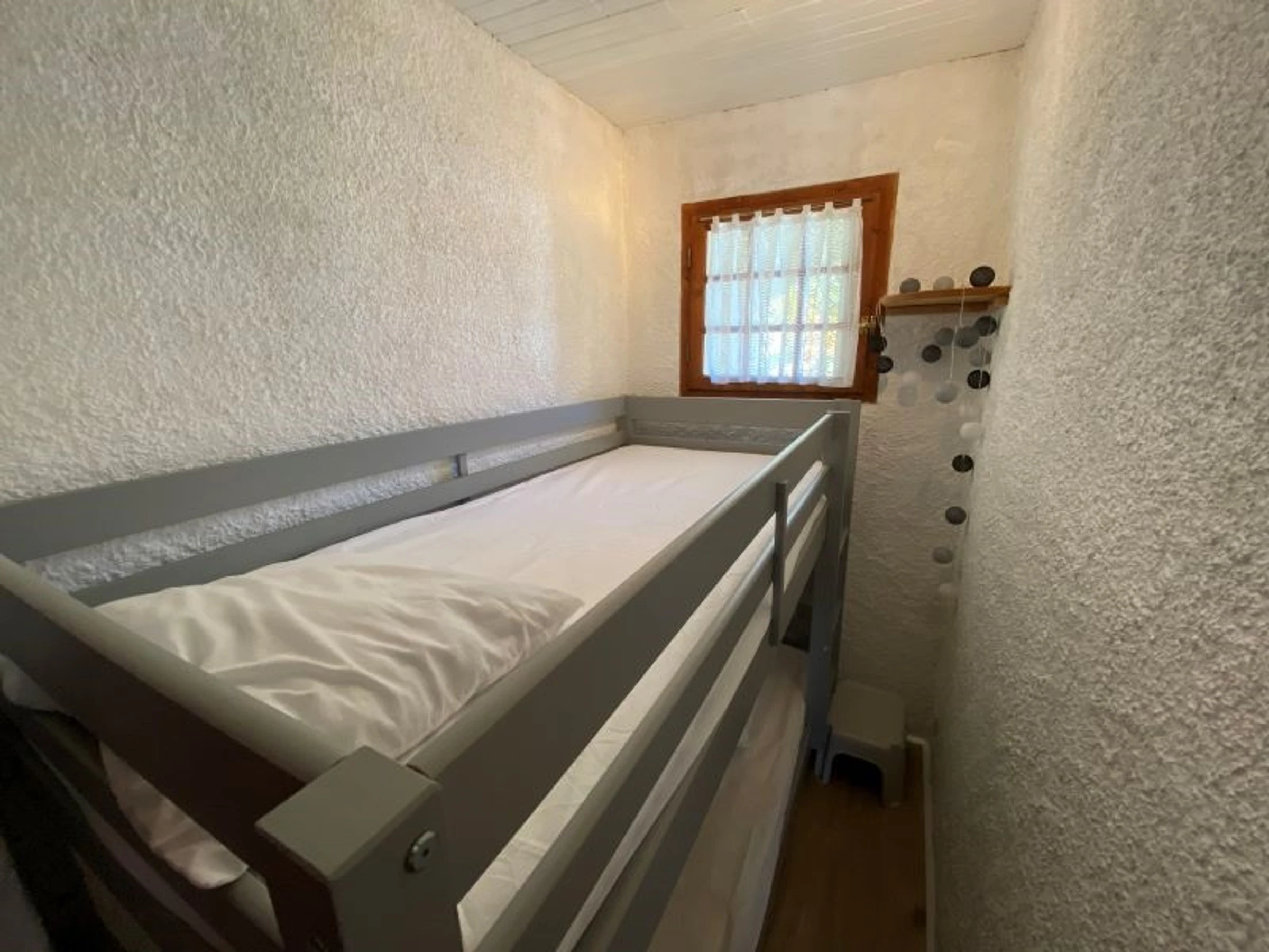 It comprises a fully equipped kitchenette, a living room with a two-seater sofa, a bedroom with a double bed, a sleeping alcove with two single bunk beds, and a shower room with toilet.