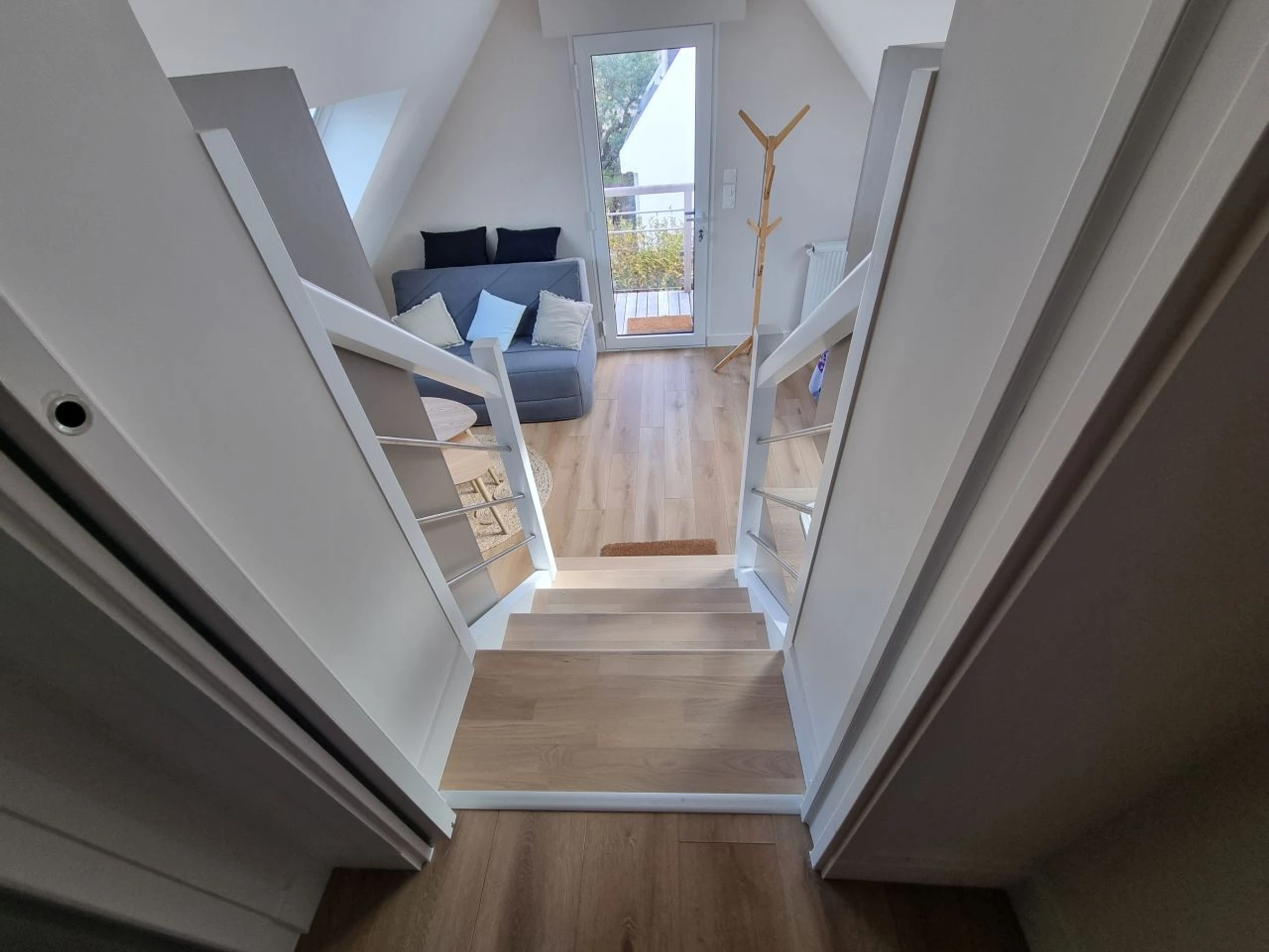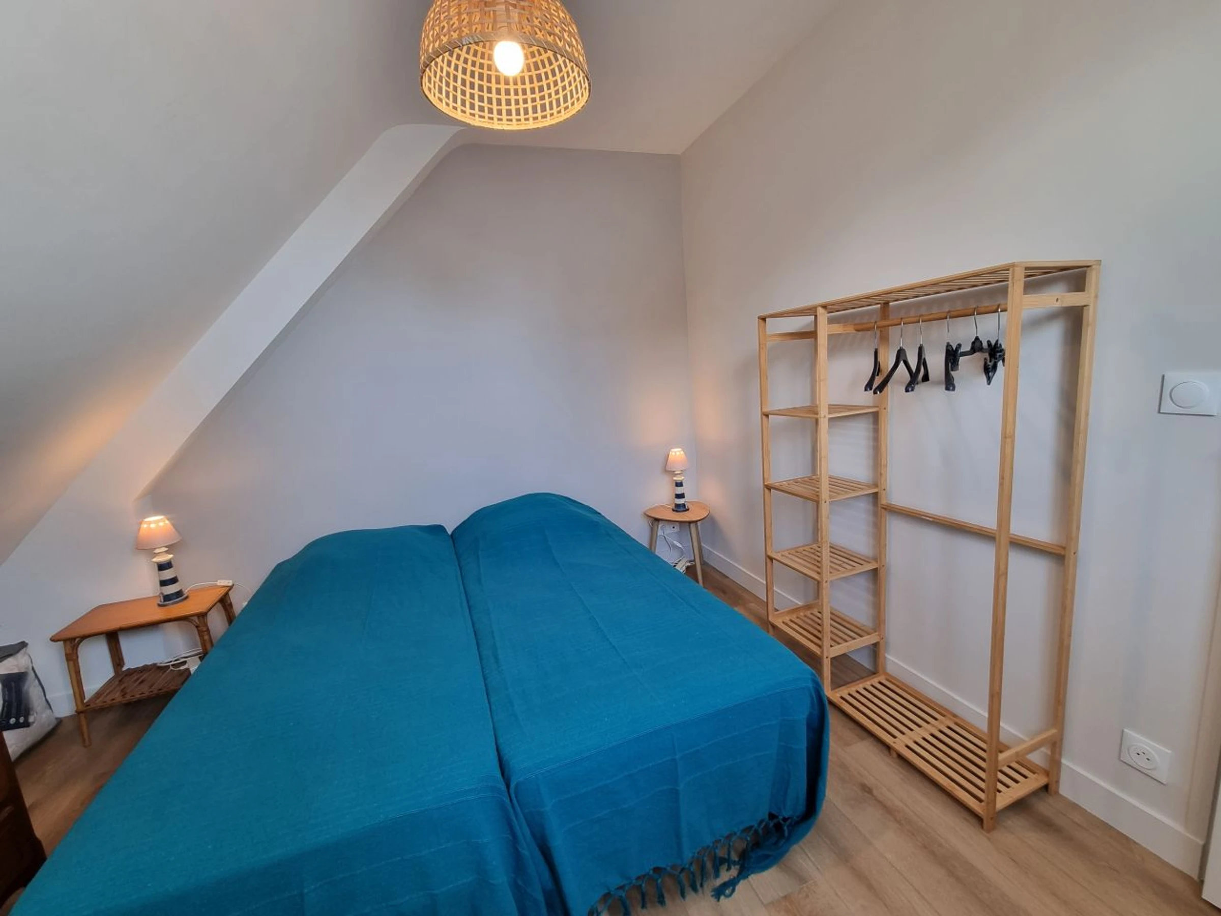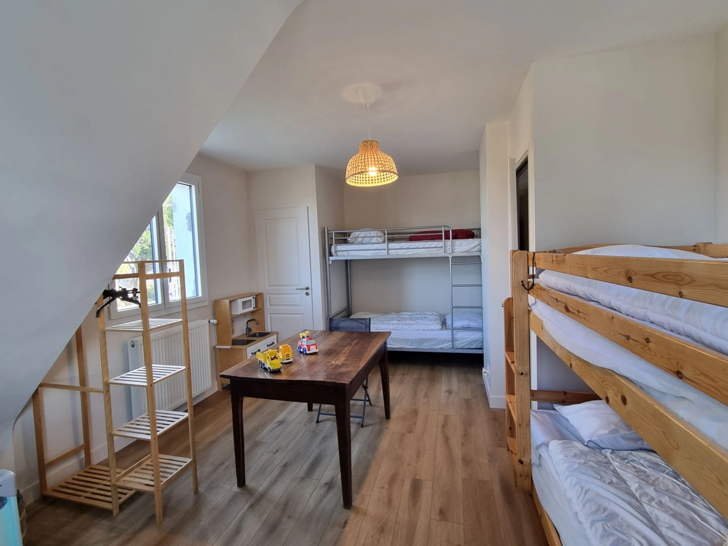 The first bedroom is an en-suite with a 160x190 cm bed, a large closet (shelves/wardrobe), and a bathroom with a bathtub and shower, plus a toilet. Upstairs: The hallway leads to a second bedroom with two bunk beds (sleeps 4, 90x190cm), a third bedroom with a 140x190cm bed, a small sink, and storage (shelves/wardrobe). On the opposite wing, at the end of the hallway, a door opens onto a landing leading to a fourth bedroom with a trundle bed, either two 80cm beds or one 160x200cm bed, a small sink, storage (shelves/wardrobe), and a shower room with toilet. A few steps lead down to the living/kitchen area with a 4-star refrigerator with a freezer, sink, two-burner induction hob, microwave, sofa bed, and TV. This area is accessed either through its own entrance via the exterior stairs leading to the garden or from inside the house.