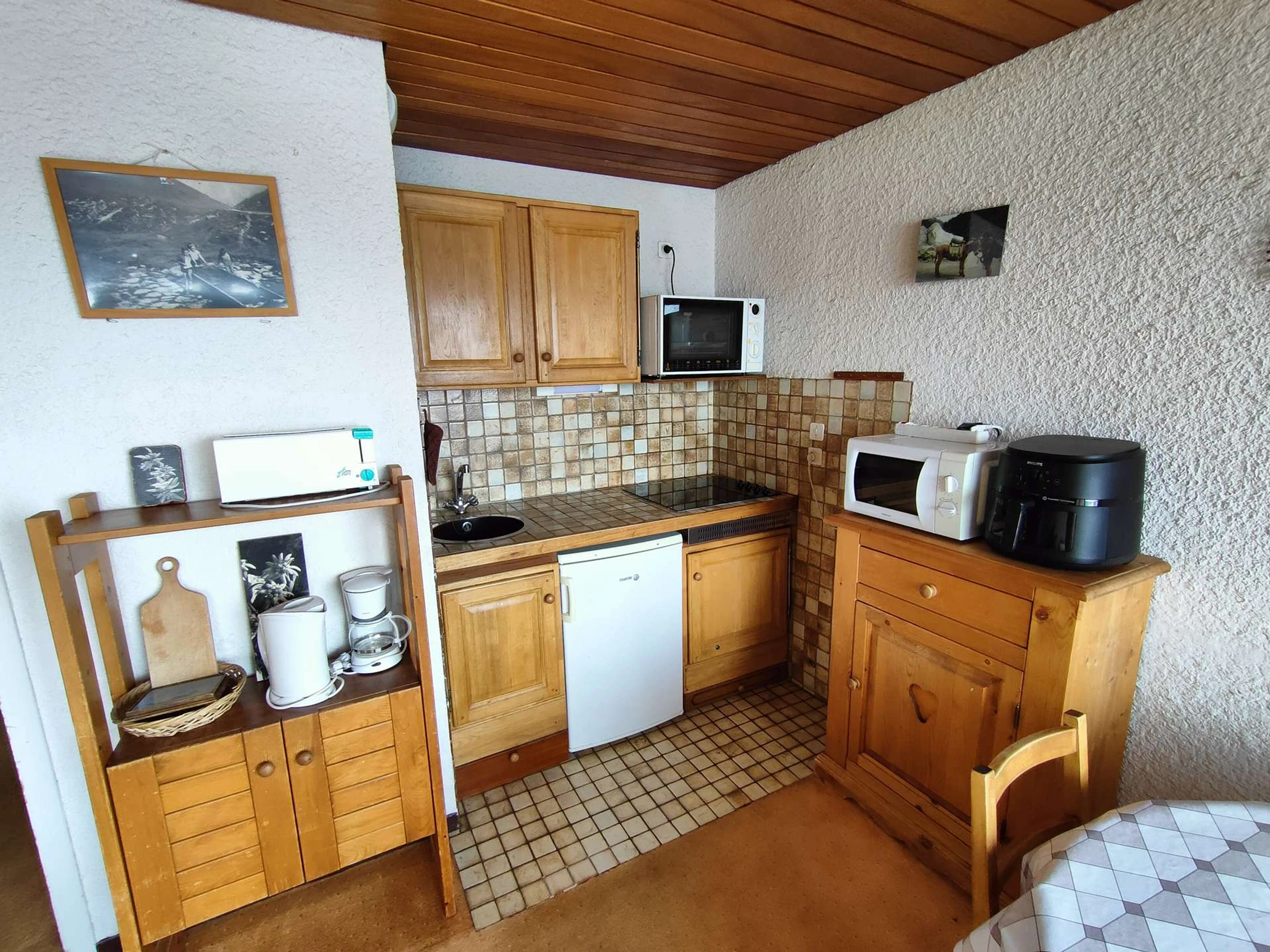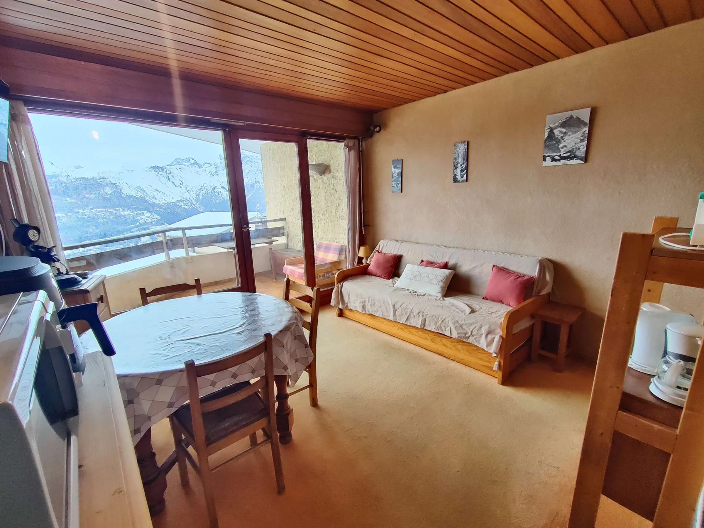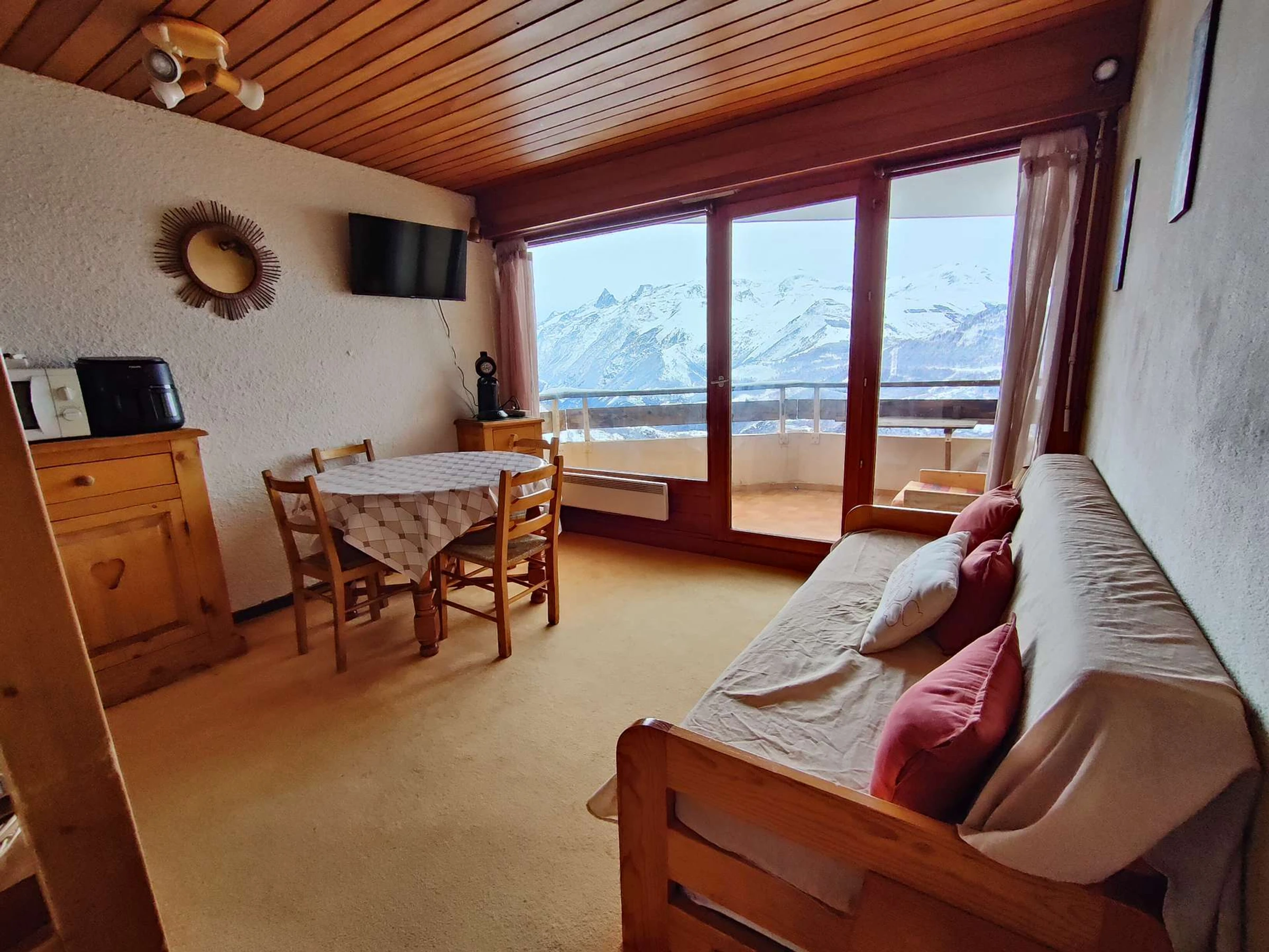 Neat and convenient studio in ski to door residence close to all amenities and kids club. Large sout-east facing balcony with garden furniture. Outstanding view on les 2 Alpes and the Glacier de la Meije.