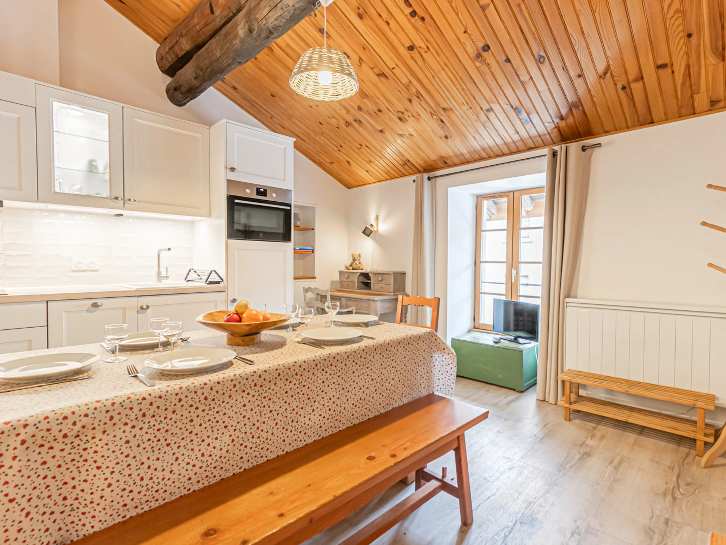 Kitchen/living room : Fridge, electric hob, oven, TV