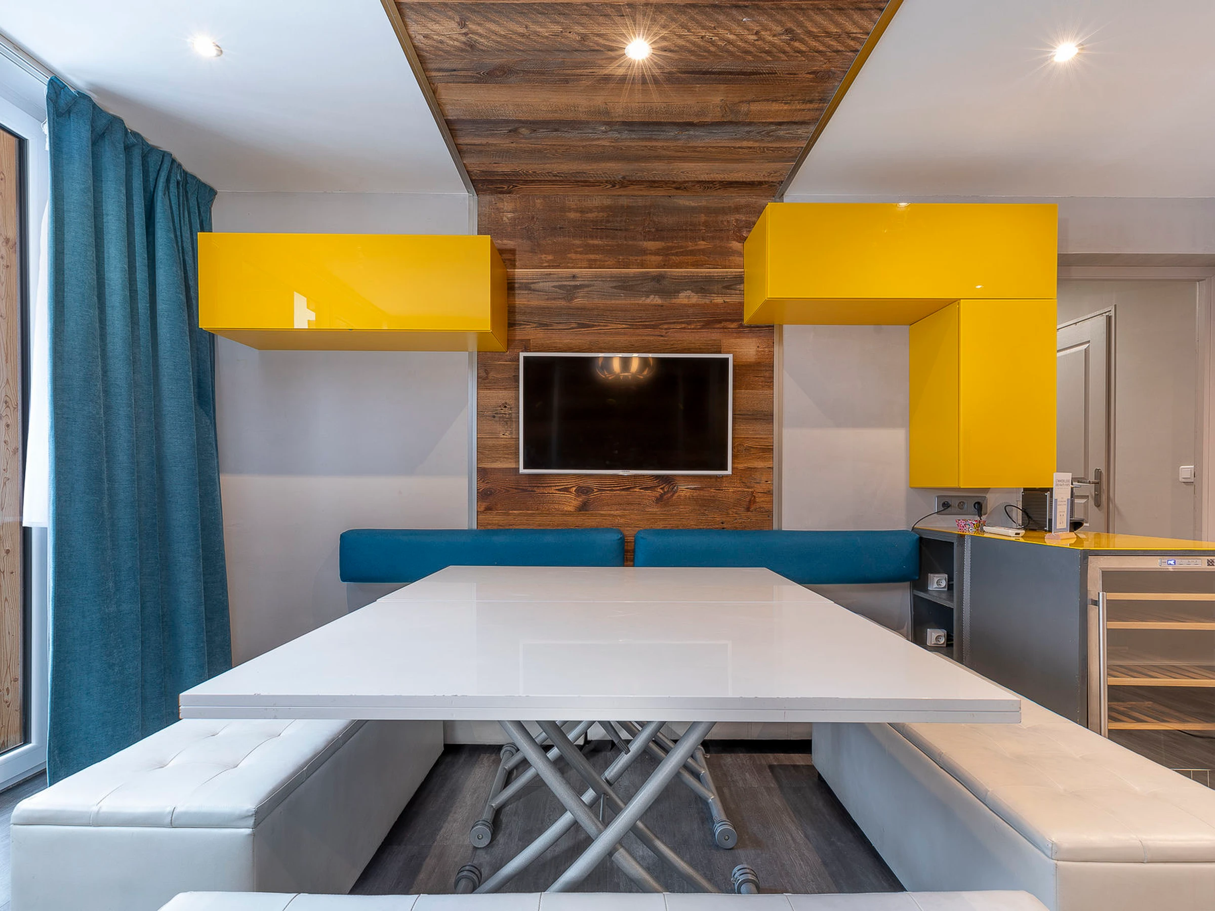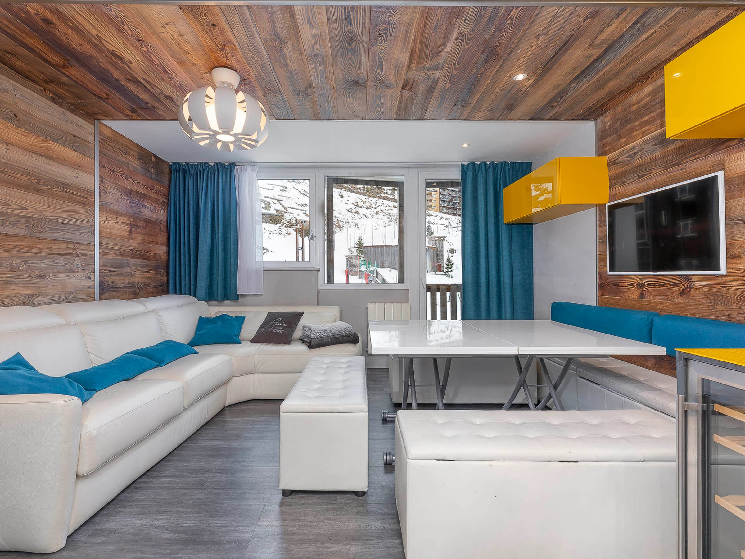 The main living space features a cosy, modern and colourful lounge — the perfect place to relax after a day on the slopes. The open-plan kitchen is fully equipped (fridge, combined oven/microwave, dishwasher, wine fridge, Nespresso Pro coffee machine*, etc.), making it easy to prepare shared meals. This space opens onto an east-facing balcony.