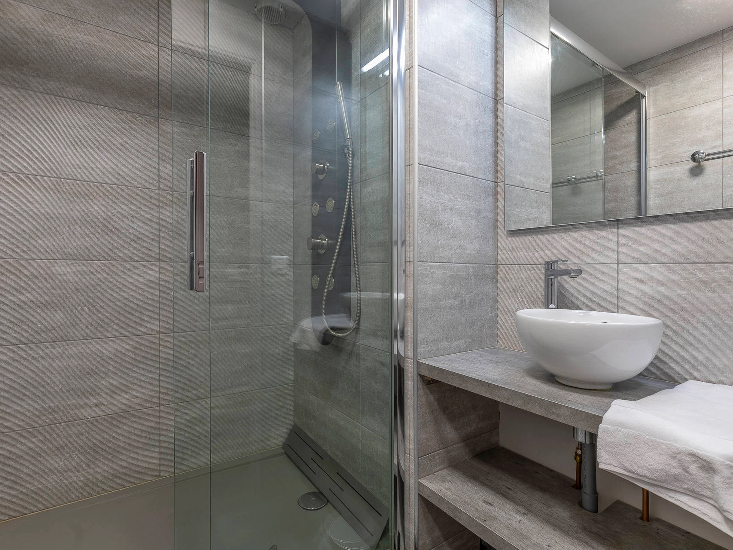 - A master suite with a double bed (160x200), private balcony, and a bathroom fitted with a whirlpool bath-shower-steam room combination