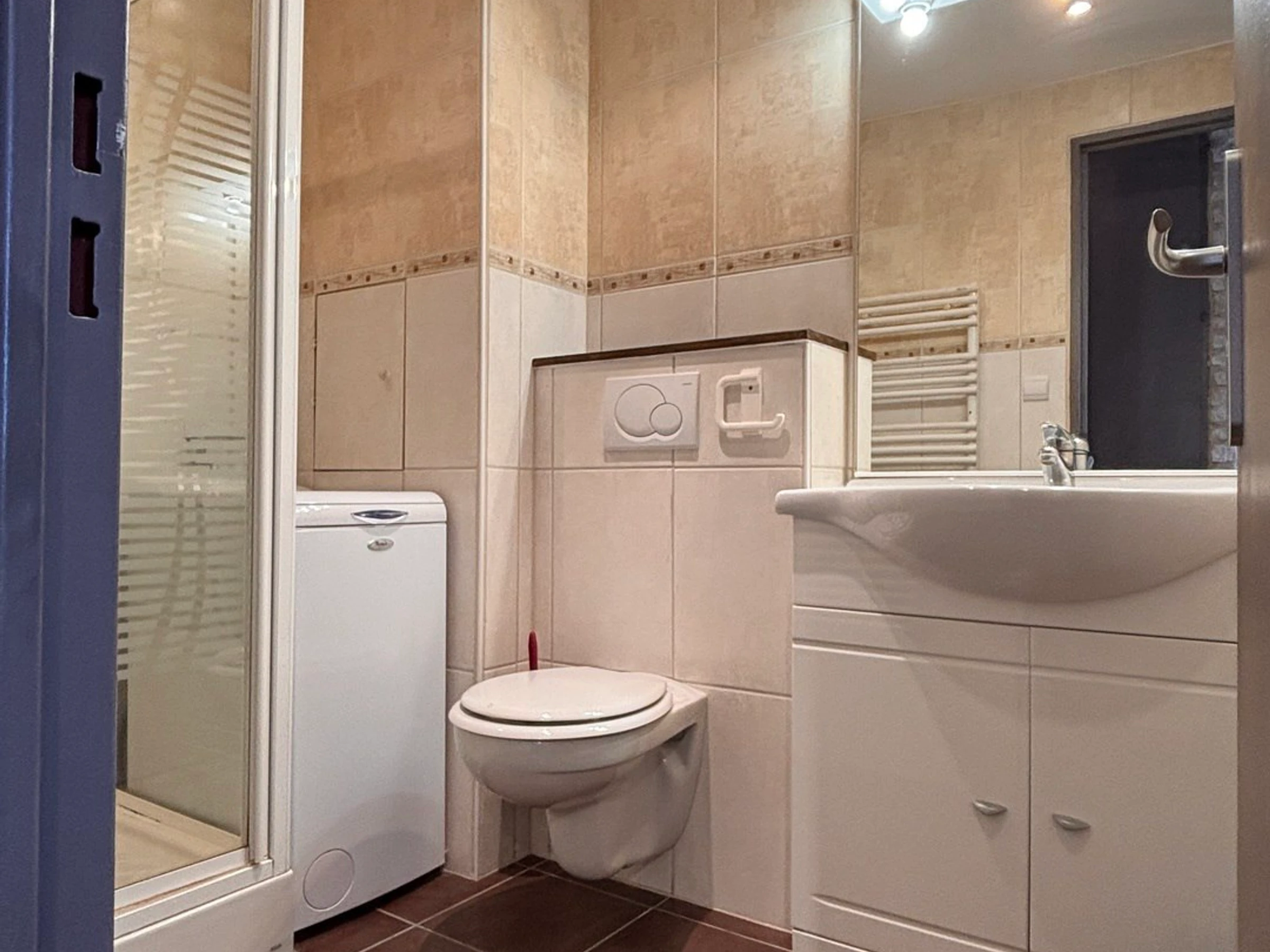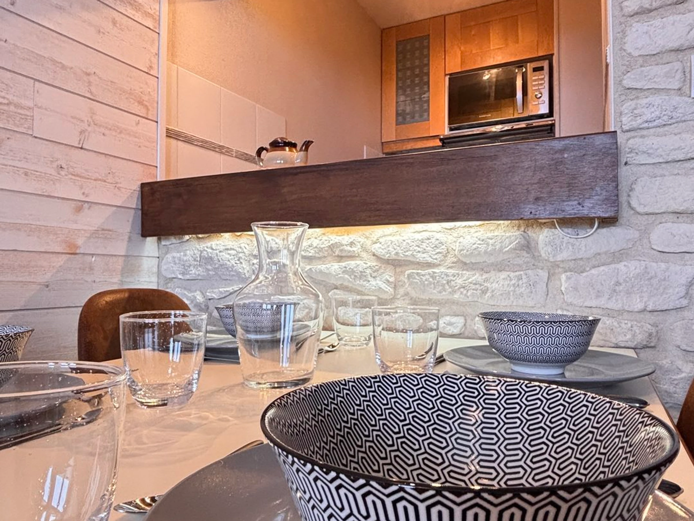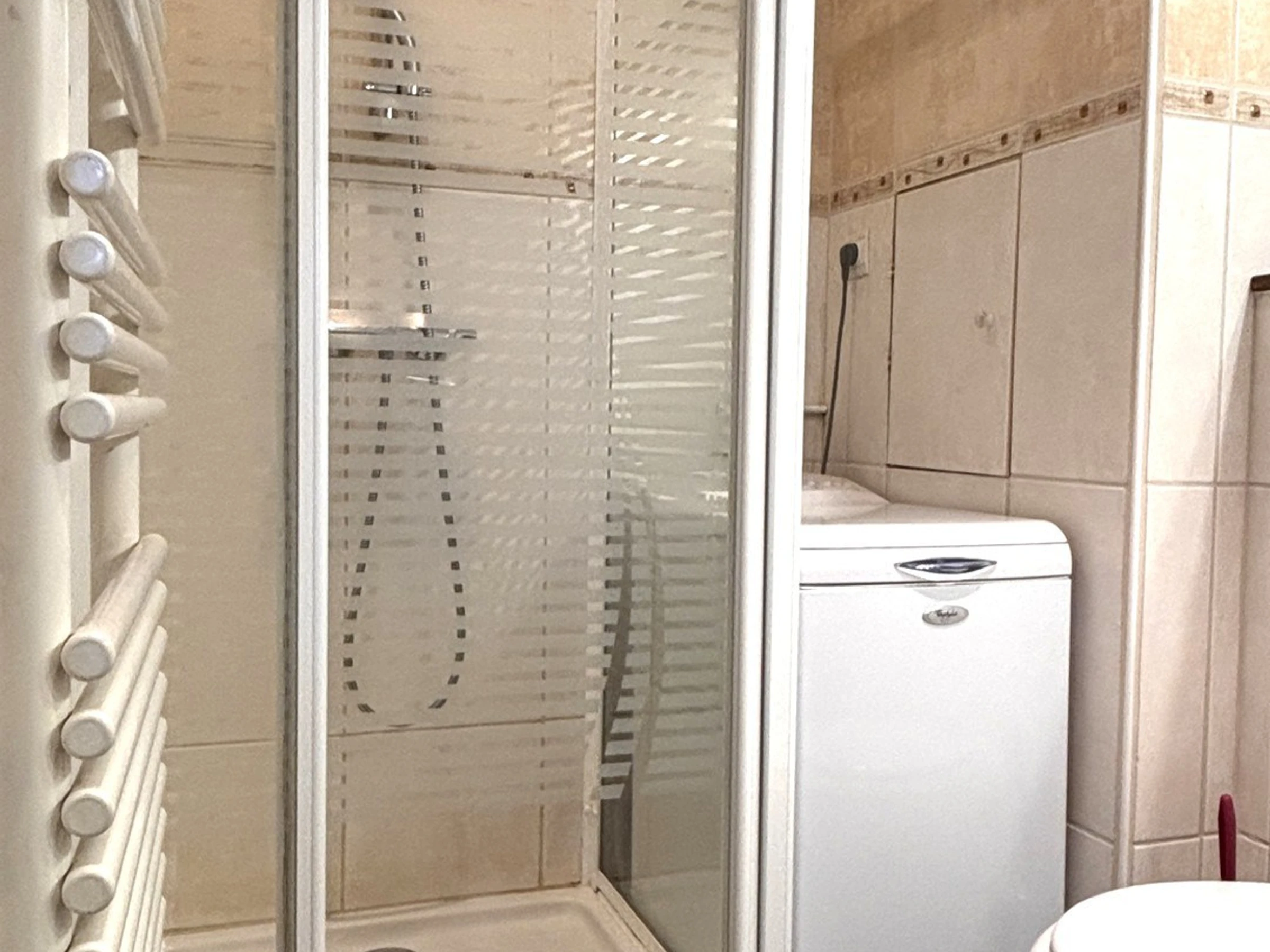 Shower room with toilet, washing machine and heated towel rail. Kitchen equipped with a microwave oven, vitro-ceramic hotplates, a hood and a dishwasher.