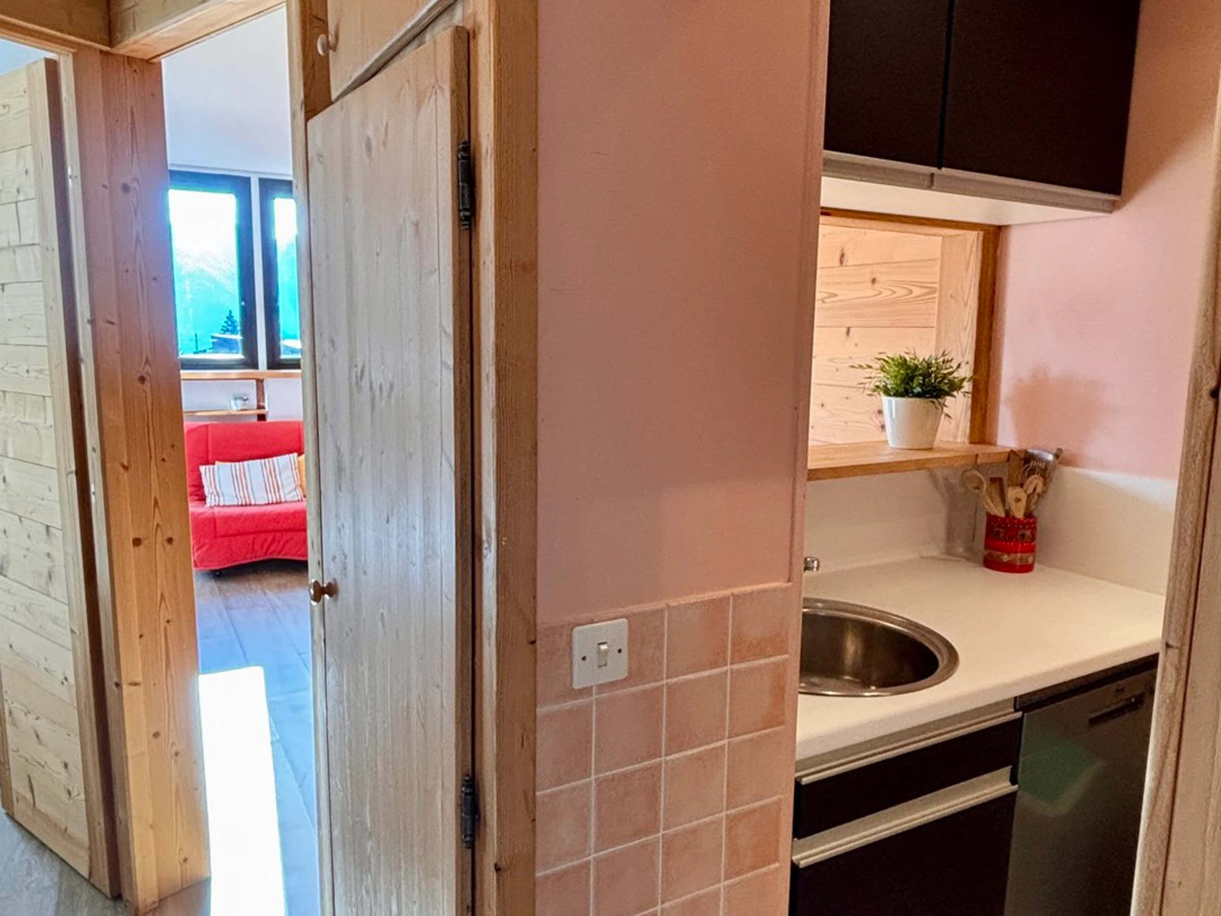 Arranged for 4 people, you will find in the living room 1 sofa bed BZ and 1 double bed in the bedroom wich is separated from the living room by a sliding wooden door.