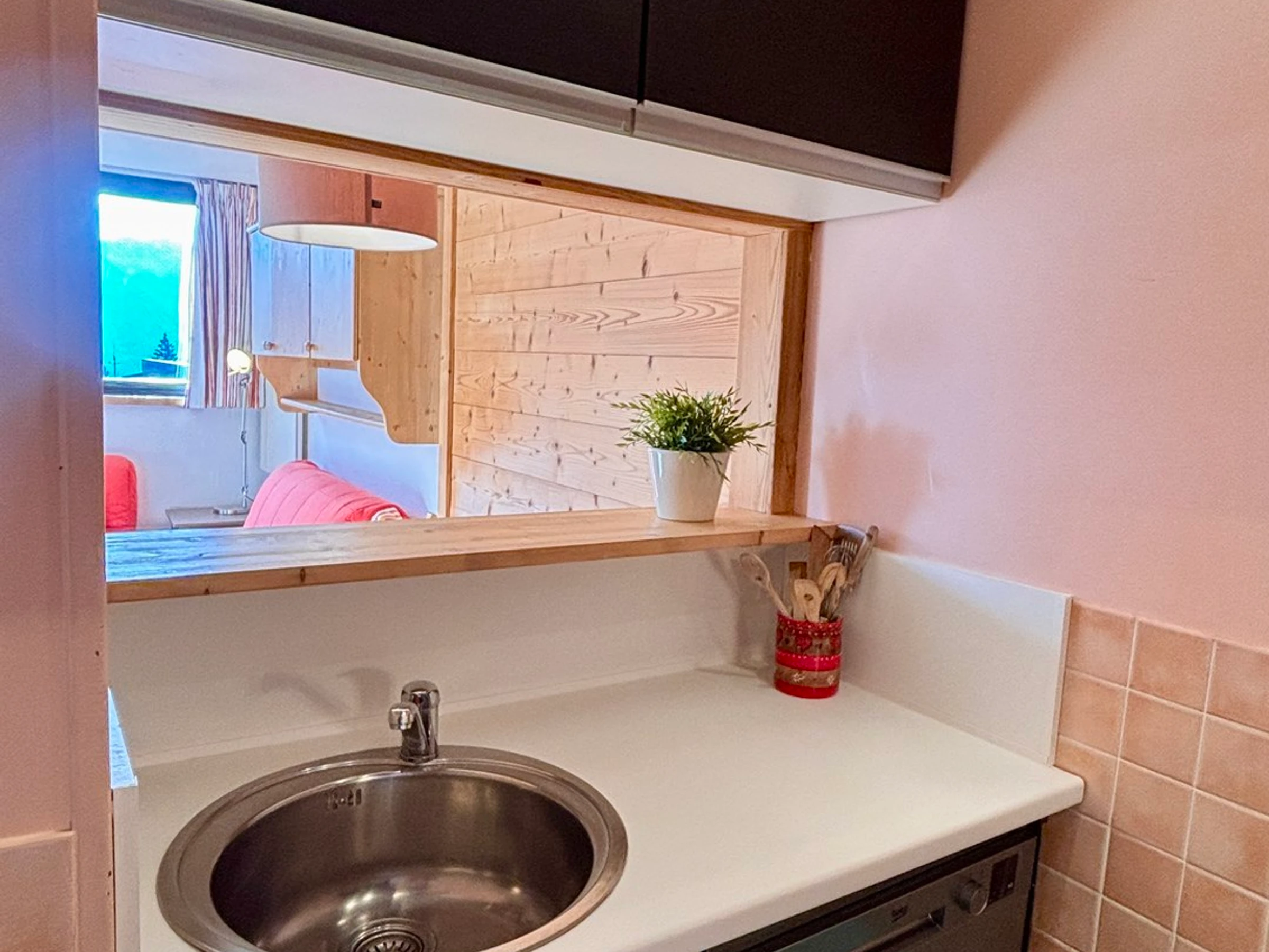 The kitchen is equipped with a mini oven, ceramic hob and dishwasher.