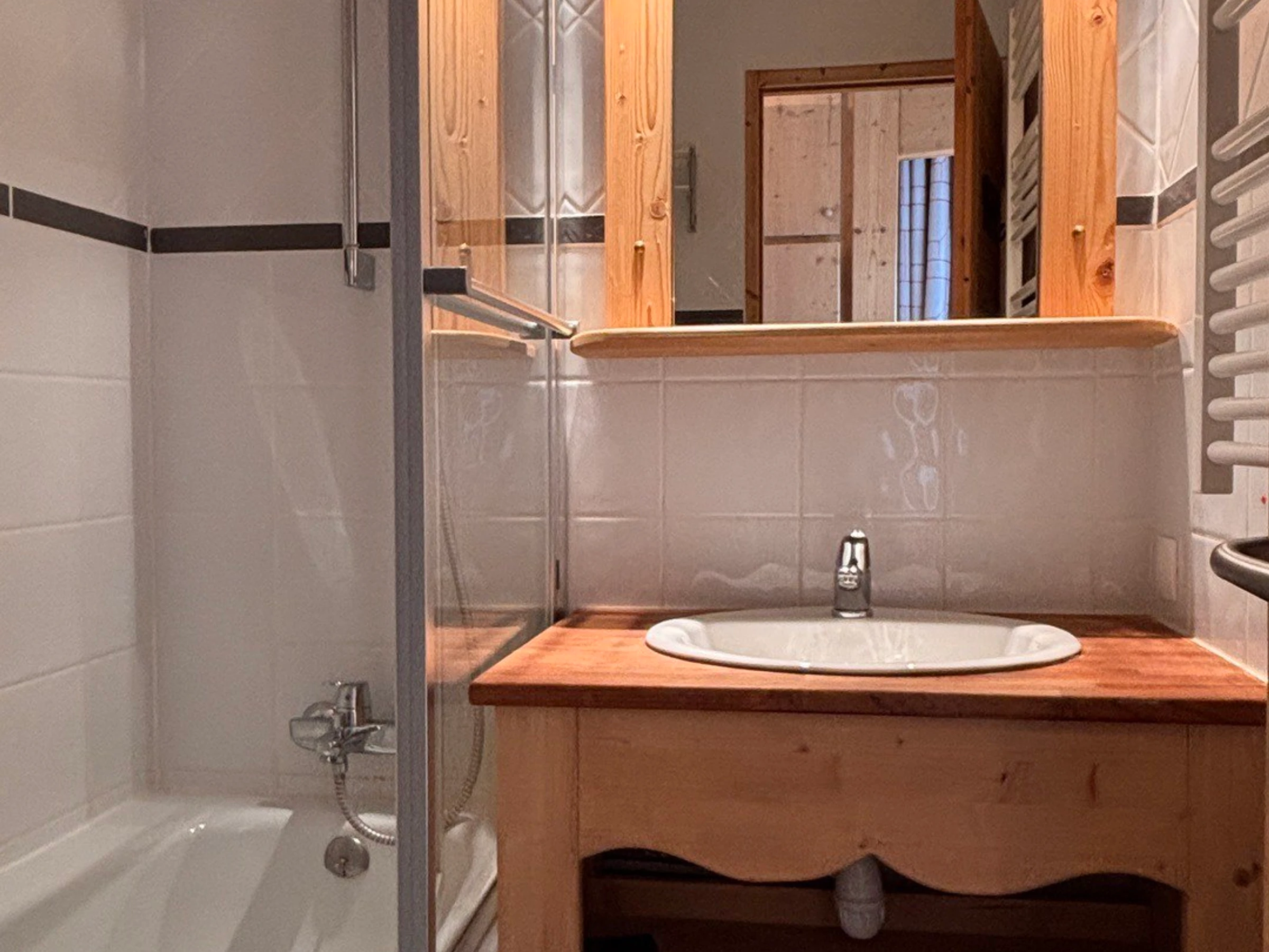 Bathroom with bath and towel dryer, separate toilet.