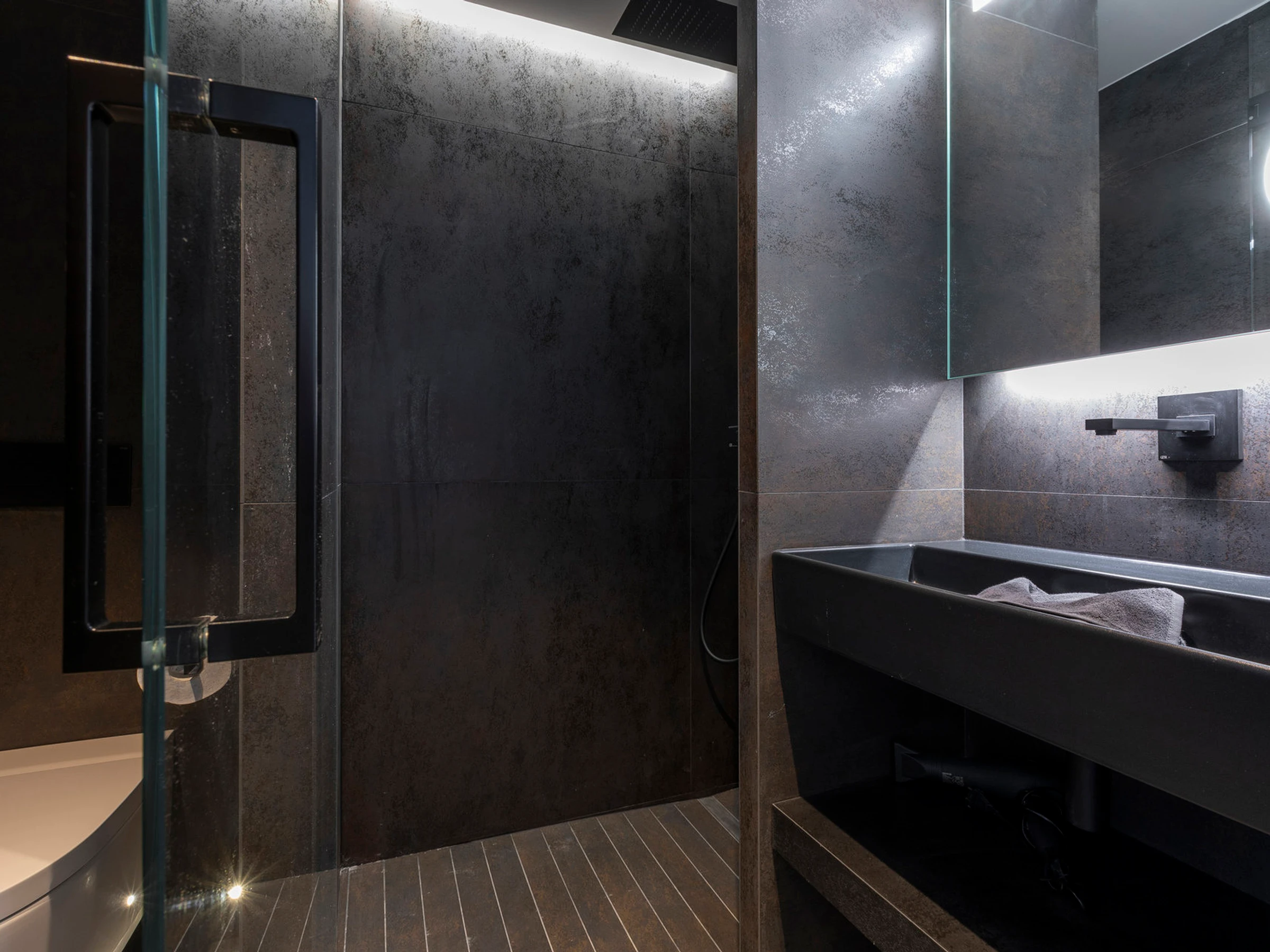The 59 m² living area has been designed as a spacious and luminous cocoon. The lounge is arranged around a two-sided central fireplace, creating a cosy atmosphere after a day on the slopes. The open-plan kitchen, fully equipped (oven, microwave, fridge, dishwasher, professional Nespresso machine, granite island, wine fridge...), connects to the dining area in a friendly and welcoming atmosphere. Two large terraces facing southeast and southwest offer full immersion in the alpine landscape.