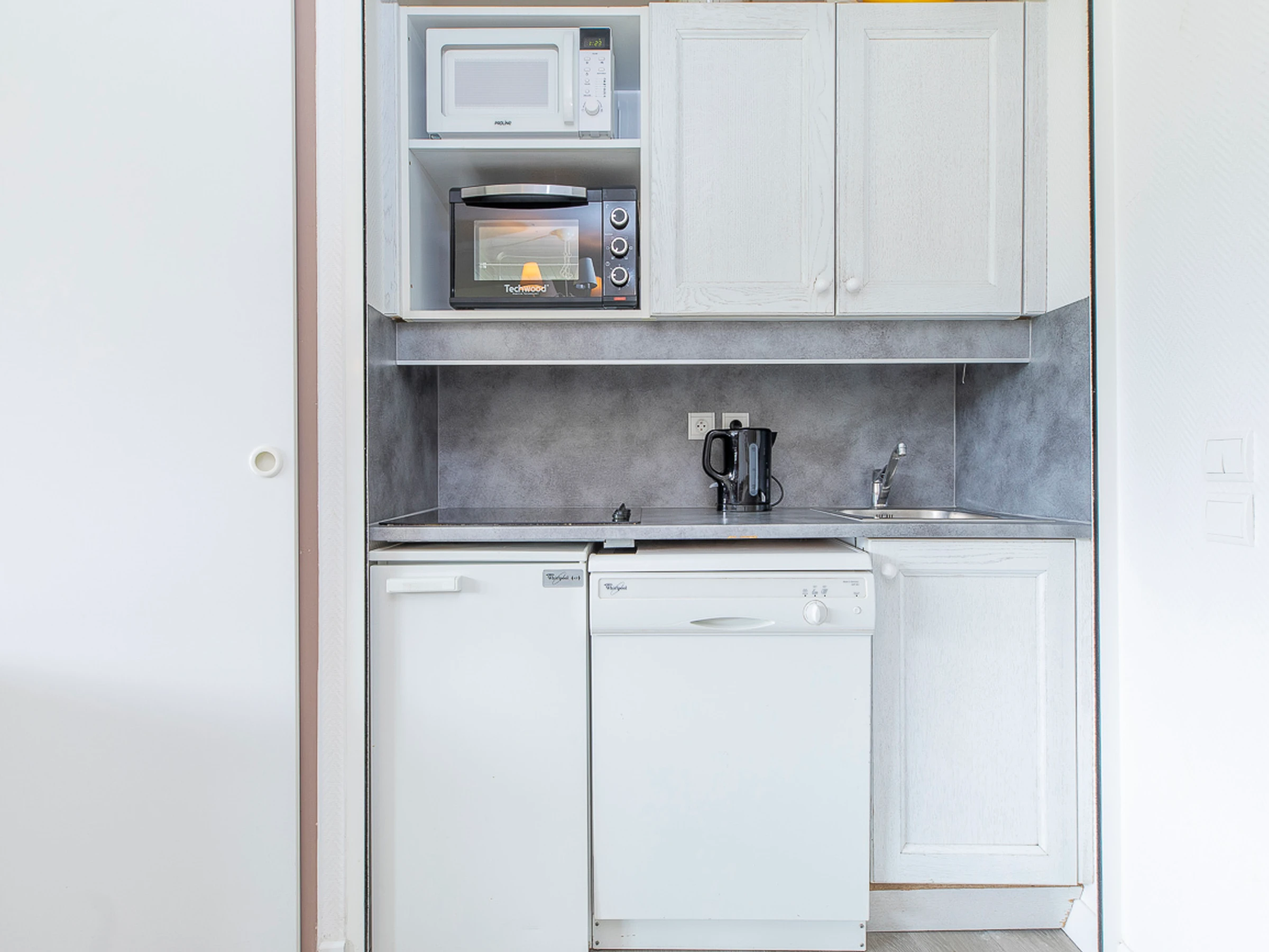 The entrance, equipped with practical storages, opens onto a living space comprising a dining area and a fully equipped kitchen (oven, microwave, fridge, dishwasher, hob, filter coffee maker, etc...). The lounge features a corner sofa bed for two (140x190 cm) with TV, as well as an armchair bed providing an additional sleeping option.