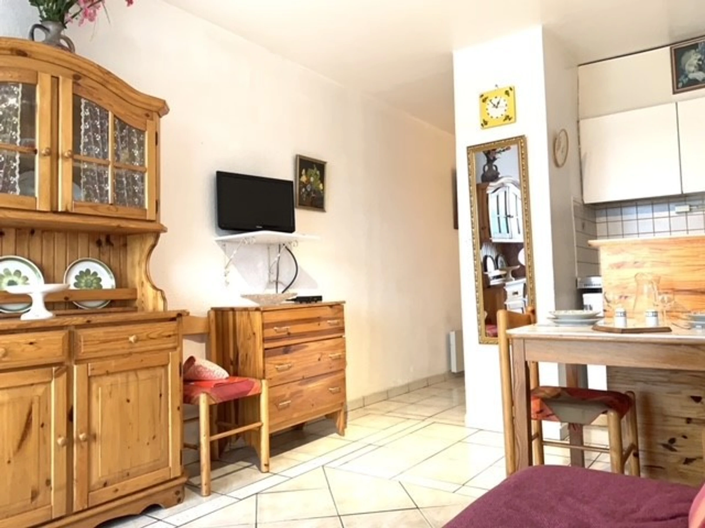 Comprenant un séjour avec 1 canapé, télévision, une cuisine équipée et aménagée avec plaques électriques, un micro-ondes, un mini-four, un frigo-top. La salle d'eau est avec douche, les toilettes sont séparés.