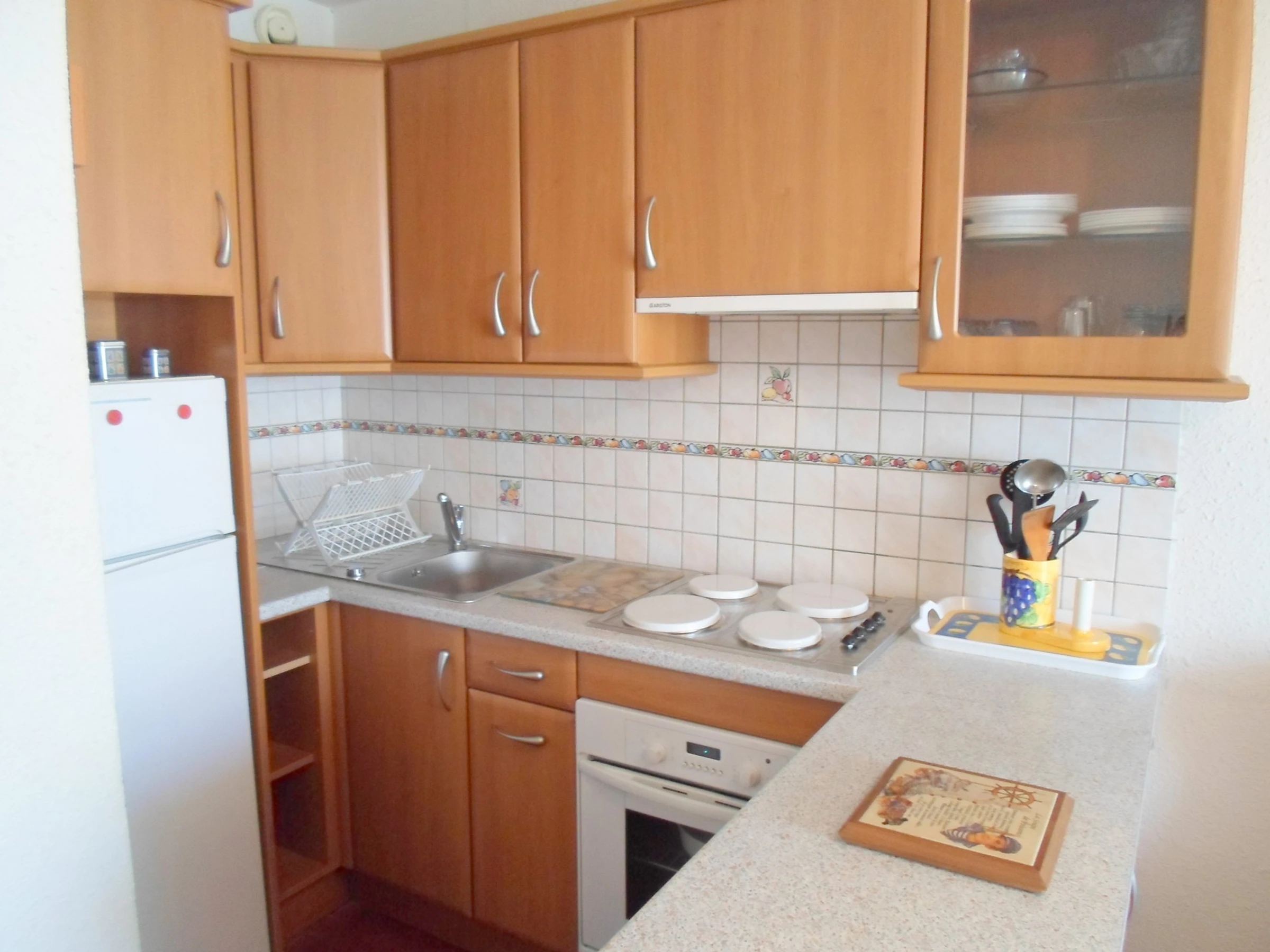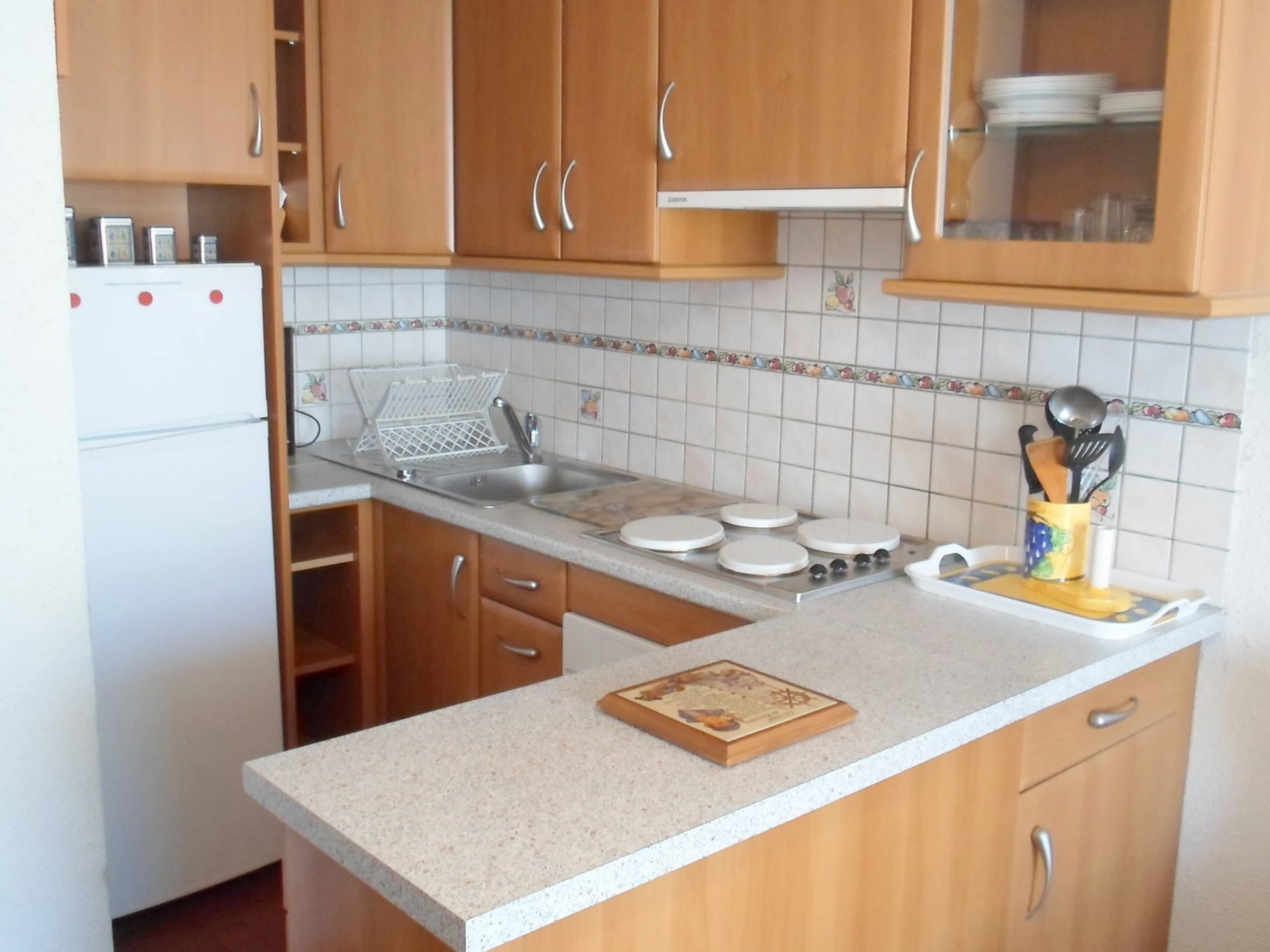 avec plaques électriques, un four traditionnel, un frigo-congélateur. La salle d'eau est avec douche, les toilettes sont séparés. Le coin nuit est avec 1 lit en 140.