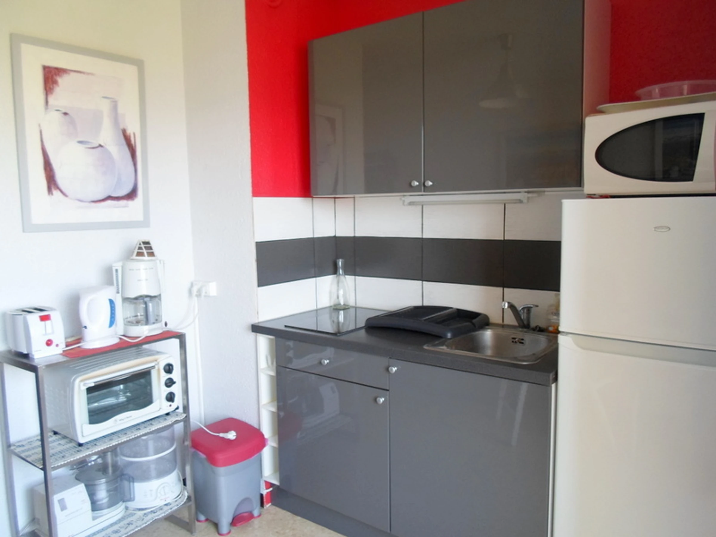 avec plaques vitro-céramique, un frigo-congélateur, un mini-four, un micro-ondes.