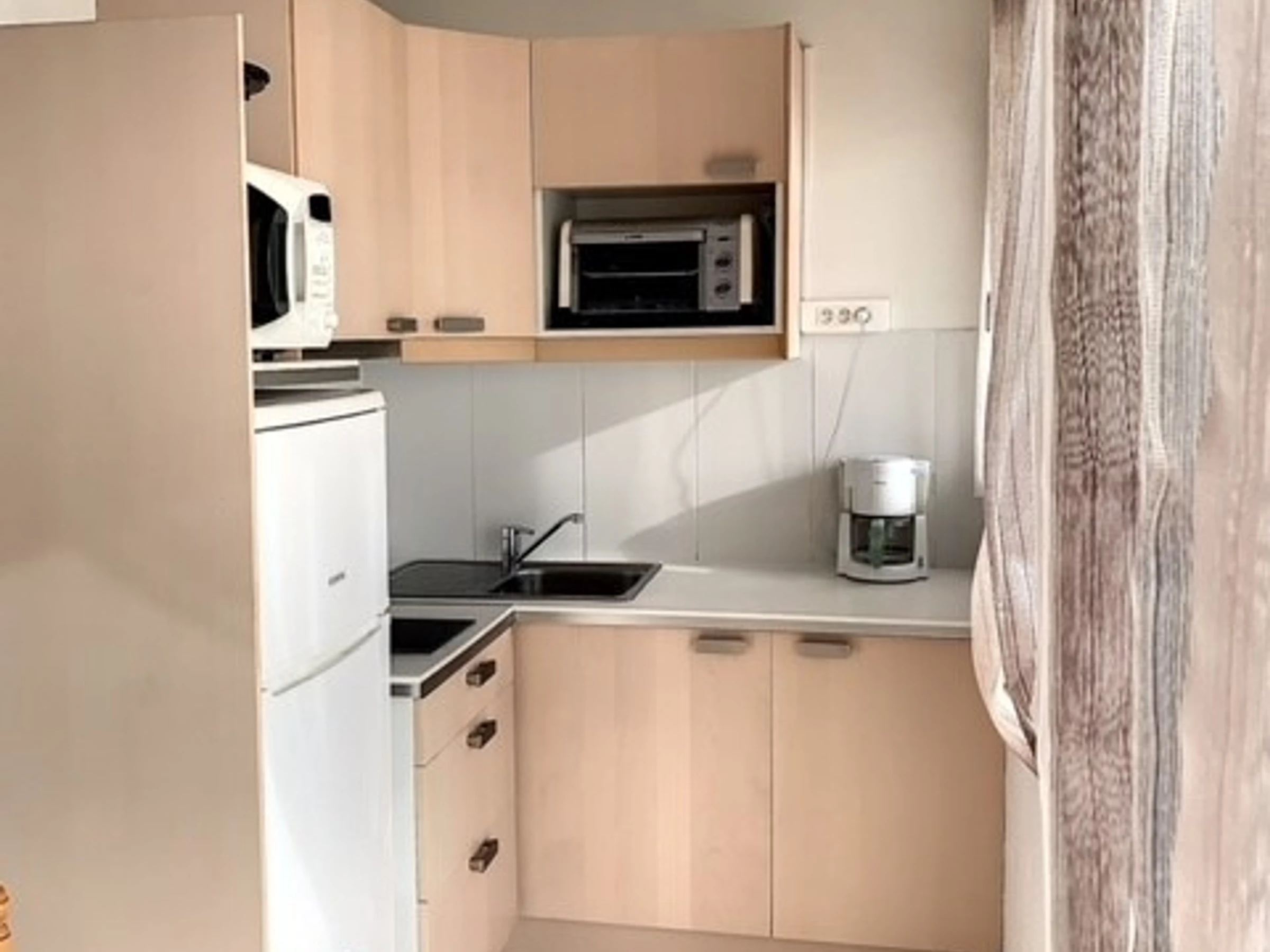 L'espace de vie spacieux comprend un séjour lumineux avec une télévision et un canapé-lit pour plus de flexibilité. La cuisine, entièrement équipée et aménagée avec plaques vitro-céramiques, d'un frigo-congélateur, d'un mini-four et d'un micro-ondes. La salle d'eau moderne est équipée d'une douche et d'une machine à laver, avec des toilettes séparées.
