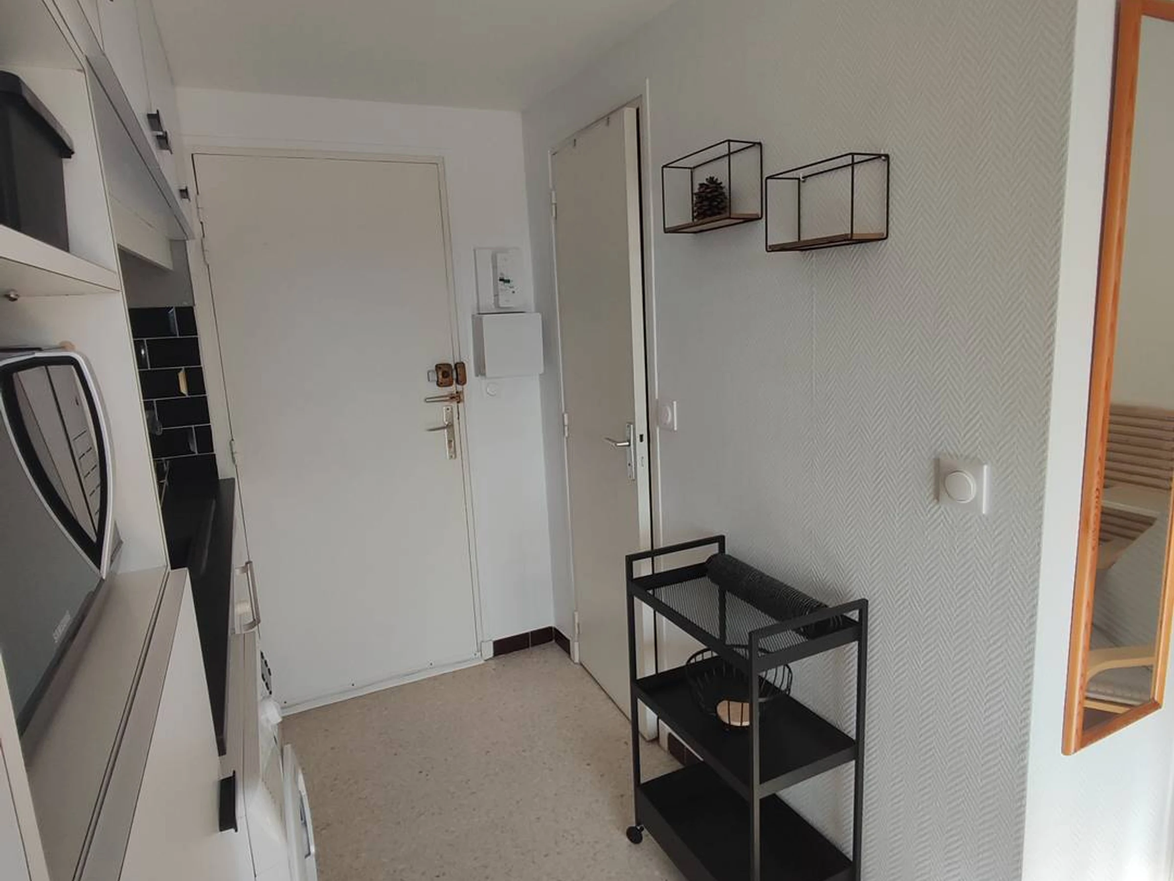 In the Amphitrite residence, a 2-star rated studio apartment located on the 3rd floor with elevator access, offering views of Charles de Gaulle Park and situated a few meters from the thermal baths. This accommodation comprises a living room with a double bed (140 cm) and a wardrobe, an equipped kitchenette, a bathroom with toilet, and a loggia. Amenities include: refrigerator, stovetop, microwave, coffee maker, suitable dishes and utensils, television, washing machine, and air conditioning. Sleeps 2 people. Electricity consumption is extra and will be charged according to the meter reading (at the rate in effect on the day of arrival). This is a non-smoking apartment and is not wheelchair accessible. Pets are not allowed. Orientation: South.