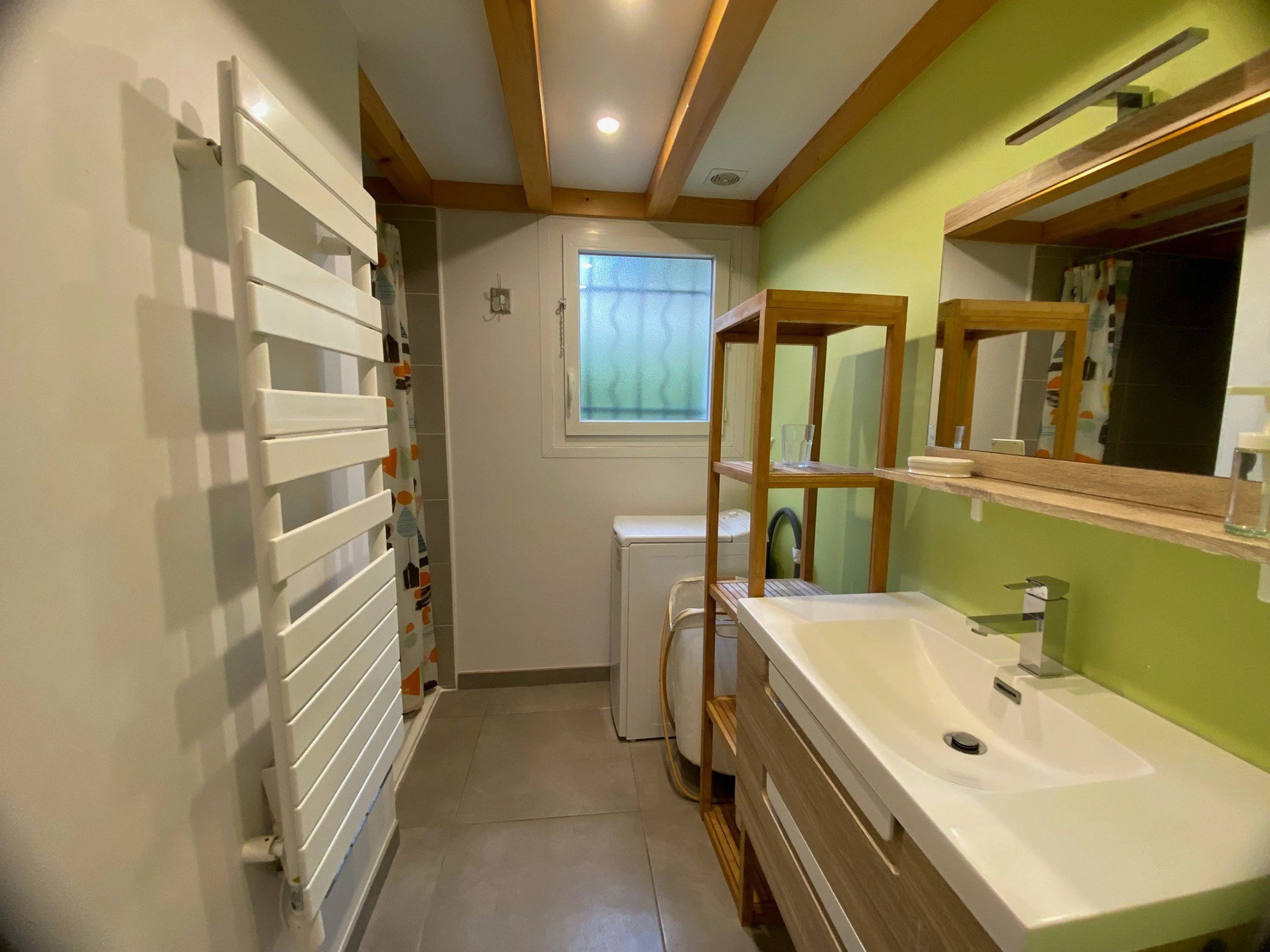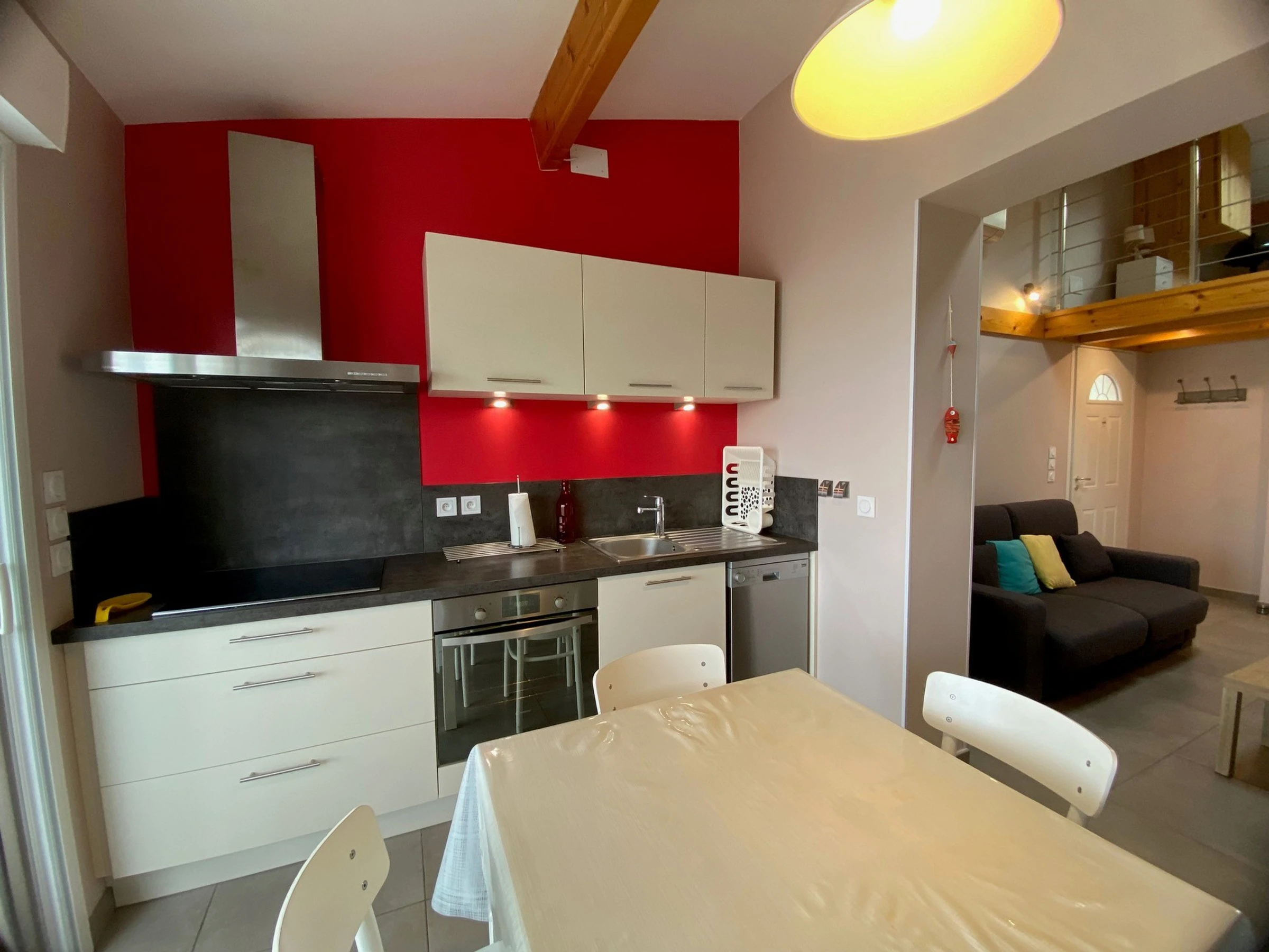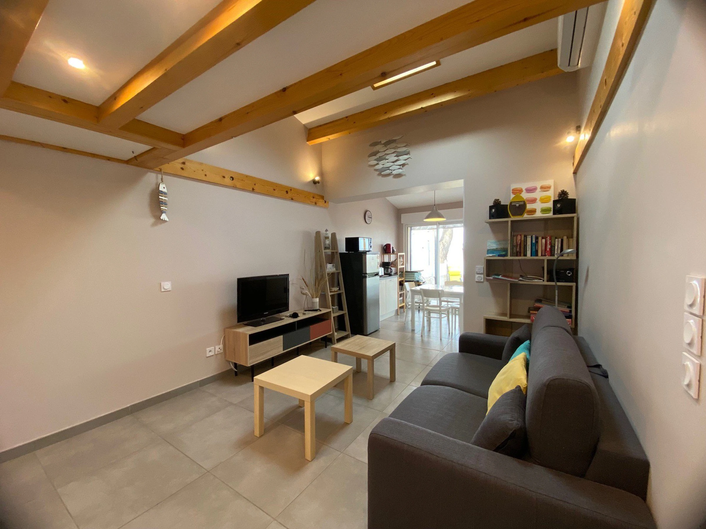 Le séjour accueillant est équipé d'un canapé convertible et d'une télévision à écran plat, avec la climatisation réversible pour votre confort. La véranda abrite une cuisine aménagée et entièrement équipée comprenant une plaque à induction, un micro-ondes, un four, un lave-vaisselle, et un combiné réfrigérateur/congélateur. La chambre dispose d'un lit de 140 cm, et la salle d'eau moderne est équipée d'une douche à l'italienne et d'un lave-linge, avec des toilettes séparées.