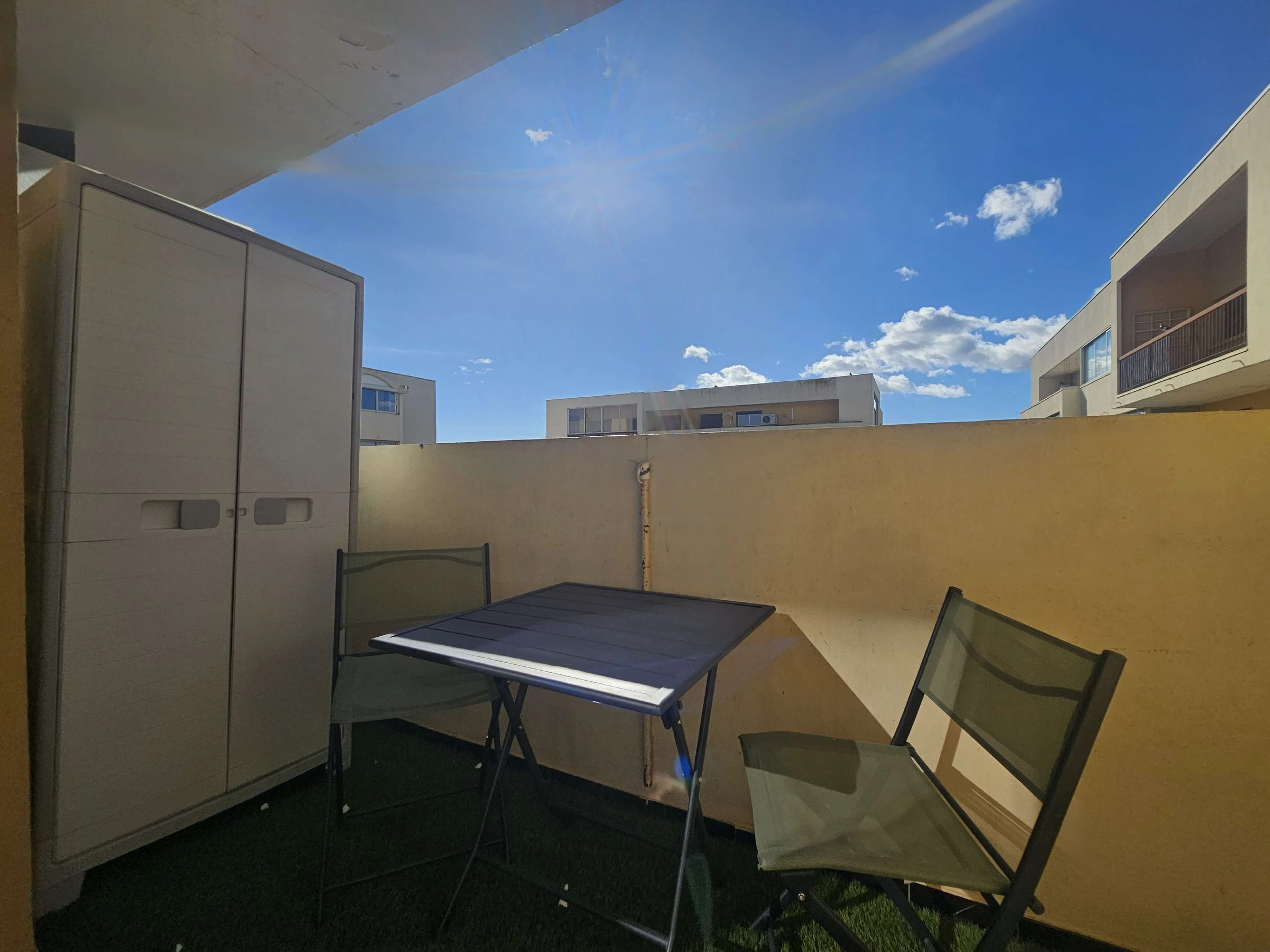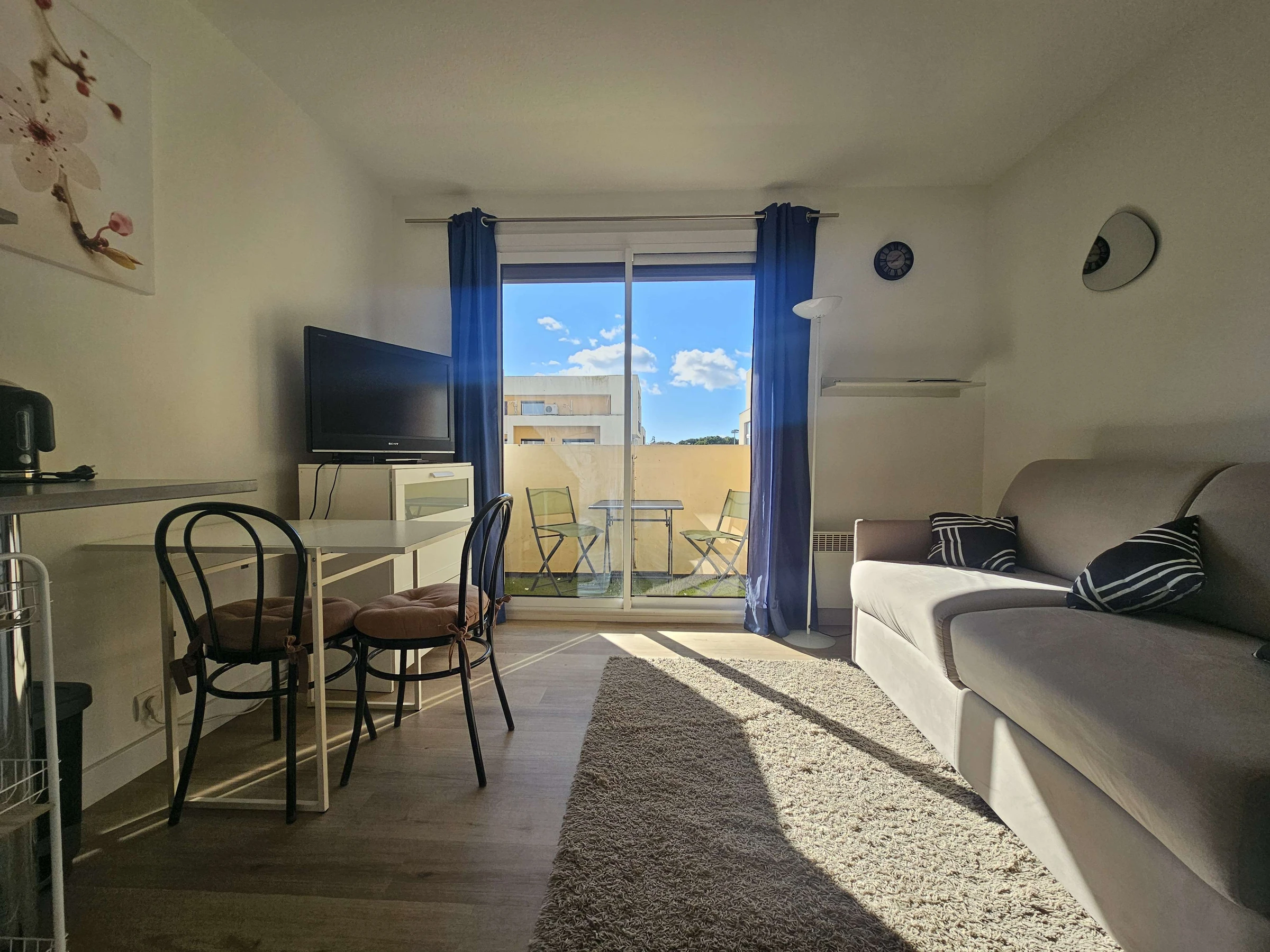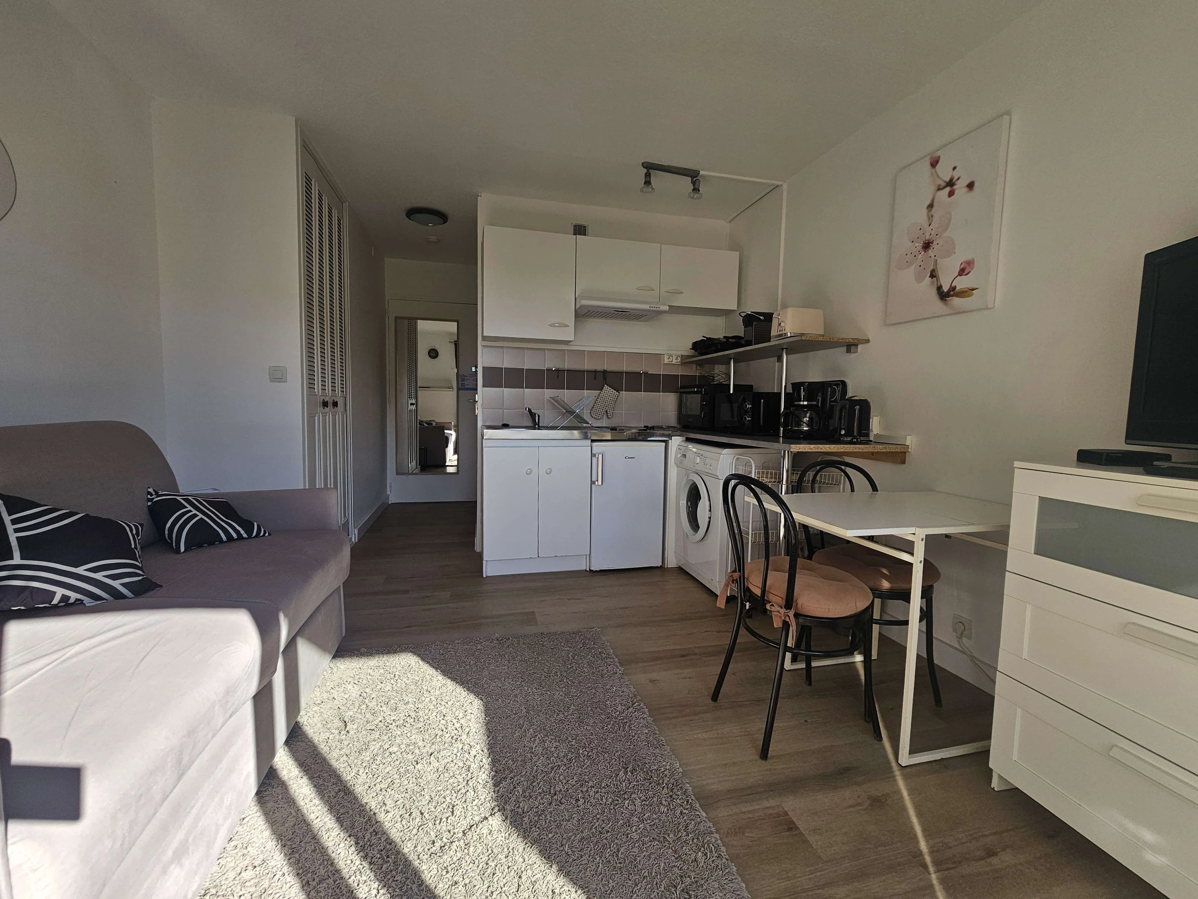 Bright and comfortable studio apartment comprising a lovely living area with a sofa bed opening onto a south-facing balcony, a fully equipped kitchenette, and a bathroom with shower and toilet.
